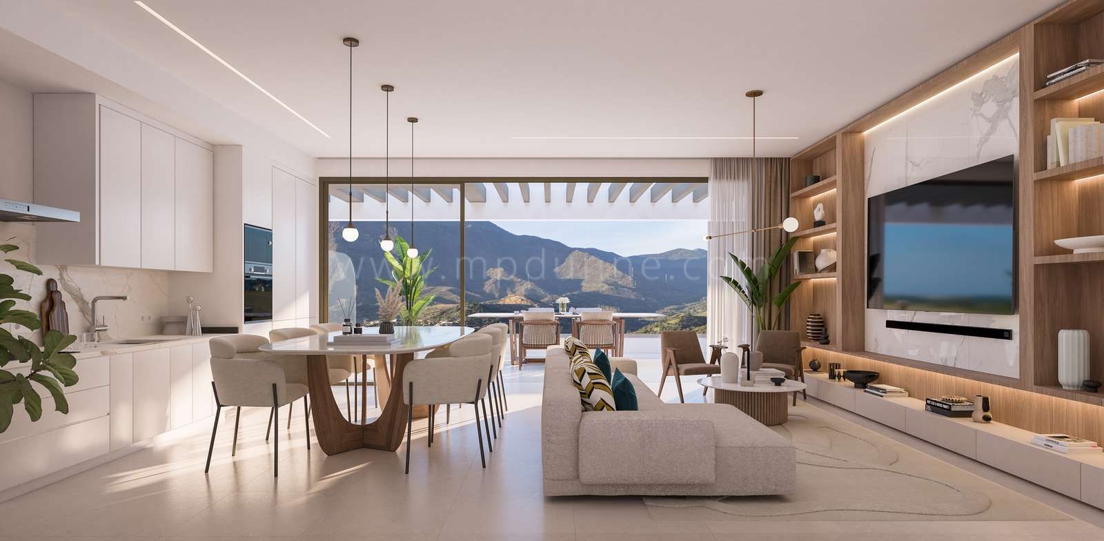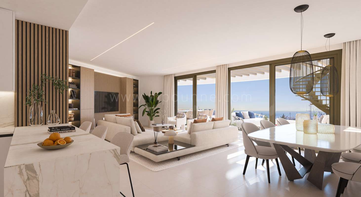 The development offers a range of stylish apartments, from one-bedroom units to spacious three-bedroom homes, designed to suit different lifestyles. Open-plan living rooms and kitchens flow seamlessly onto generous terraces, creating bright, welcoming spaces to enjoy the sea and Sierra Bermeja mountain views. Bedrooms are designed with comfort in mind, offering calm, airy environments with elegant finishes.