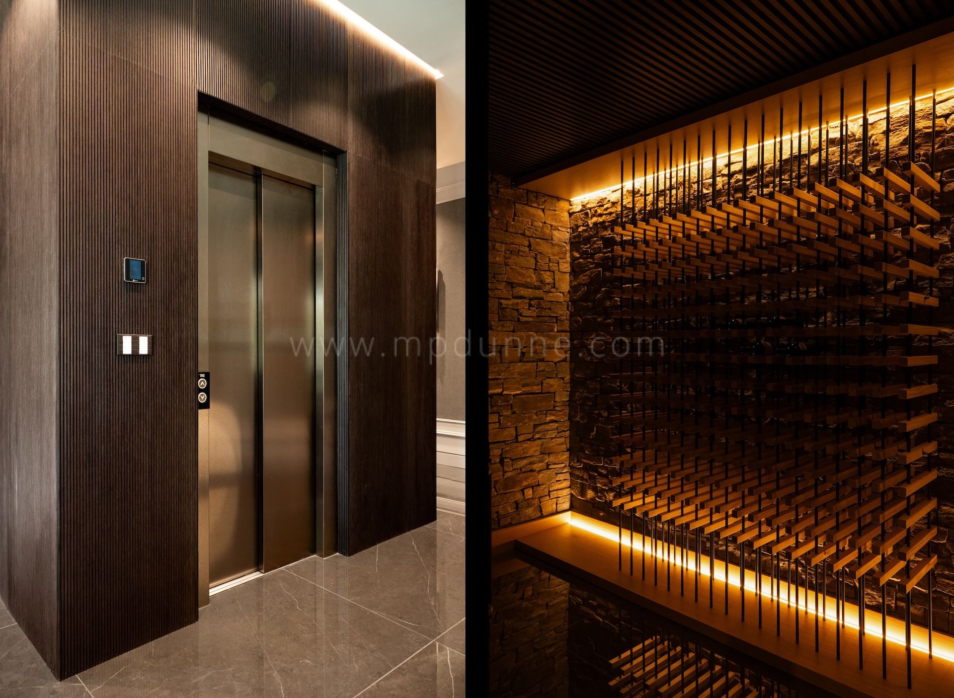 Die Villa befindet sich auf einem eingezäunten Grundstück, umgeben von alten Pinien und üppigem Grün, und erstreckt sich über vier Ebenen, die durch einen champagnergoldenen Aufzug verbunden sind. Der Haupteingang öffnet sich zu einer Halle mit doppelter Höhe, die in offene Wohnräume mit raumhohen Fenstern, holzbetonten Decken und Glasschiebetüren führt, die die Innenräume mit den angelegten Gärten verbinden.