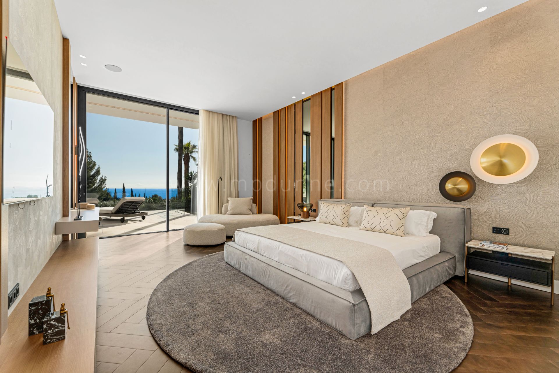 Ein großzügiger Eingangsbereich mit doppelter Deckenhöhe schafft einen eindrucksvollen Empfang und führt in einen weitläufigen Wohnbereich, wo hohe Decken und große Fenster viel Licht und Meerblick bieten. Die Wohnräume sind mit Stil und Komfort gestaltet, einschließlich Wohnbereich, Esszimmer und einer Modulnova-Küche mit Gaggenau-Geräten. Eine separate Serviceküche und die Außenküche mit Grill ermöglichen diskrete und komfortable Bewirtung.