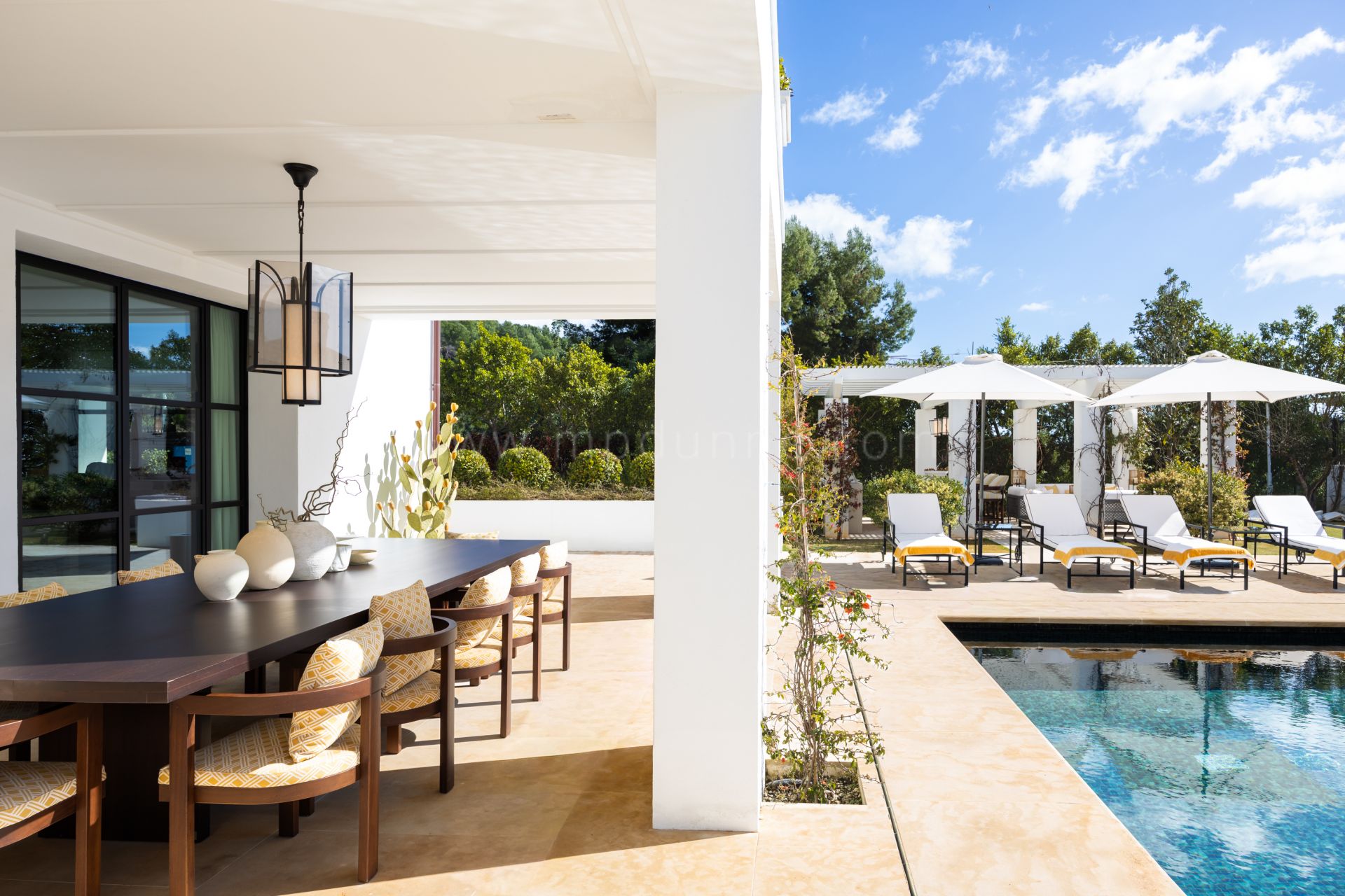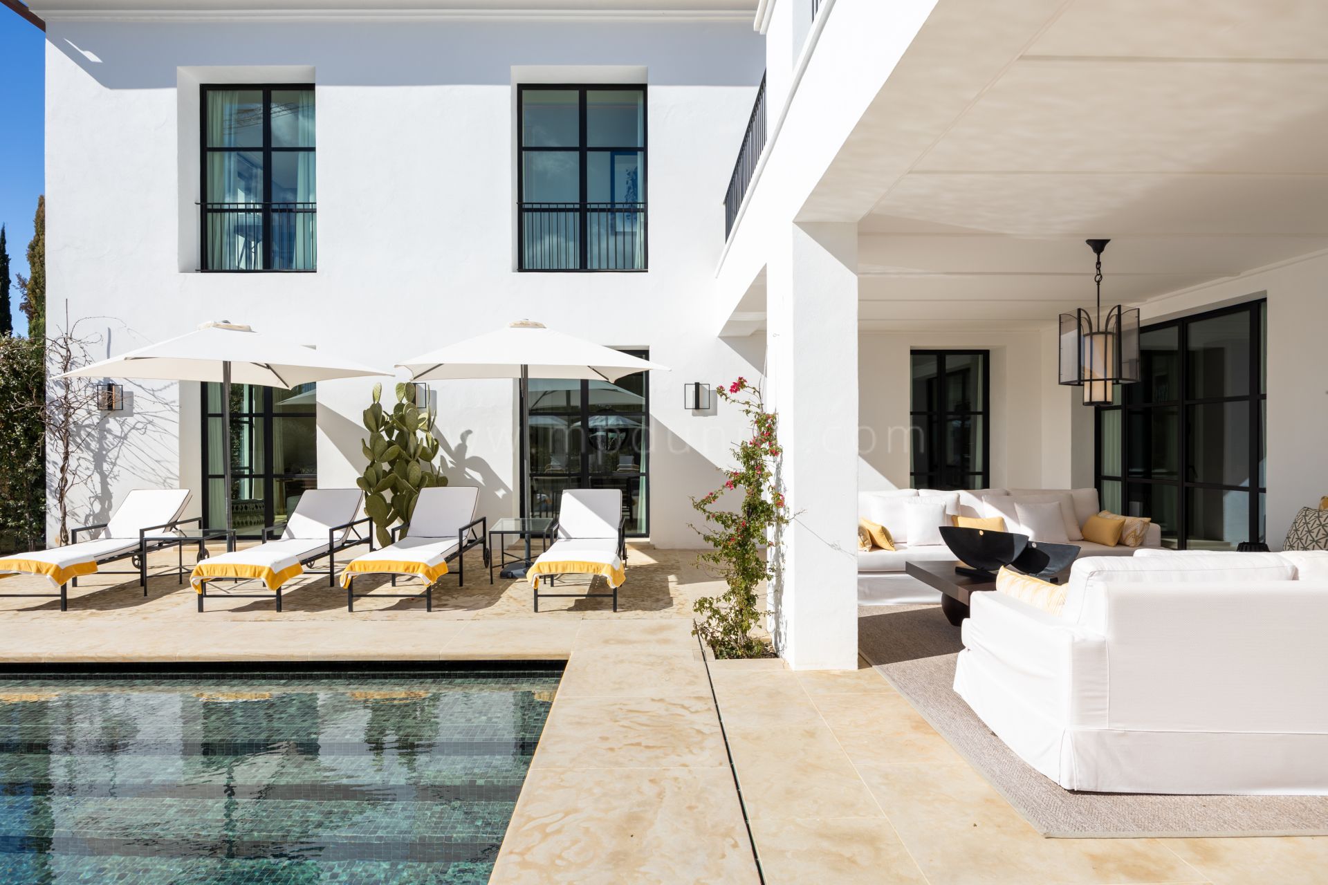 Im Inneren bietet das Haus großzügige, lichtdurchflutete Räume, die sich nahtlos zu den Terrassen öffnen und eine fließende Verbindung zwischen Innen- und Außenbereichen schaffen. Maßgefertigte Möbel und sorgfältig ausgewählte Dekoration verleihen jedem Raum ein elegantes und anspruchsvolles Ambiente, während die oberen Terrassen den perfekten Rahmen bieten, um den Blick auf das Mittelmeer zu genießen.