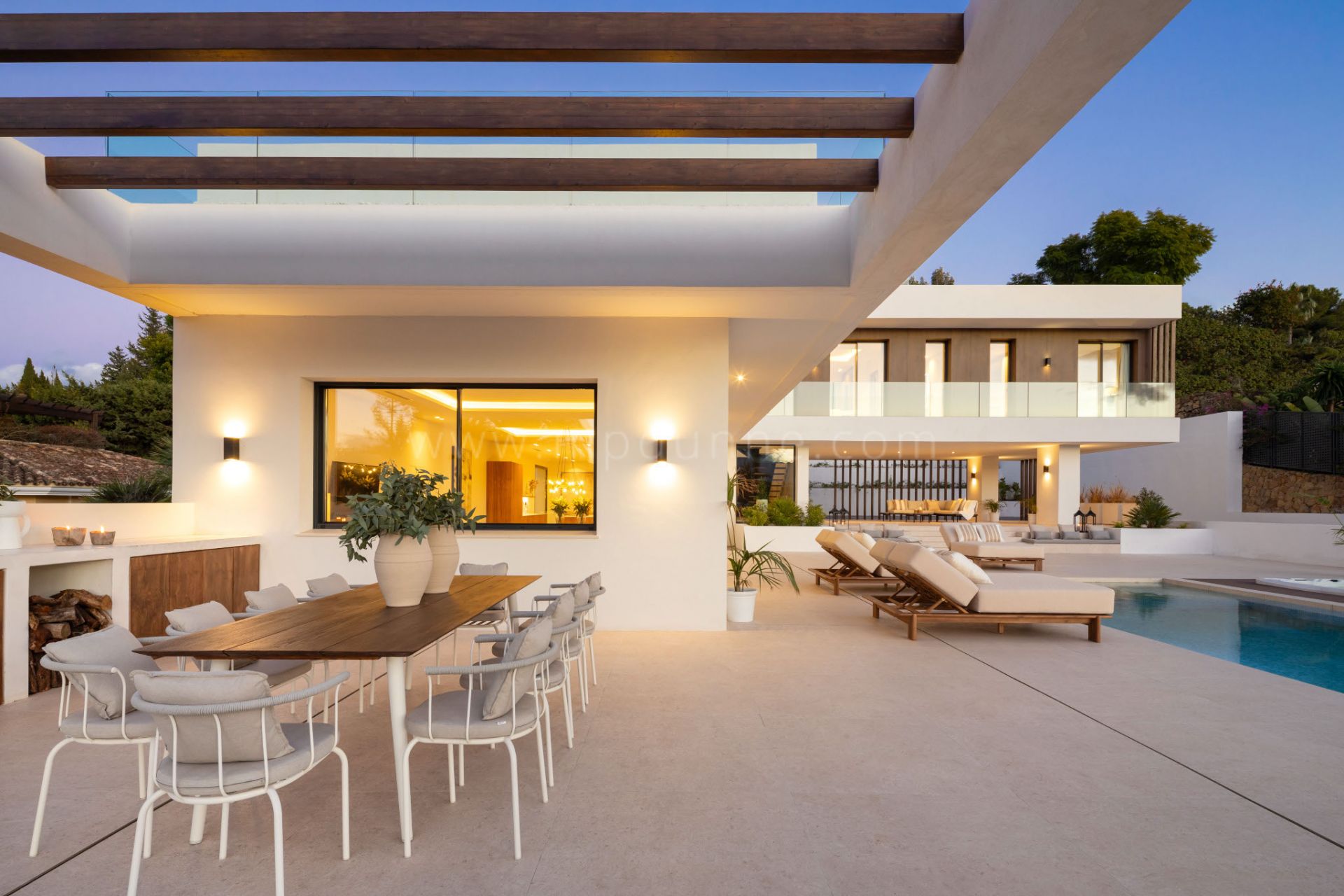 Die Aussenbereiche sind zentraler Bestandteil des Wohnkonzepts. Grosszügige, teilweise überdachte Terrassen umgeben Pool und Jacuzzi und schaffen verschiedene Zonen für Essen, Entspannen und Abendstunden im Freien. Eine Feuerstelle auf der oberen Terrasse setzt einen besonderen Akzent bei Sonnenuntergang, während die Aussenküche das Bewirten erleichtert. Das Haus wurde insgesamt pflegeleicht geplant und eignet sich sowohl als Hauptwohnsitz als auch als Ferienimmobilie.