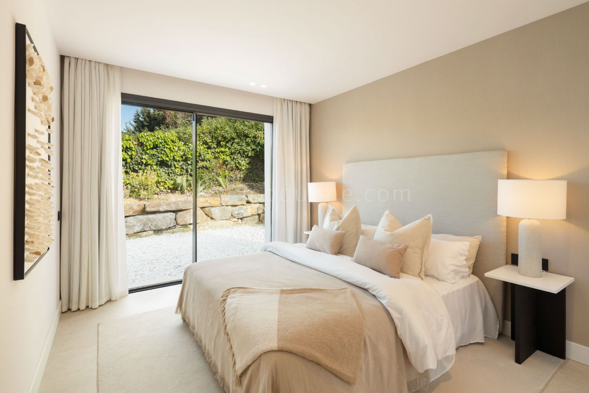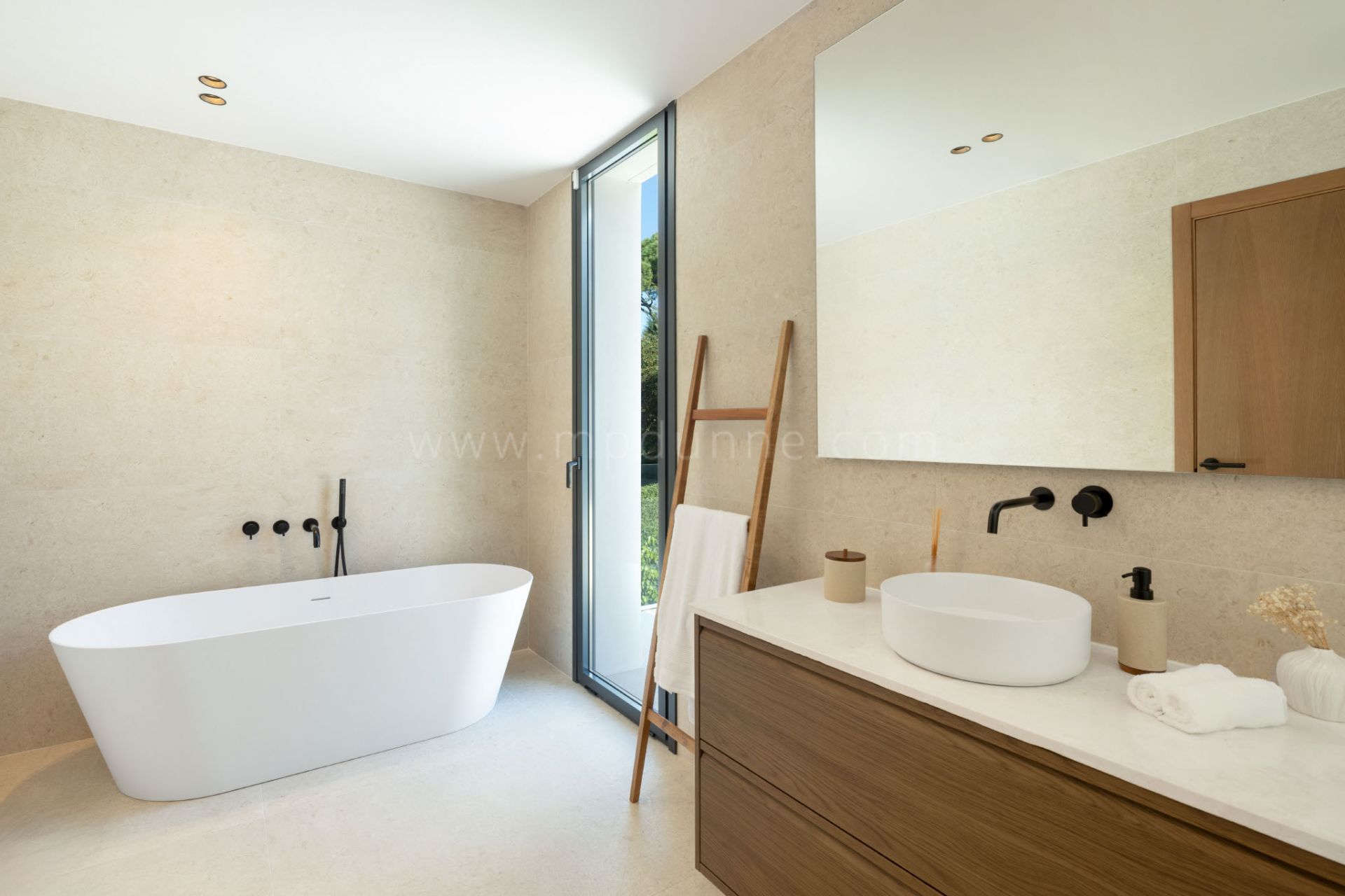 Die Immobilie verfügt über fünf Schlafzimmer mit Bad en suite, drei im Obergeschoss und zwei auf der Hauptebene. Zwei zusätzliche Gäste-WCs ergänzen die Wohnbereiche. Die Hauptsuite bietet direkten Zugang zu den Aussenflächen und unterstreicht das durchgängige Innen-Aussen-Konzept.