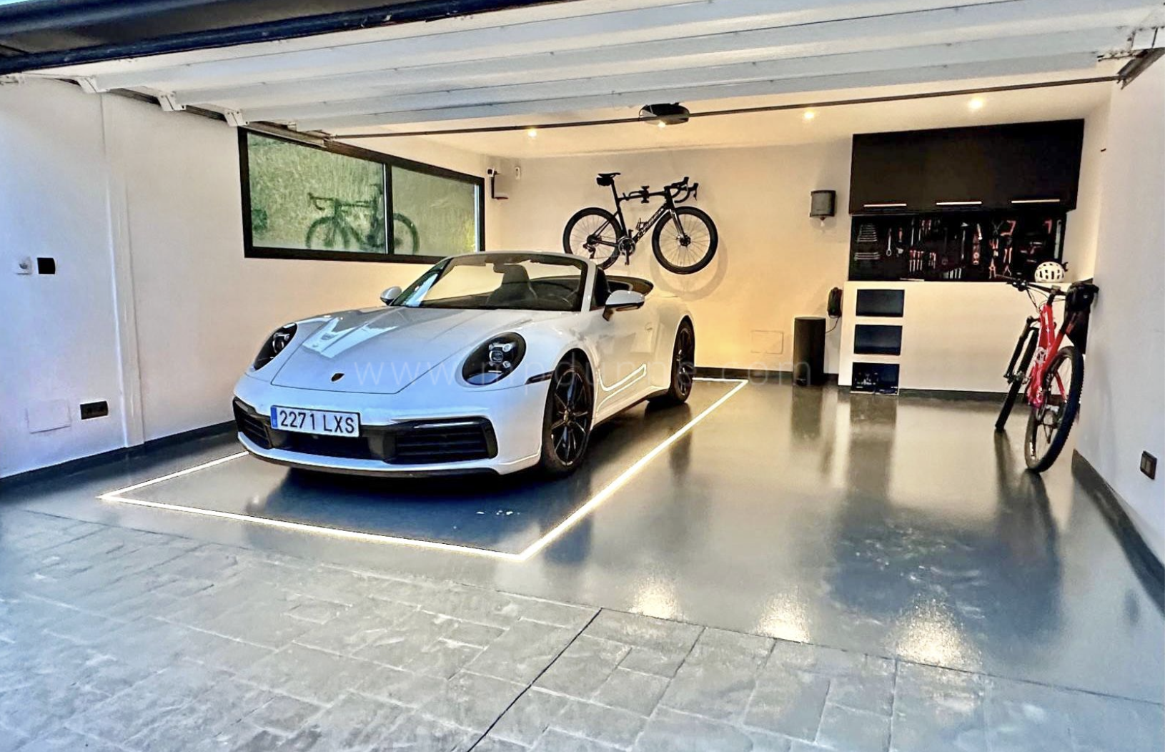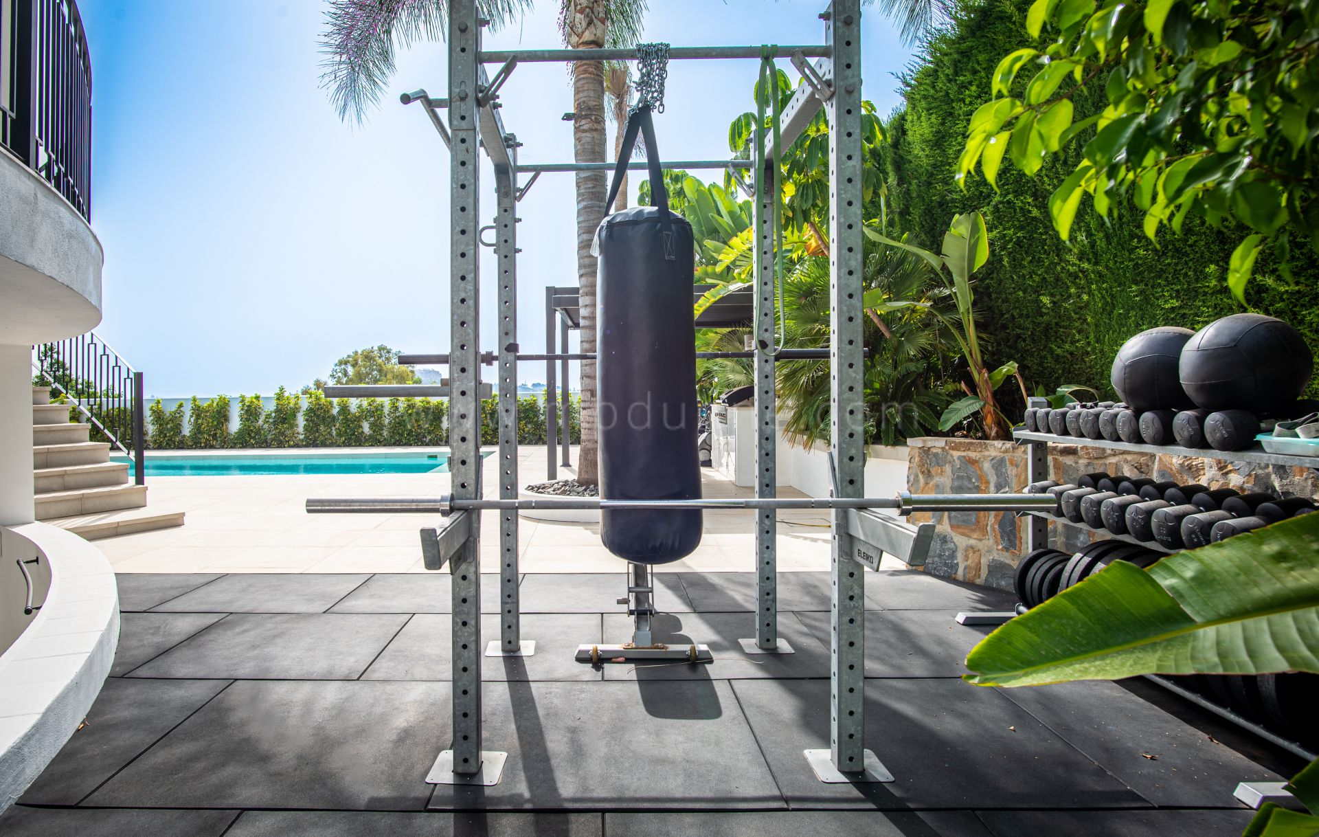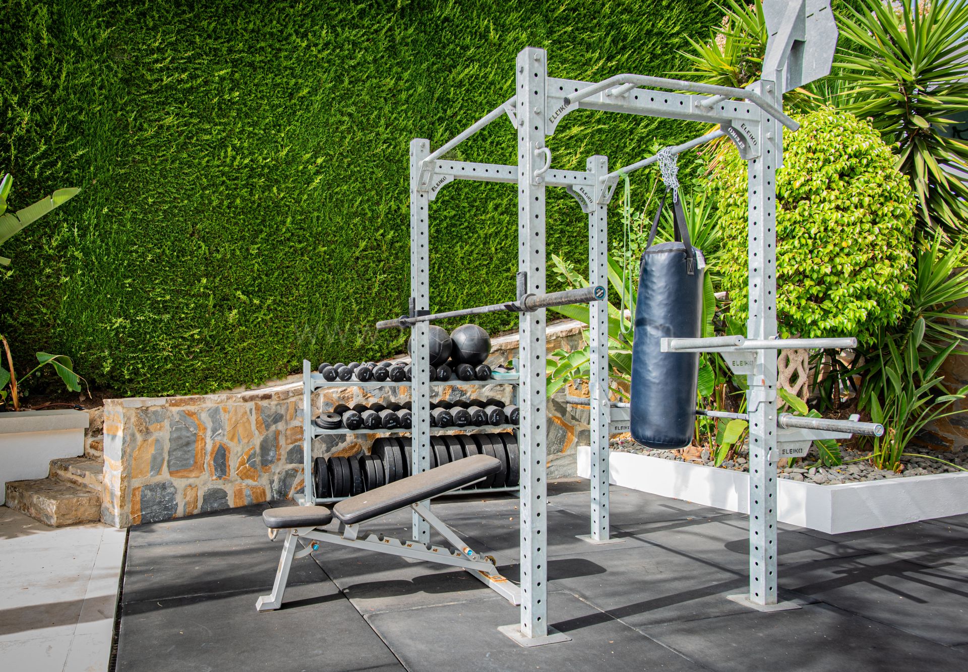Im Außenbereich ermöglicht die Immobilie ein vollwertiges mediterranes Lebensgefühl. Ein privater Garten umgibt den Pool, ergänzt durch eine voll ausgestattete Außenküche und einen Fitnessbereich. Eine Garage für zwei Autos bietet sicheren Parkplatz und zusätzlichen Stauraum.