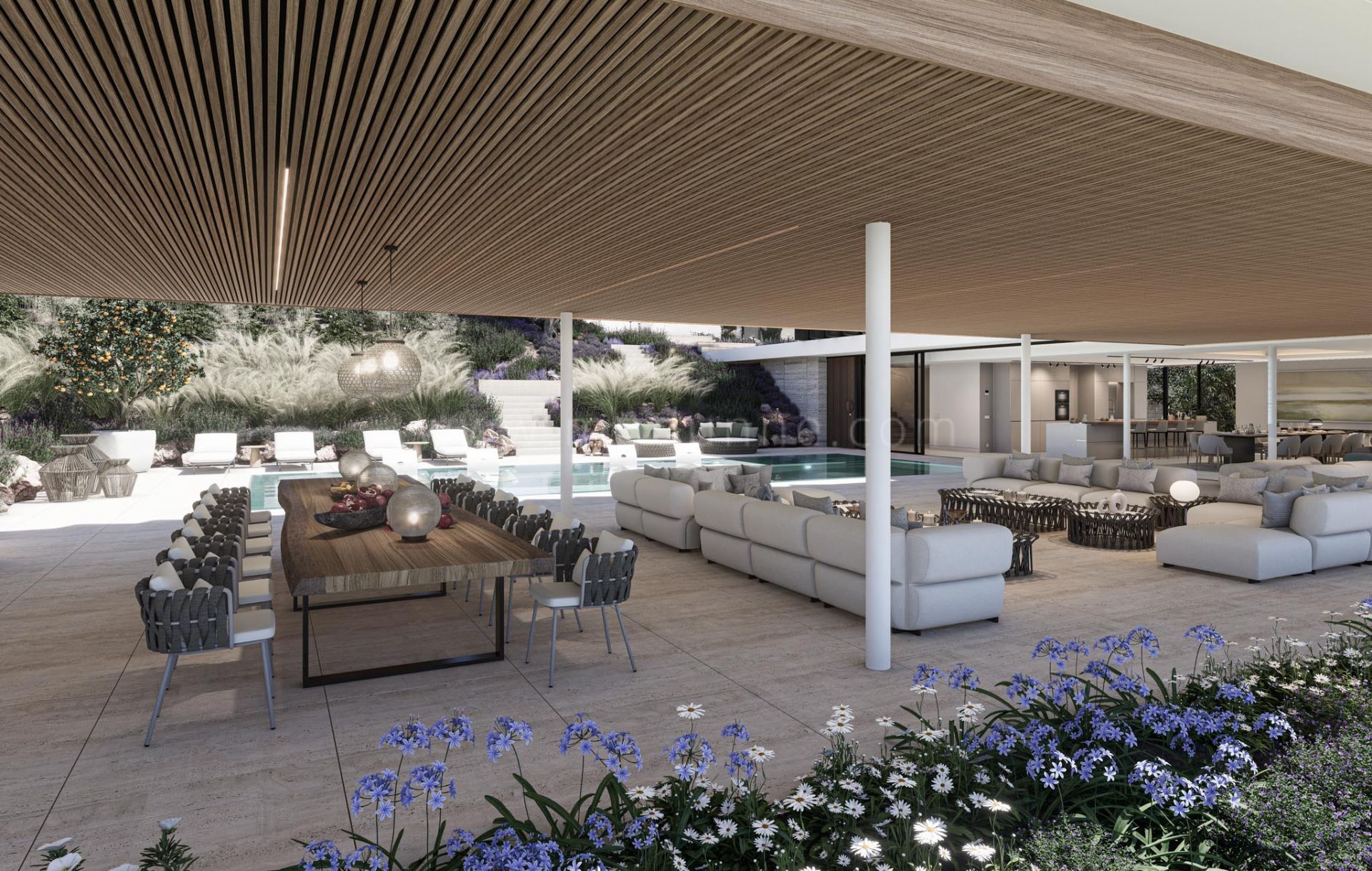 Der Außenbereich wurde sorgfältig gestaltet, um Sonne und Schatten im Laufe des Jahres auszugleichen und zu jeder Jahreszeit höchsten Wohnkomfort zu bieten. Villa Lago vereint modernes Design, natürliche Schönheit und den einzigartigen Lebensstil von Sotogrande.