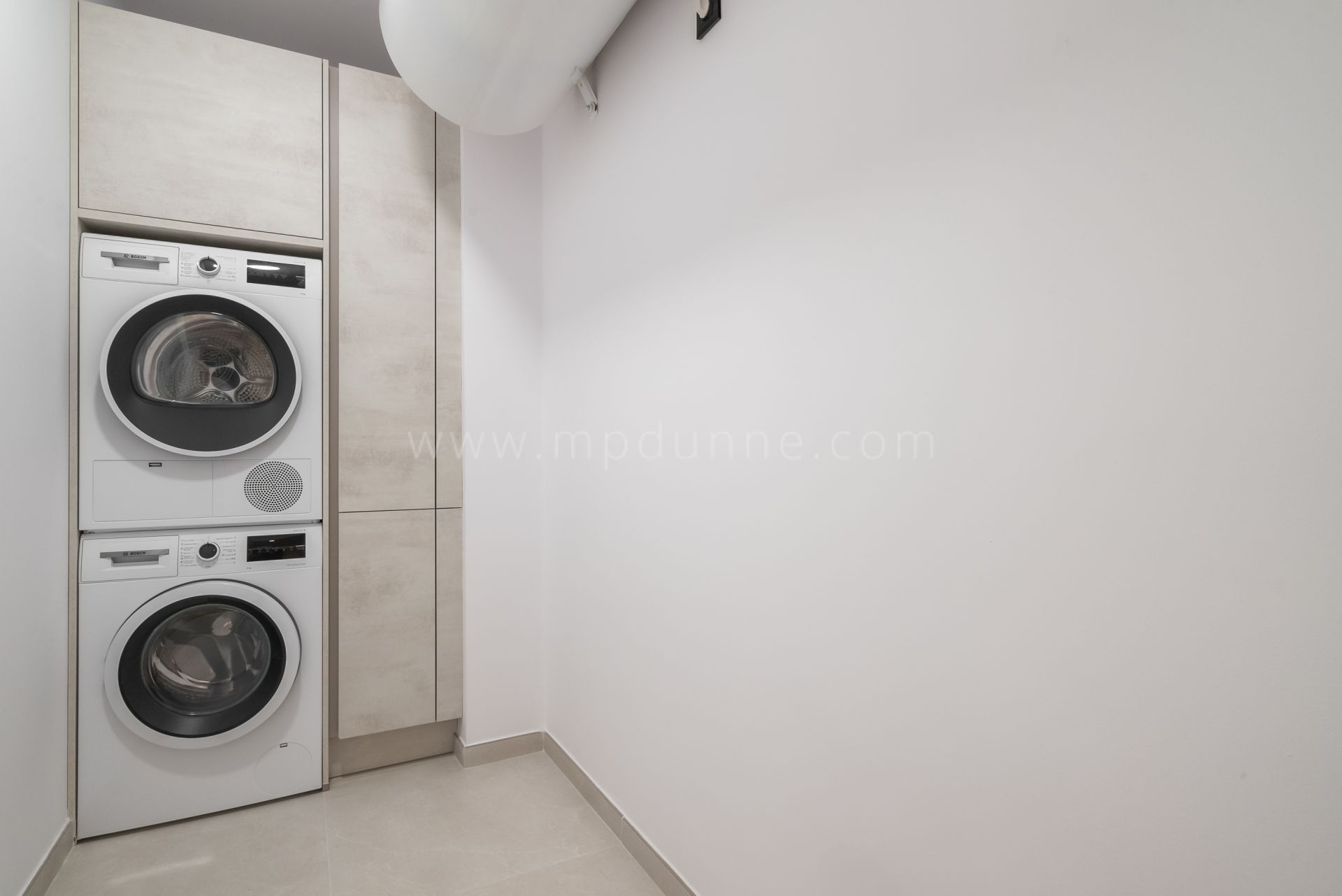 Die Wohnung verfügt über insgesamt 220 m², darunter eine südwestlich ausgerichtete Terrasse mit fünfundvierzig Quadratmetern und integrierter Außenküche. Die Raumaufteilung umfasst eine offene Küche mit Wohnbereich, einen separaten Hauswirtschaftsraum und vier Doppelschlafzimmer, drei davon mit eigenem Bad. Die Hauptsuite bietet einen begehbaren Kleiderschrank und ein eigenes Badezimmer.