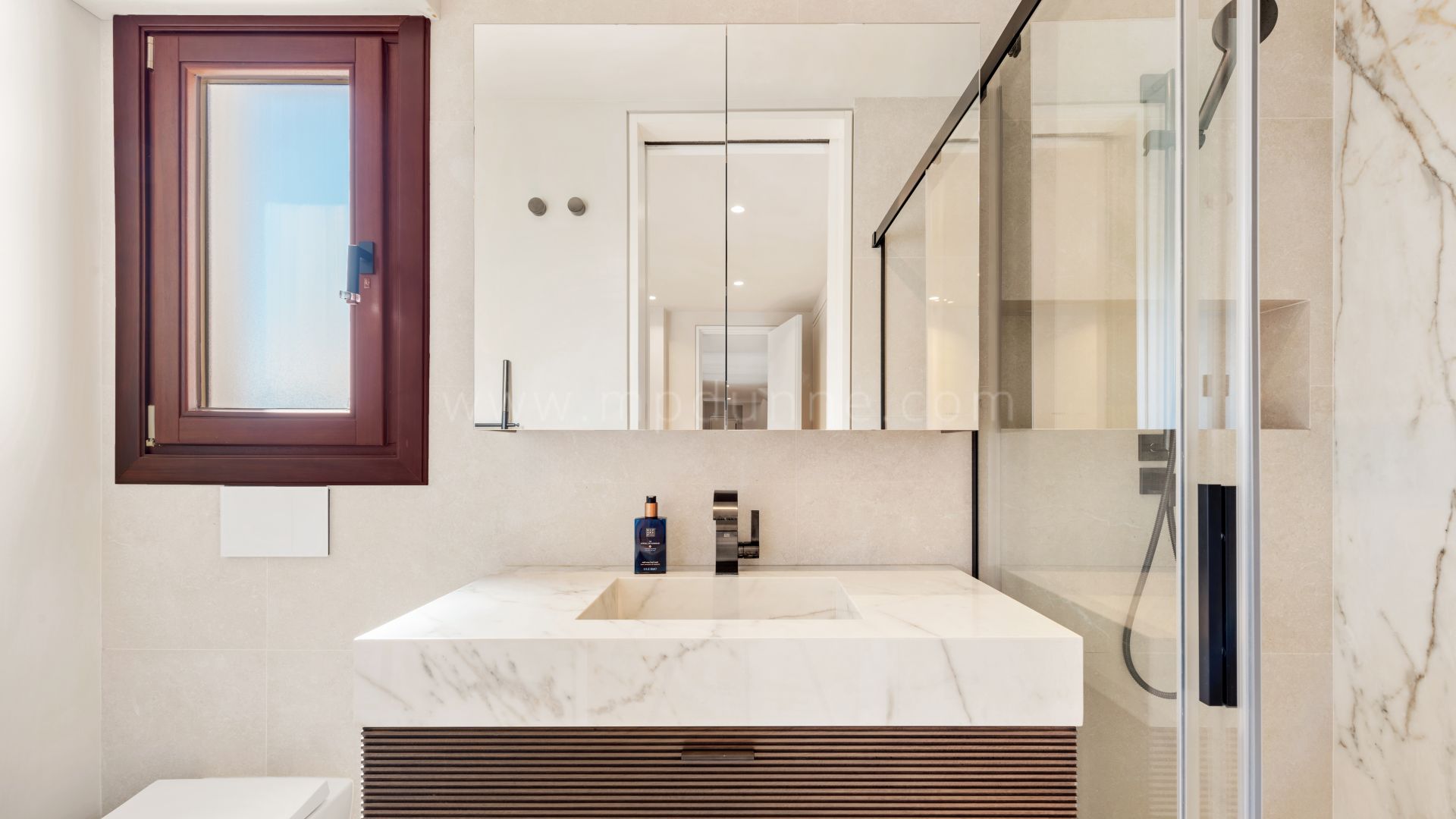 Im Inneren sorgen ruhige Farbtöne und hochwertige Materialien für eine moderne, ausgewogene Atmosphäre. Das Hauptschlafzimmer verfügt über ein eigenes Bad und einen Ankleidebereich, während die weiteren Schlafzimmer jeweils über ein eigenes Bad und Zugang zur Terrasse verfügen. Im Obergeschoss befindet sich eine großzügige Dachterrasse – perfekt zum Sonnenbaden, Entspannen oder um den Sonnenuntergang zu genießen.
