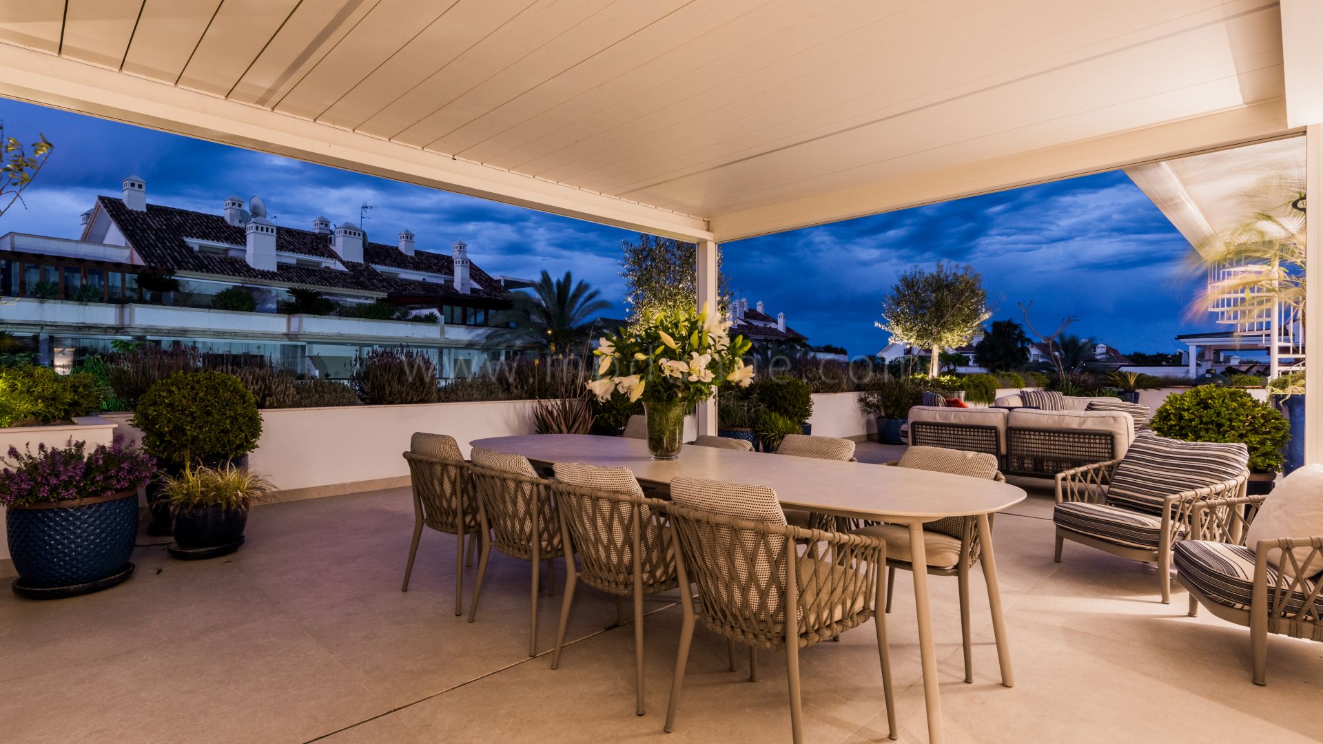 Der Eingangsbereich führt in einen hellen, offenen Wohn- und Essbereich. Die SIEMATICKüche, ausgestattet mit modernsten Miele-Geräten und einer stilvollen Kochinsel, geht fließend in den Ess und Wohnraum über, der auf eine großzügige Hauptterrasse führt – ideal für das ganze Jahr. Der Außenbereich bietet verschiedene Sitz- und Essbereiche, teils überdacht durch eine automatische Pergola, mit Blick auf den ikonischen La Concha-Berg und die gepflegten Gärten der Anlage.