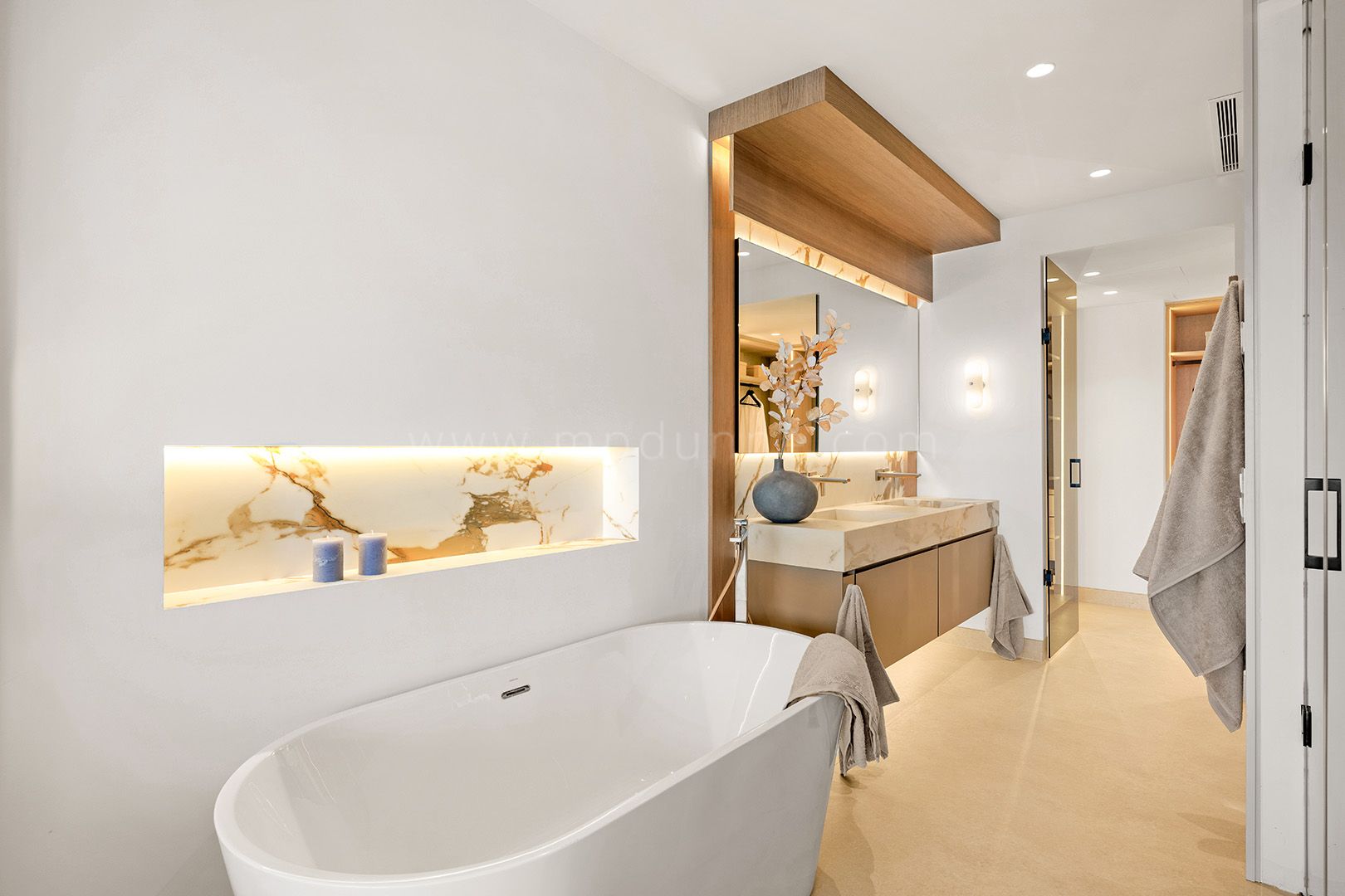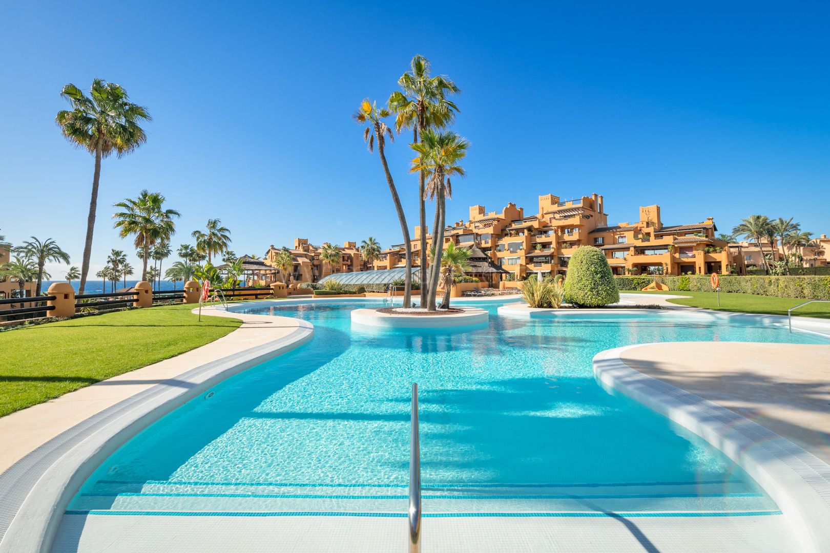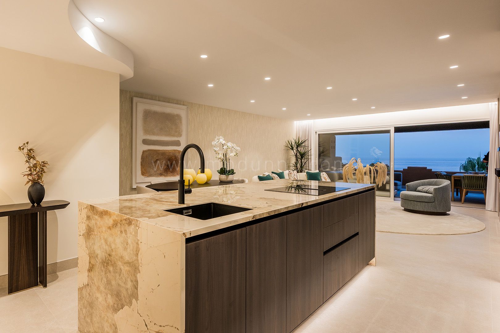 Komplett renovierte Wohnung in der exklusiven Wohnanlage Los Granados del Mar an der Neuen Goldenen Meile. Direkt am Strand gelegen und nach Süden ausgerichtet, bietet sie hochwertige Ausstattungen und einen direkten Meerblick.