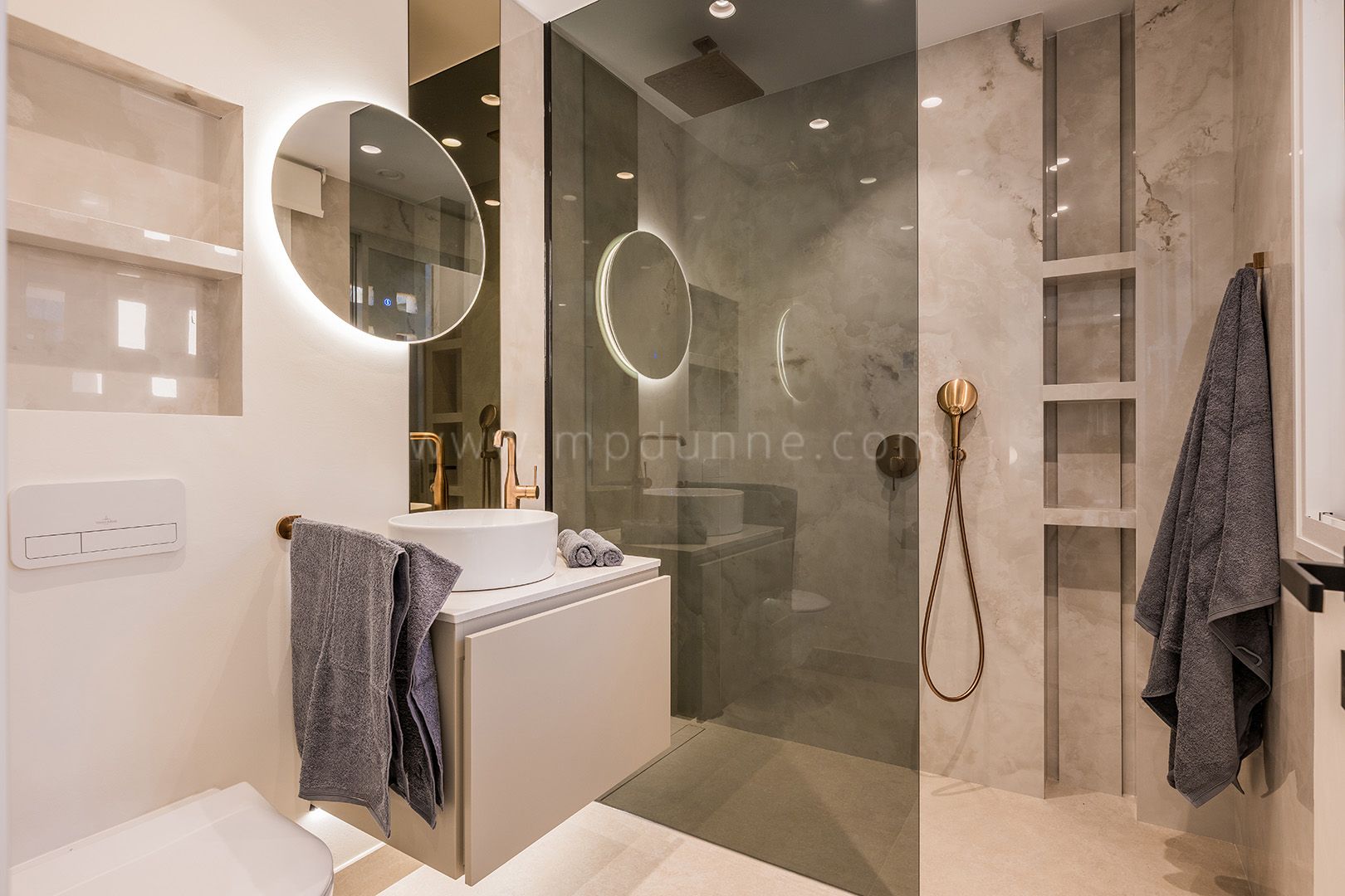 Das Wohnzimmer öffnet sich auf eine große Terrasse mit 49 m², ideal zur Entspannung mit Blick auf das Mittelmeer. Auch die Hauptsuite hat Zugang zur Terrasse und verfügt über ein Ankleidezimmer sowie ein eigenes Bad.