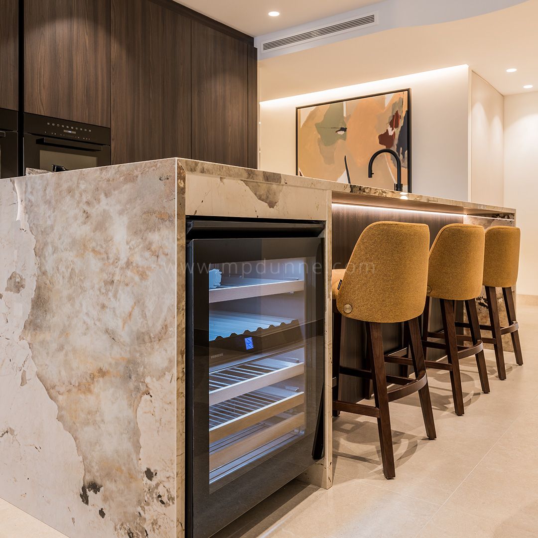 Die offene Küche ist mit hochwertigen deutschen Geräten ausgestattet und bietet eine zusätzliche Vorbereitungsfläche. Ein privates Büro, Bang & Olufsen Soundsystem und moderne Akzente ergänzen die Ausstattung.