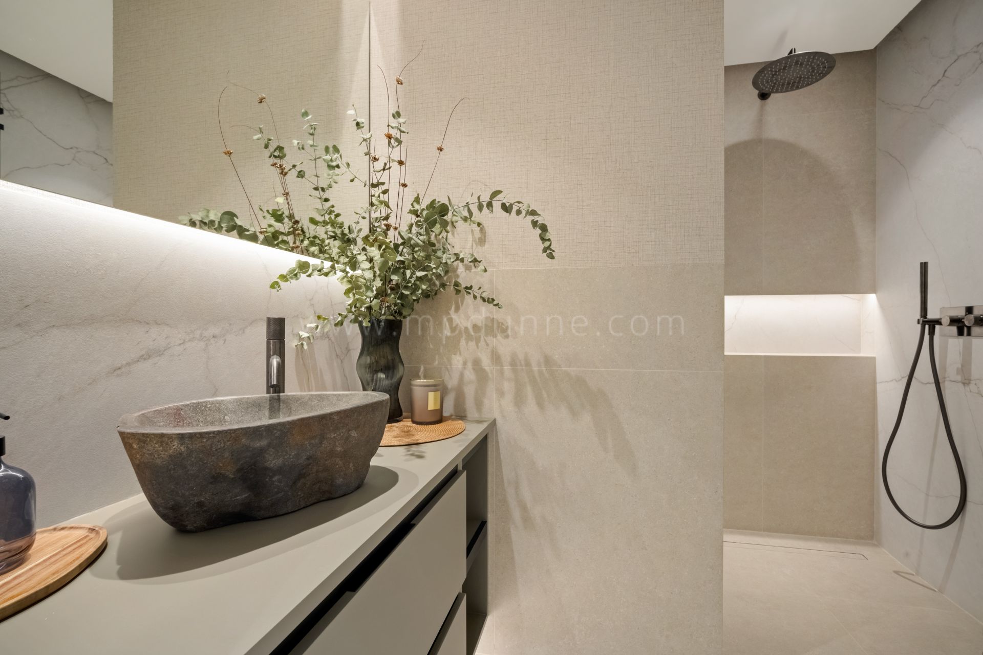 Das Interieur wurde in einem modernen, ausgewogenen Stil neu gestaltet und zeichnet sich durch maßgefertigte Details sowie eine sorgfältige Auswahl hochwertiger Materialien aus. Der offen gestaltete Wohnbereich verbindet Wohnzimmer, Essbereich und Küche zu einem hellen und funktionalen Raum mit integrierter Beleuchtung und klaren architektonischen Linien. Die moderne Küche ist vollständig mit hochwertigen Geräten ausgestattet und bietet großzügigen Stauraum.