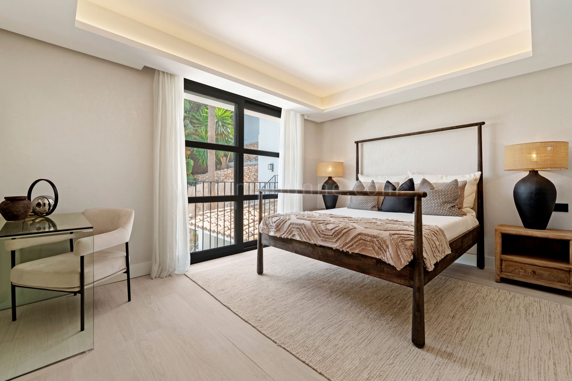 Großzügige offene Wohnbereiche führen auf sonnige Terrassen, ideal für Unterhaltung oder entspanntes Familienleben. Die Gourmetküche, lichtdurchflutet, dient sowohl als funktionaler als auch als geselliger Mittelpunkt, während die Innenräume Raffinesse und Wärme mit neutralen Farbtönen, natürlichen Texturen und maßgefertigten Möbeln verbinden. Eingebaute Regale, handgefertigte Beleuchtung und sorgfältig ausgewählte Dekorationen verleihen Charakter, während große Fenster reichlich Tageslicht in das gesamte Haus lassen.