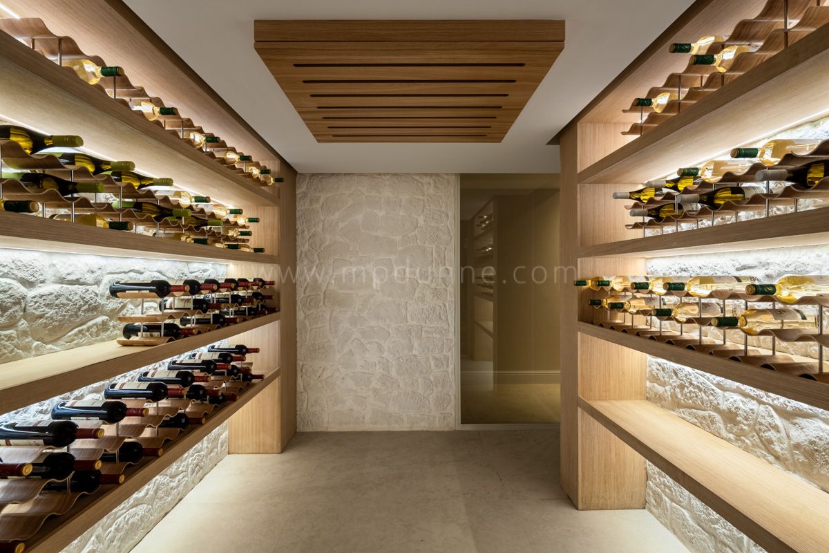 Im Inneren verfügt die Villa über helle, offene Wohnbereiche mit hohen Decken und sanften neutralen Farbtönen, die eine ruhige und elegante Atmosphäre schaffen. Mehrere Lounges bieten vielseitige Bereiche zum Entspannen oder Empfangen von Gästen, während die maßgefertigte Küche ein stilvolles Zentrum für den Alltag bildet. Ein privates Heimkino, Weinkeller und ein voll ausgestattetes Fitness- und Spa-Bereich verstärken Komfort und Luxus des Hauses.