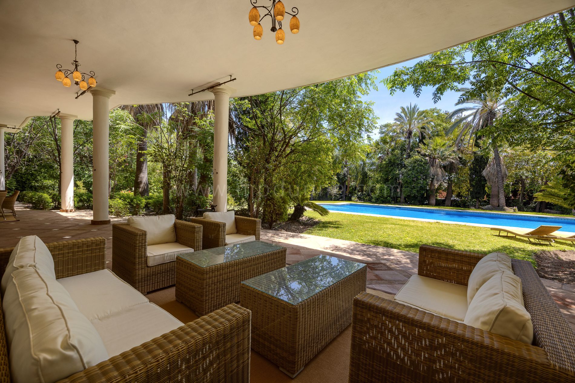 Die Immobilie erstreckt sich über drei Ebenen. Im Hauptgeschoss befinden sich lichtdurchflutete Empfangsräume, die sich zu großzügigen Terrassen und gepflegten Gärten öffnen und so einen fließenden Übergang zwischen Innen- und Außenbereichen schaffen. Die obere Etage ist der prächtigen Hauptsuite gewidmet, ausgestattet mit zwei Bädern, Ankleidezimmern und einer privaten Terrasse. Ergänzt wird sie durch weitere Gästesuiten, jeweils mit eigenem Außenbereich.