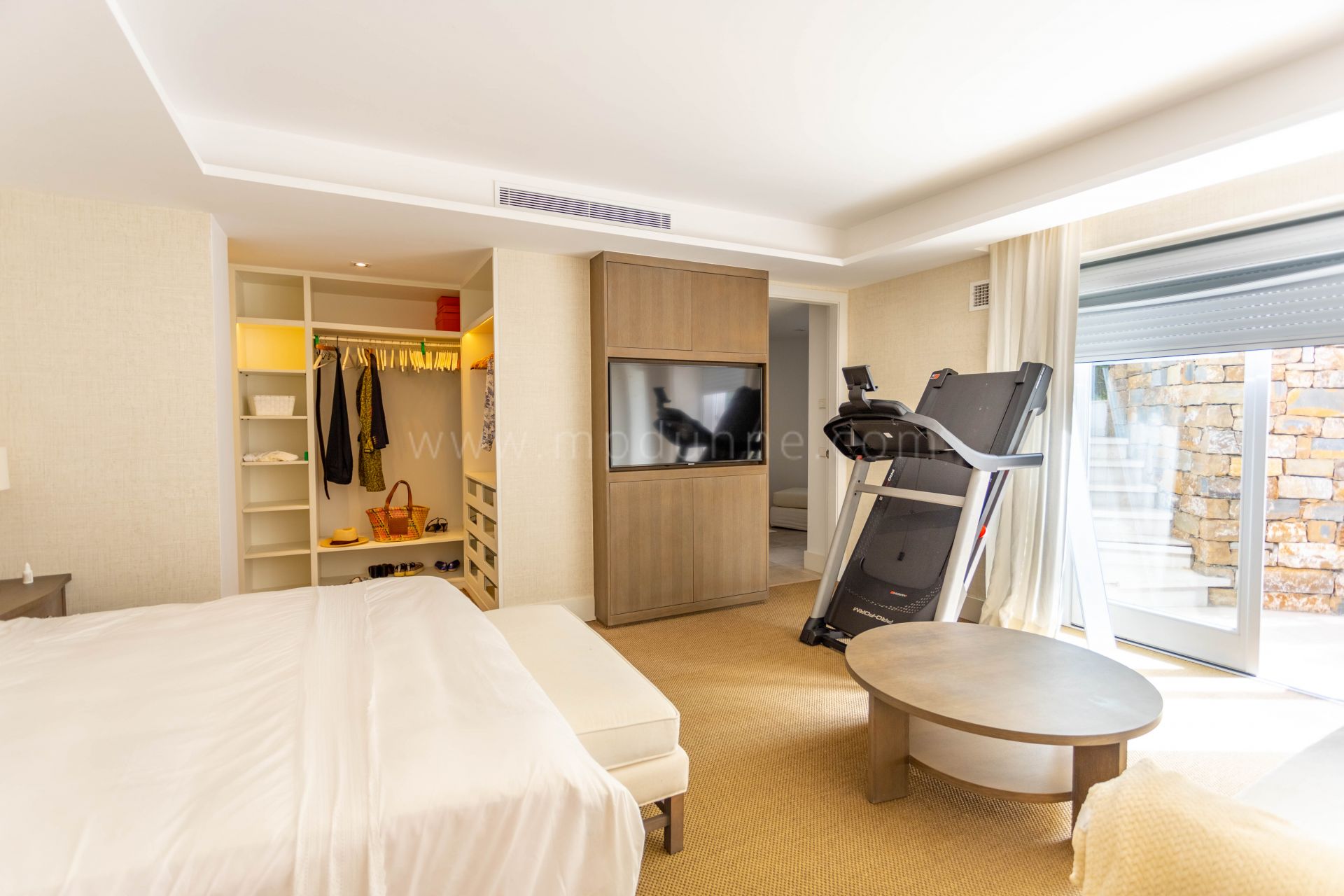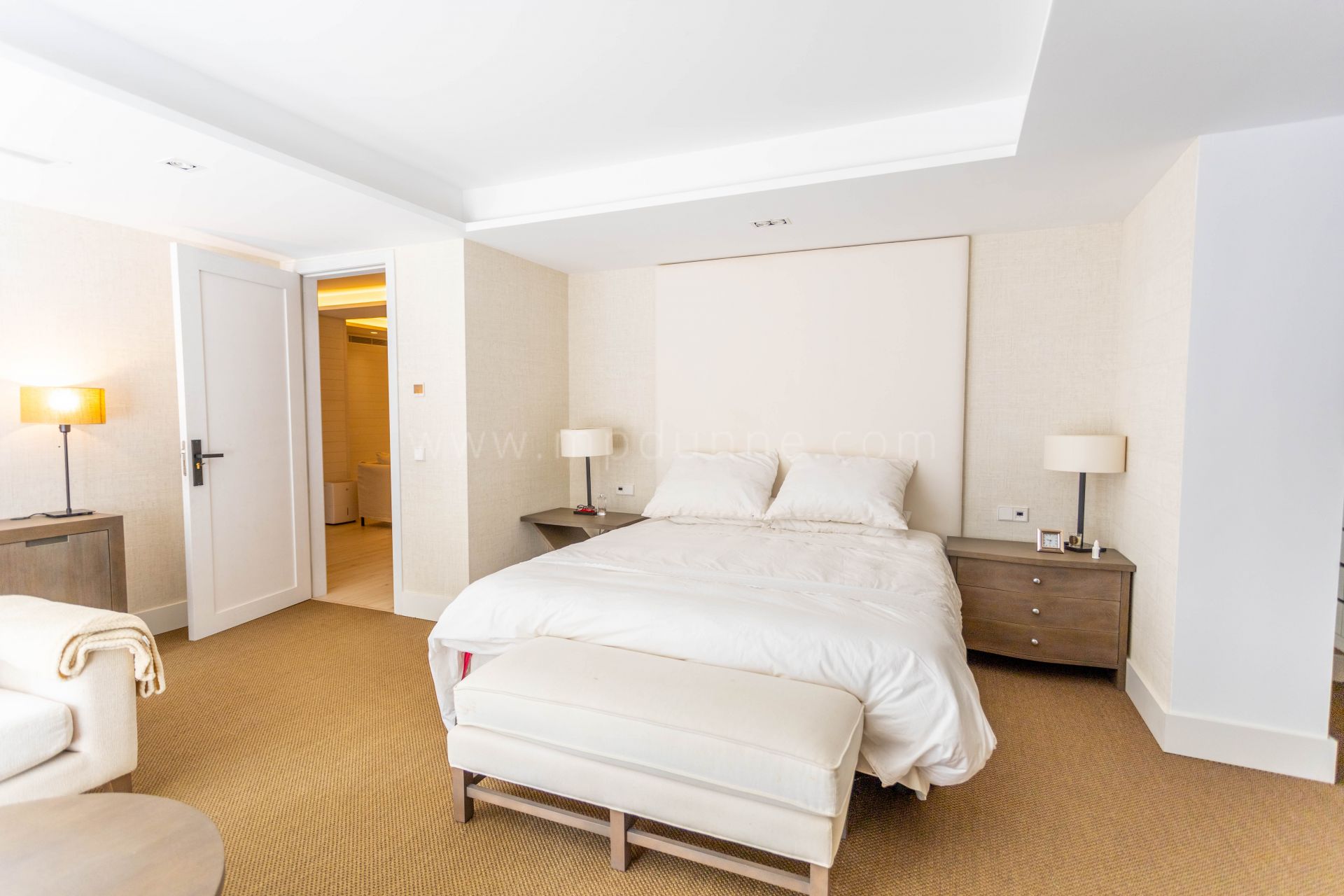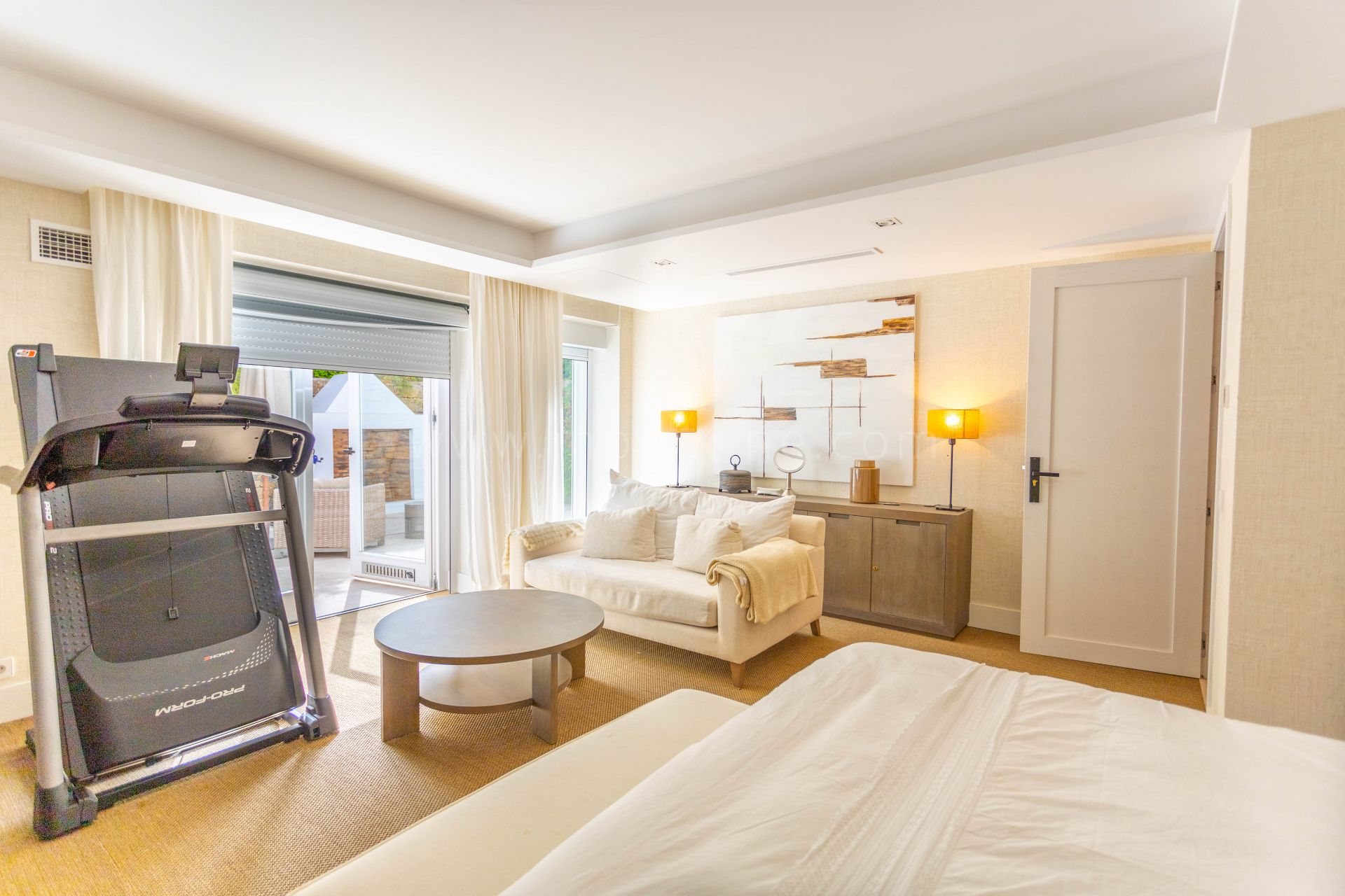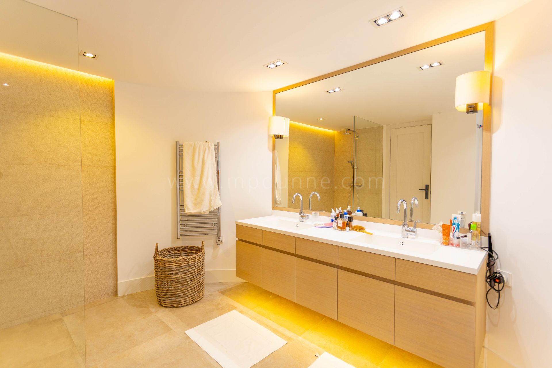 Le niveau inférieur, accessible par un large escalier, propose deux grandes suites avec salle de bain et accès direct à des terrasses privées, créant un véritable havre de paix pour vos invités.