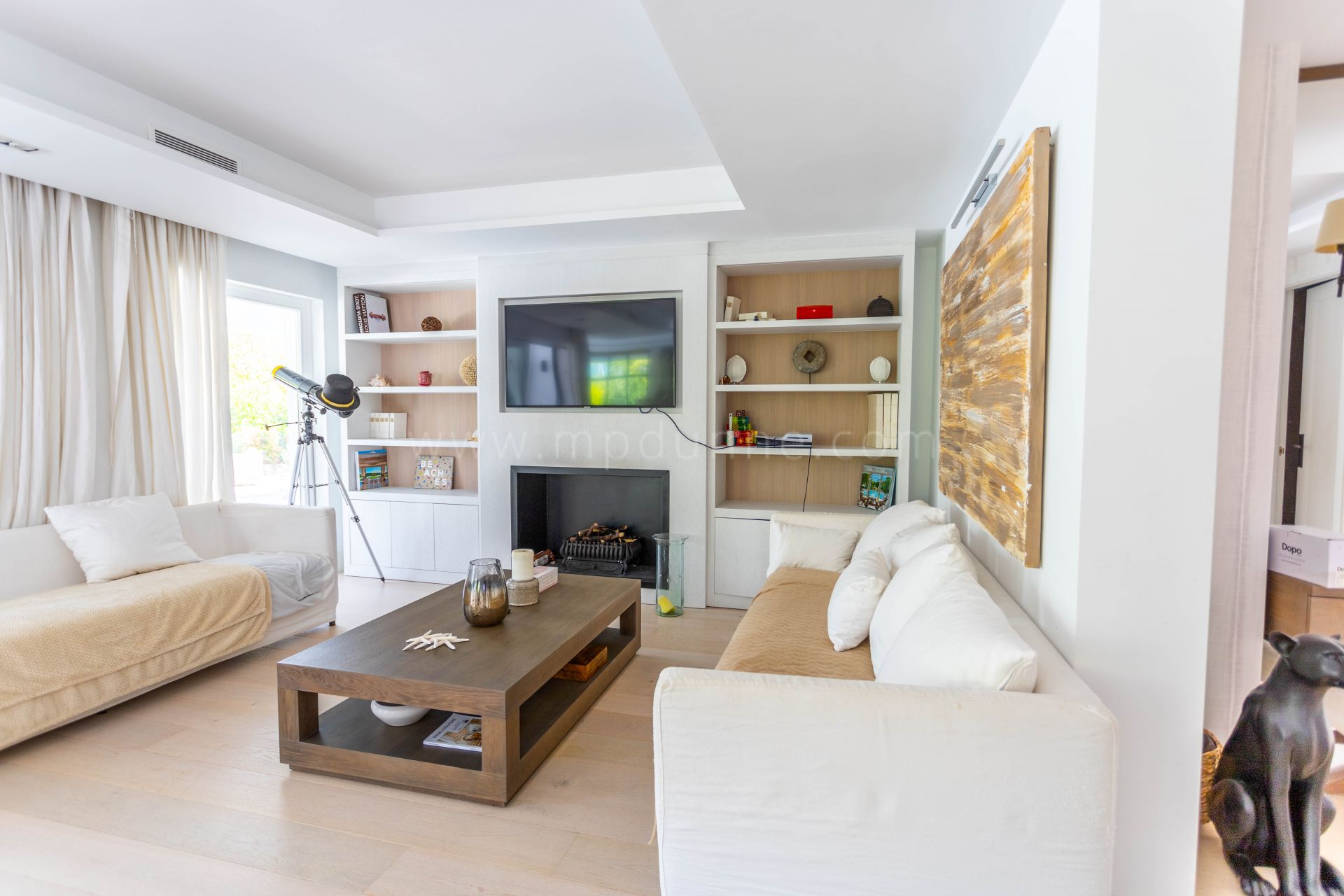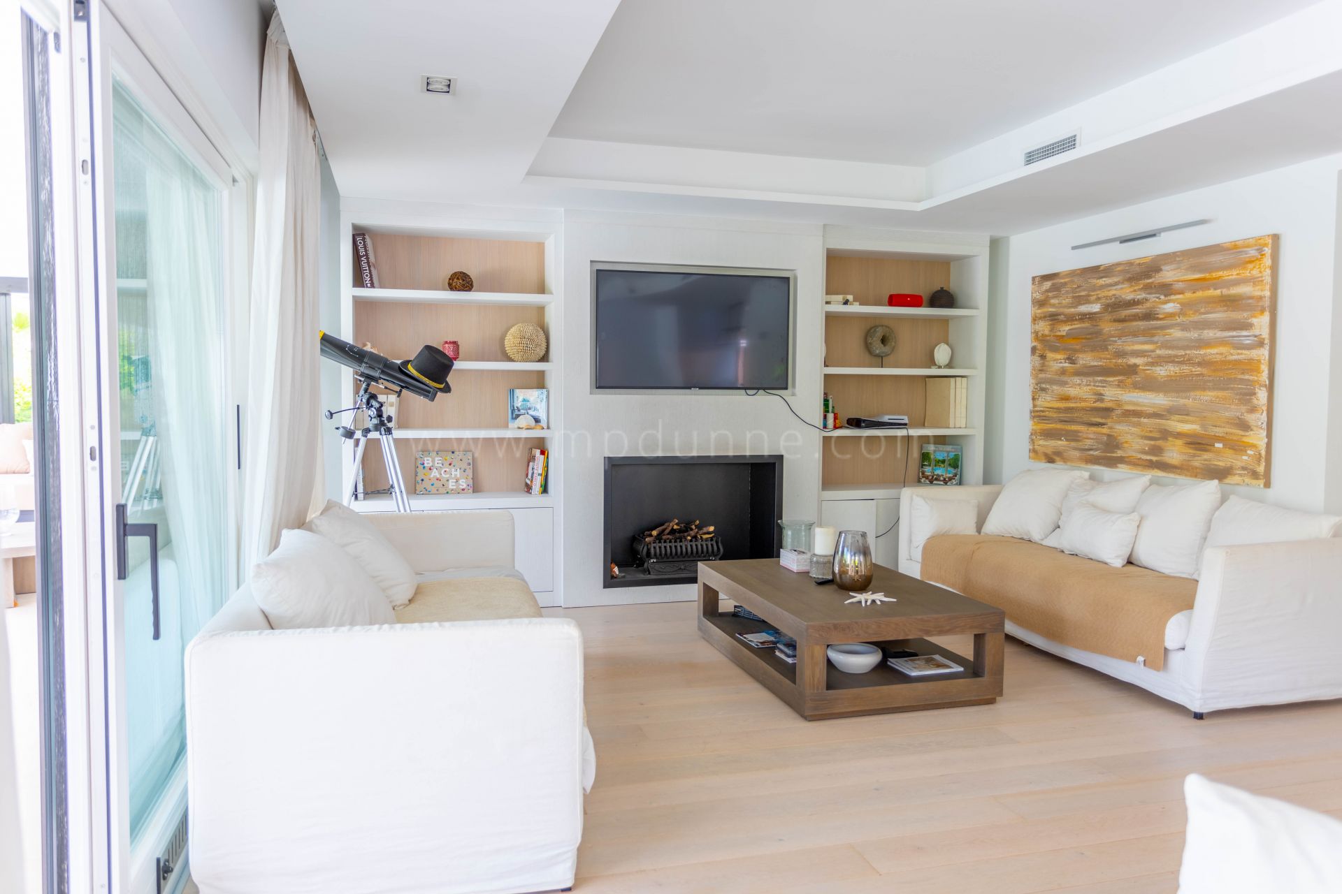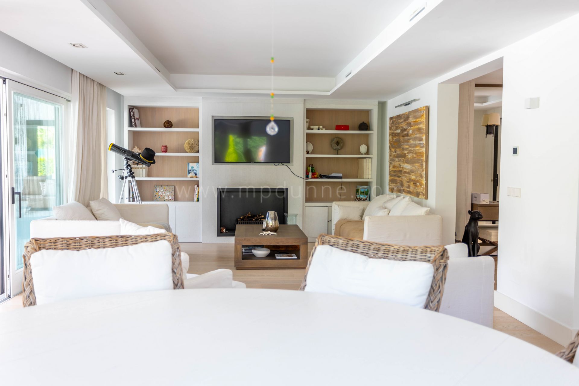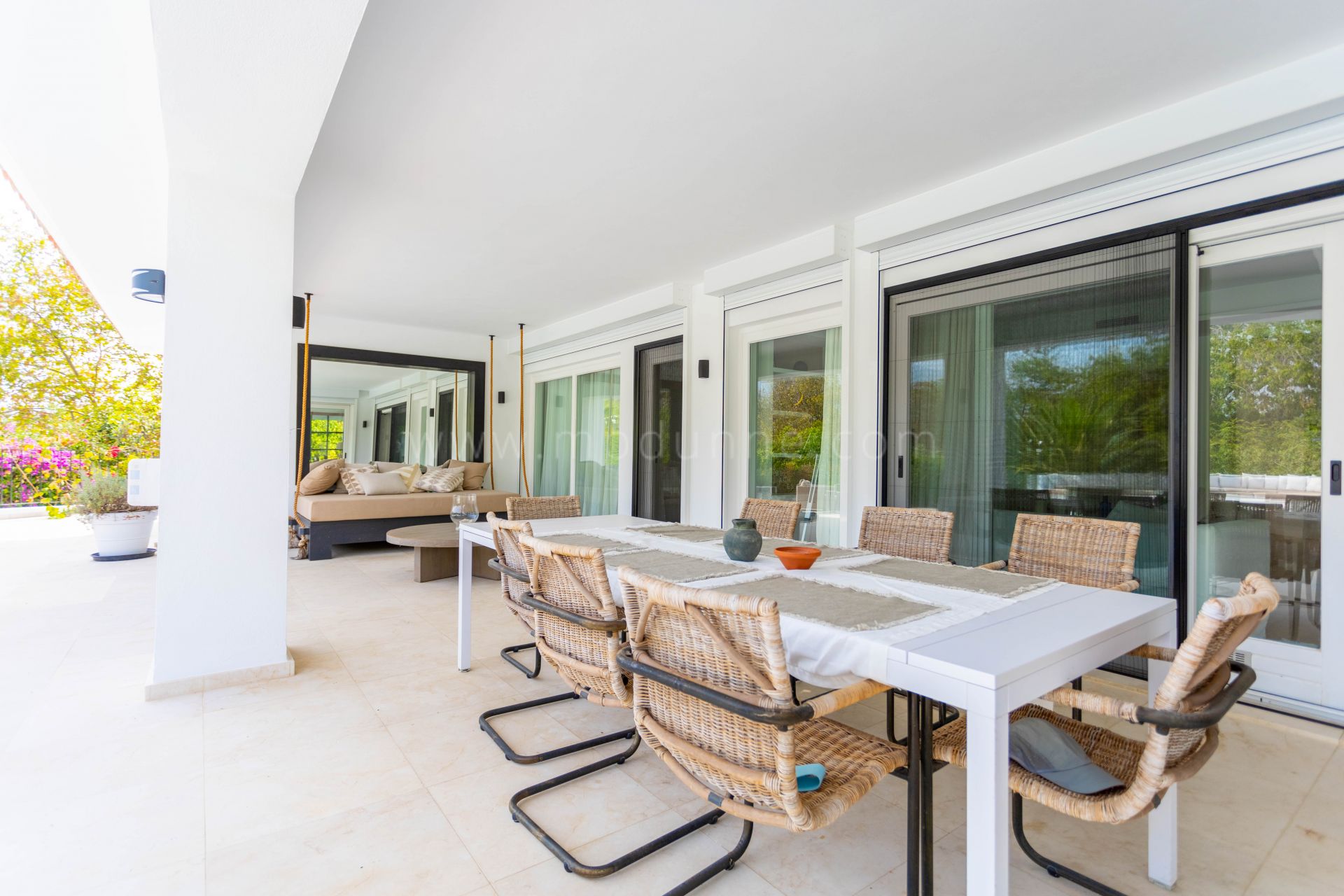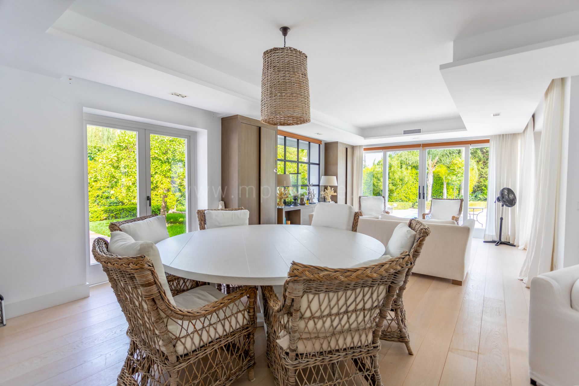 La villa s’ouvre sur un élégant hall d’entrée menant à un spacieux salon-salle à manger ouvert avec une cuisine familiale moderne. De grandes baies vitrées donnent accès à une terrasse couverte avec espace repas extérieur, idéale pour recevoir et profiter du climat ensoleillé de Marbella tout au long de l’année.