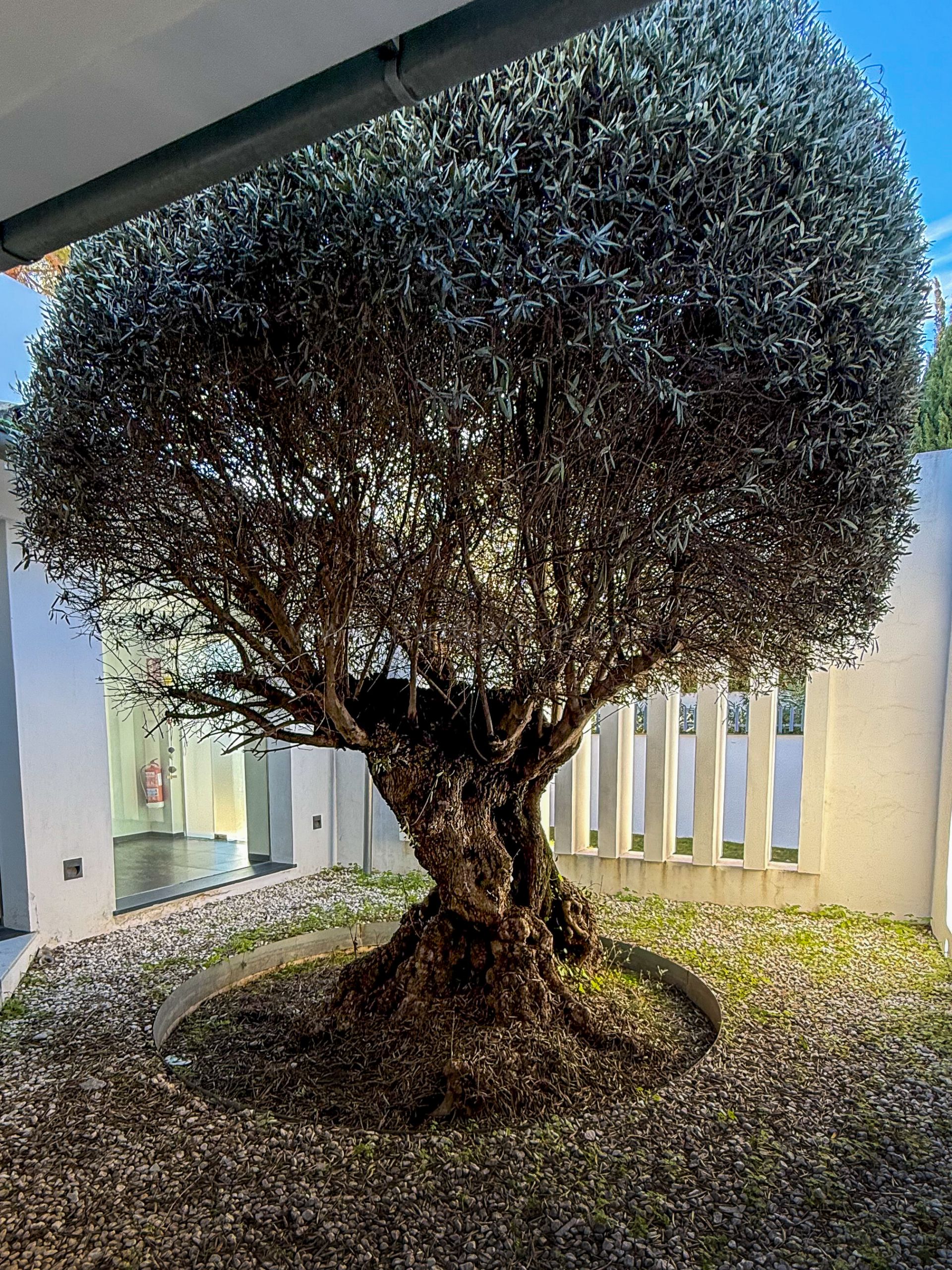 Sol en ardoise de marbre noir avec murs blancs partout. Le hall d’entrée offre une vue sur un olivier illuminé dans une petite cour remplie de pierres blanches.