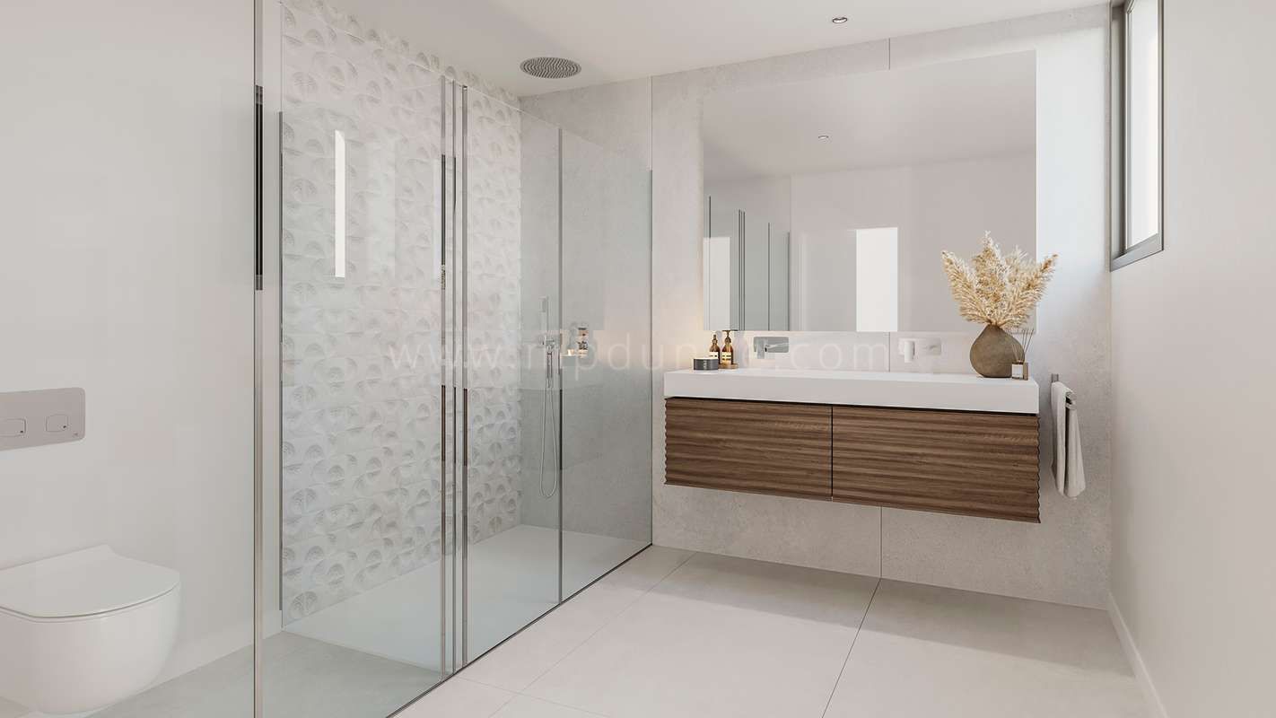 Les cuisines sont équipées de marques reconnues, avec plans de travail en quartz, appareils intégrés et éclairage LED discret. Les salles de bains sont habillées de carreaux en porcelaine grand format qui apportent une finition élégante et contemporaine.