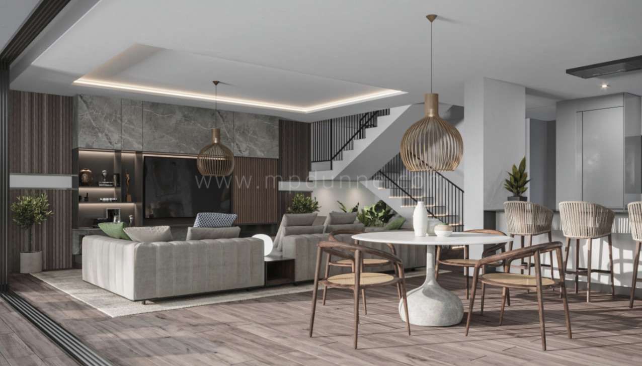 Répartie sur trois niveaux, la villa propose des intérieurs bien proportionnés, adaptés à la vie familiale comme à la réception d’invités. Le niveau principal s’organise autour d’un salon et d’une salle à manger lumineux, avec un accès direct au jardin et aux terrasses, créant une continuité naturelle entre l’intérieur et l’extérieur. La cuisine bénéficie d’un emplacement réfléchi, offrant de généreux espaces de préparation et des vues sur le jardin.