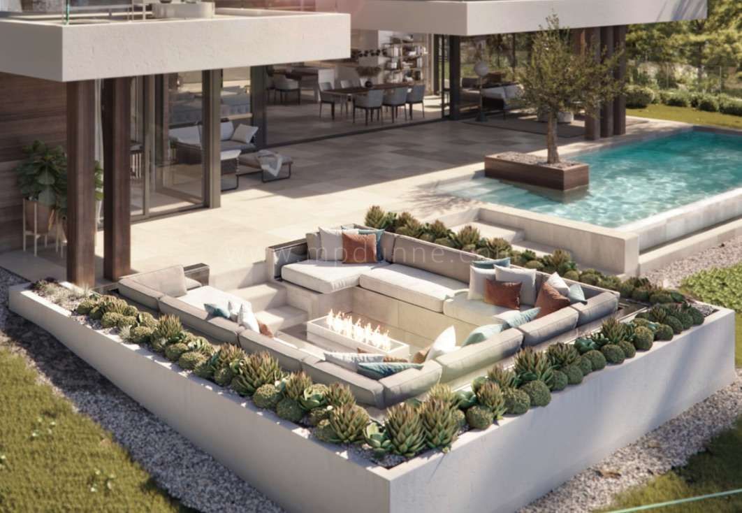La villa est implantée sur un vaste terrain privé, entouré de jardins paysagers et de vues dégagées sur les parcours de golf. Les espaces extérieurs sont conçus pour être appréciés toute l’année, avec des terrasses orientées pour profiter du soleil à différents moments de la journée et des zones dédiées à la détente ou aux réceptions.