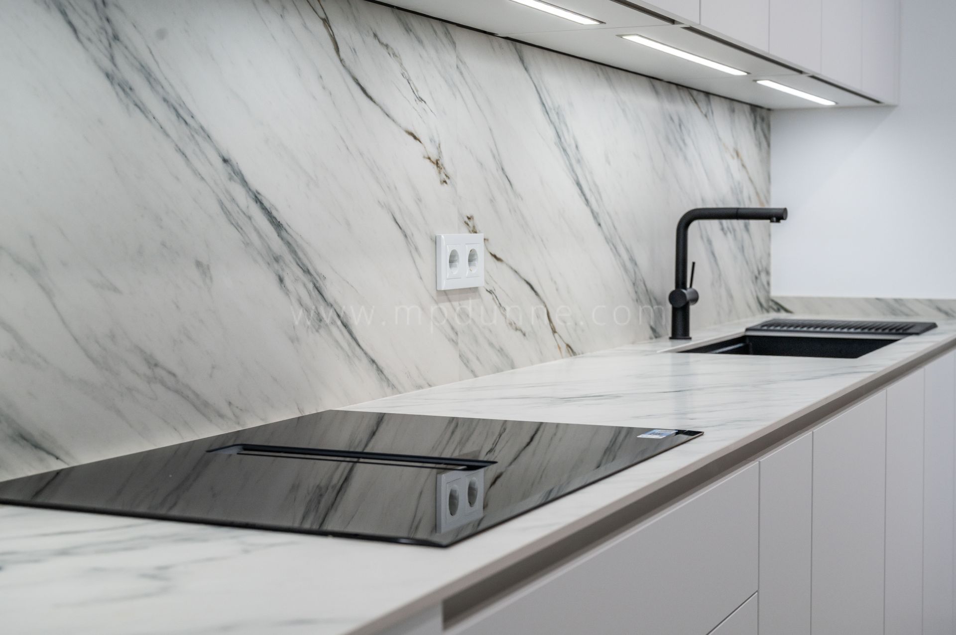 The main living area is open-plan, with a generous sitting and dining space connected to a contemporary kitchen. This central area opens directly onto a private terrace, creating an easy indoor-outdoor flow and framing the sea views beyond.