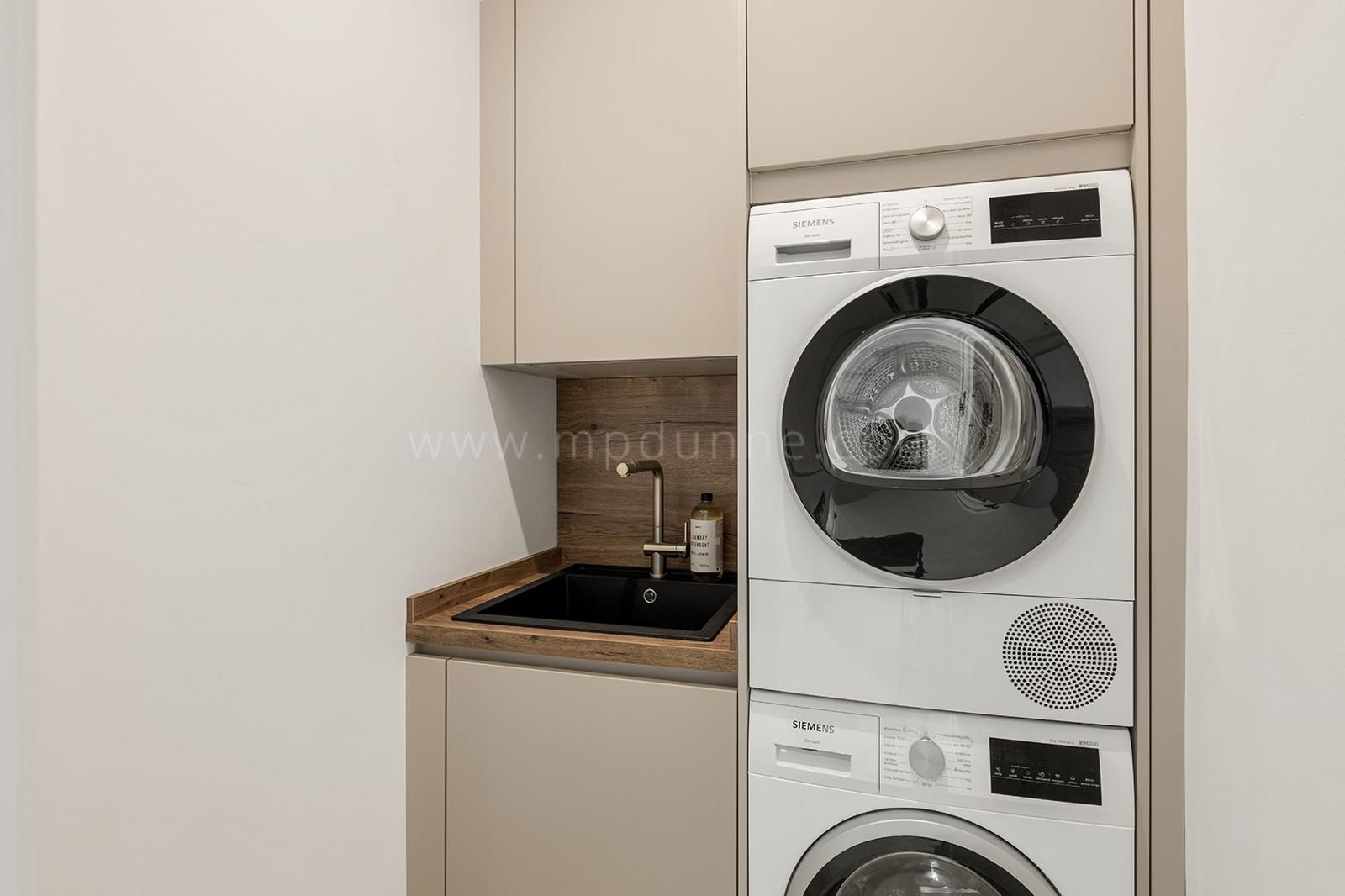 The lower level features a private garage, a versatile living and cinema room, a laundry area, and an independent storage room. On the main floor, an open-plan Siemens kitchen flows seamlessly into the dining and living areas, extending onto a covered terrace with a built-in barbecue and direct access to the landscaped communal grounds. A guest bedroom is also located on this level.
