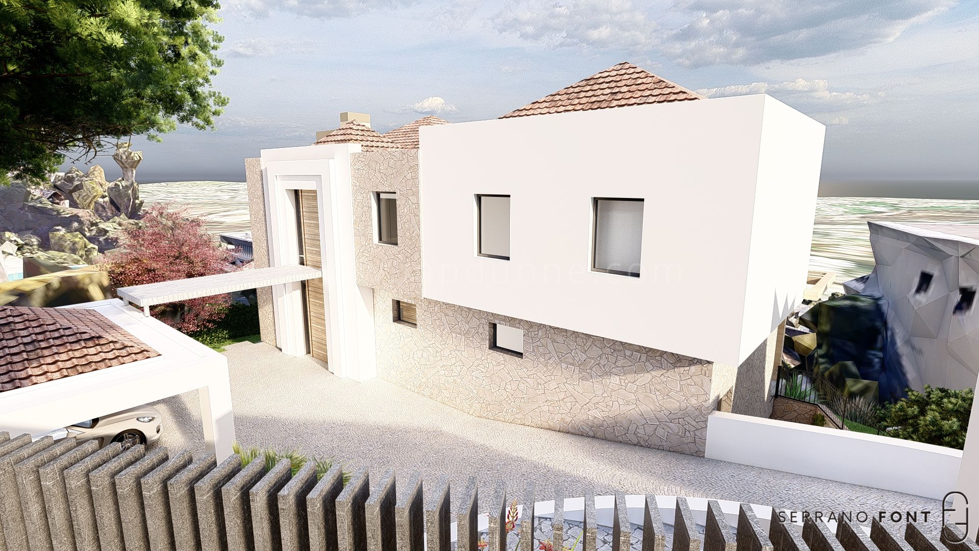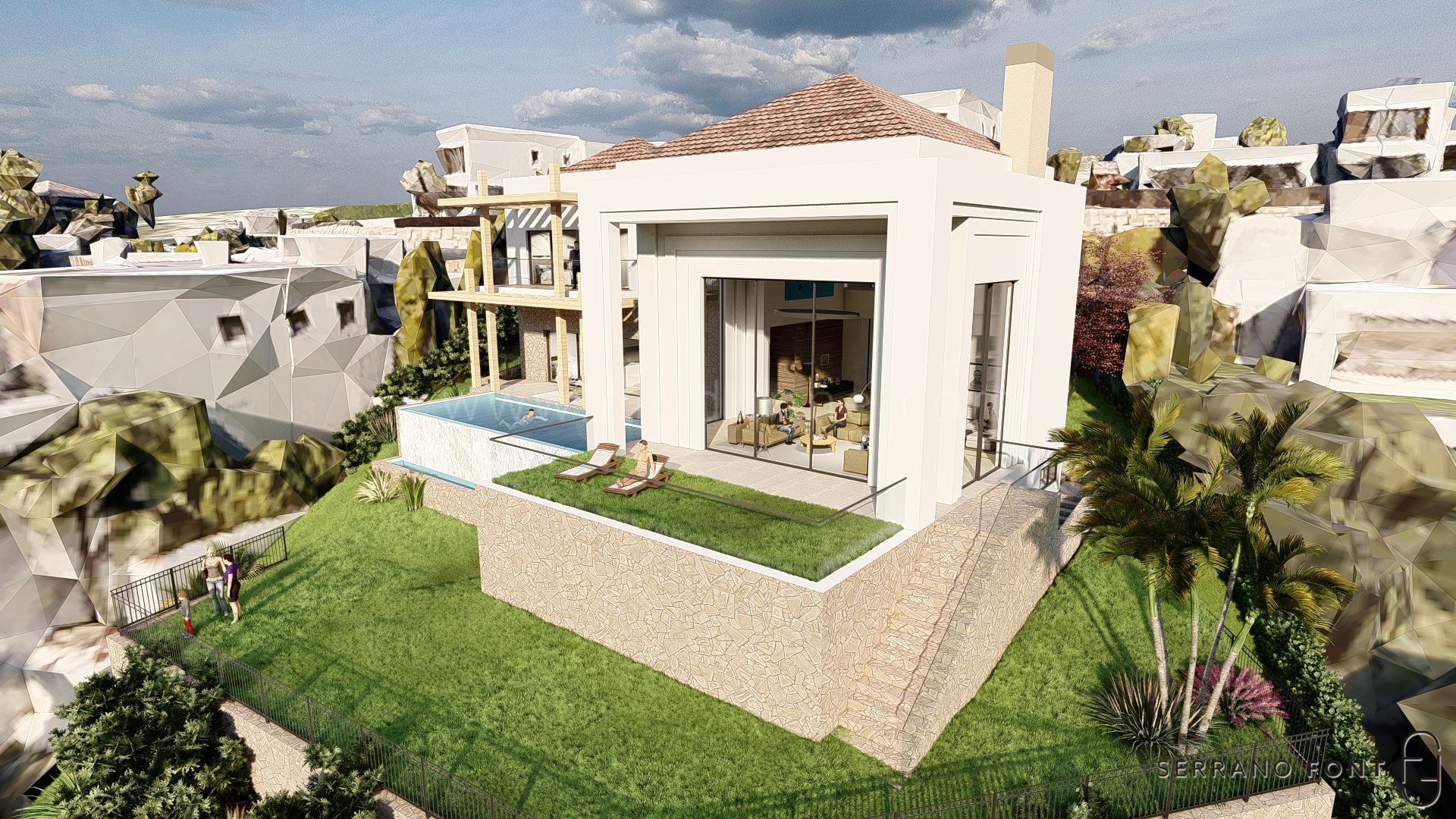 The proposed home extends across three levels, with a layout that balances open living areas and private accommodation. The main floor centres around a bright living room with direct access to the terrace and planned swimming pool, complemented by a connected kitchen and dining space. A guest bedroom, bathroom and an aseo are also included on this level.