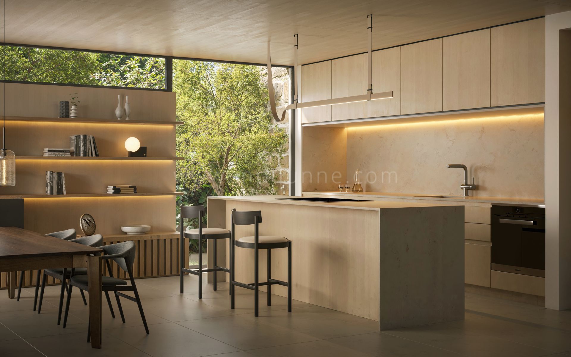 The main living area is arranged in an open-plan layout where the kitchen, dining, and lounge spaces connect seamlessly, creating a bright and fluid environment. Full-height glazing extends the interior outwards, allowing for a natural flow between inside and out, ideal for both everyday living and entertaining.