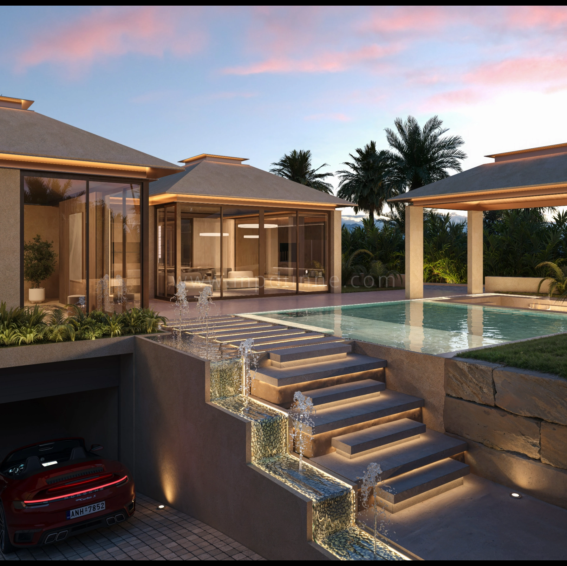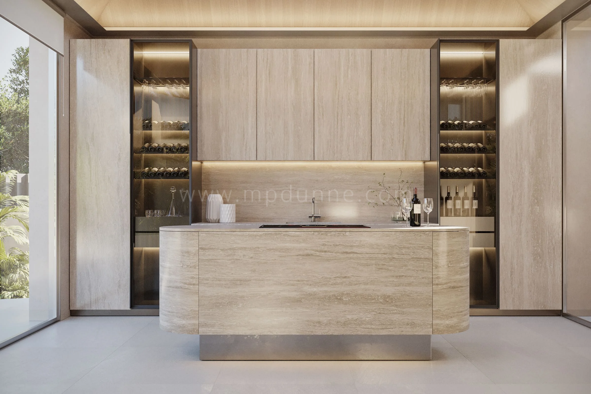 The villa opens with bright, open-plan living areas where generous volumes and natural light create a calm, inviting atmosphere. A sleek, high-spec kitchen connects seamlessly to the main living and dining spaces, designed for effortless entertaining and day-to-day living.