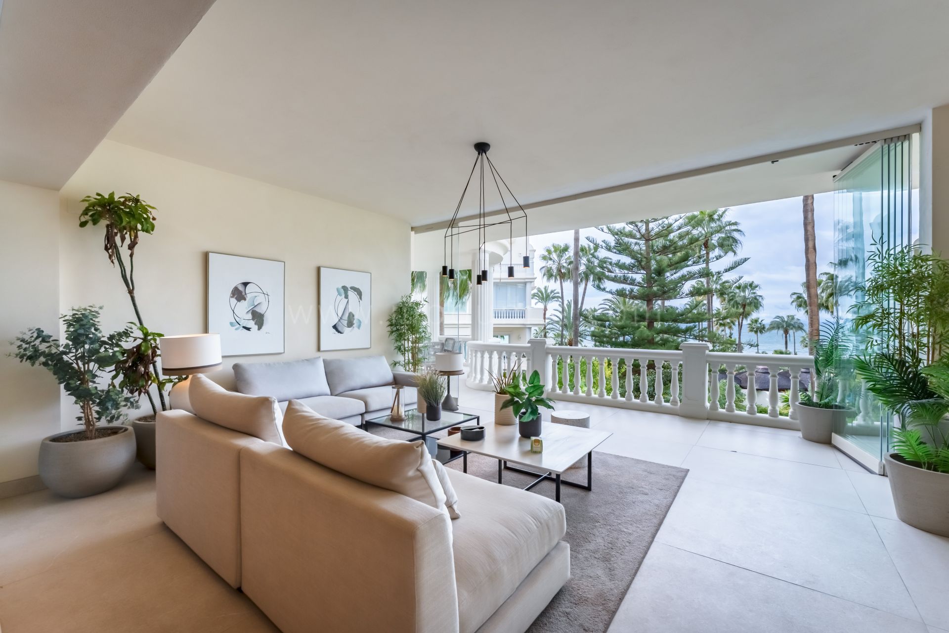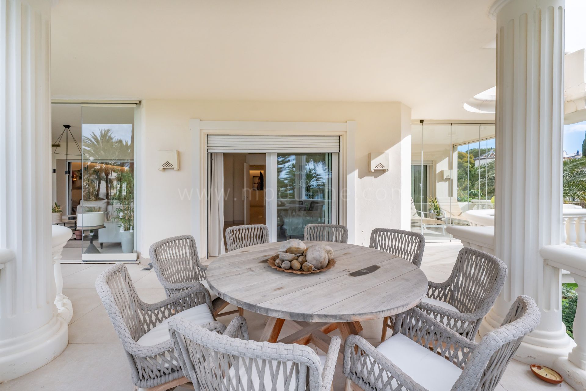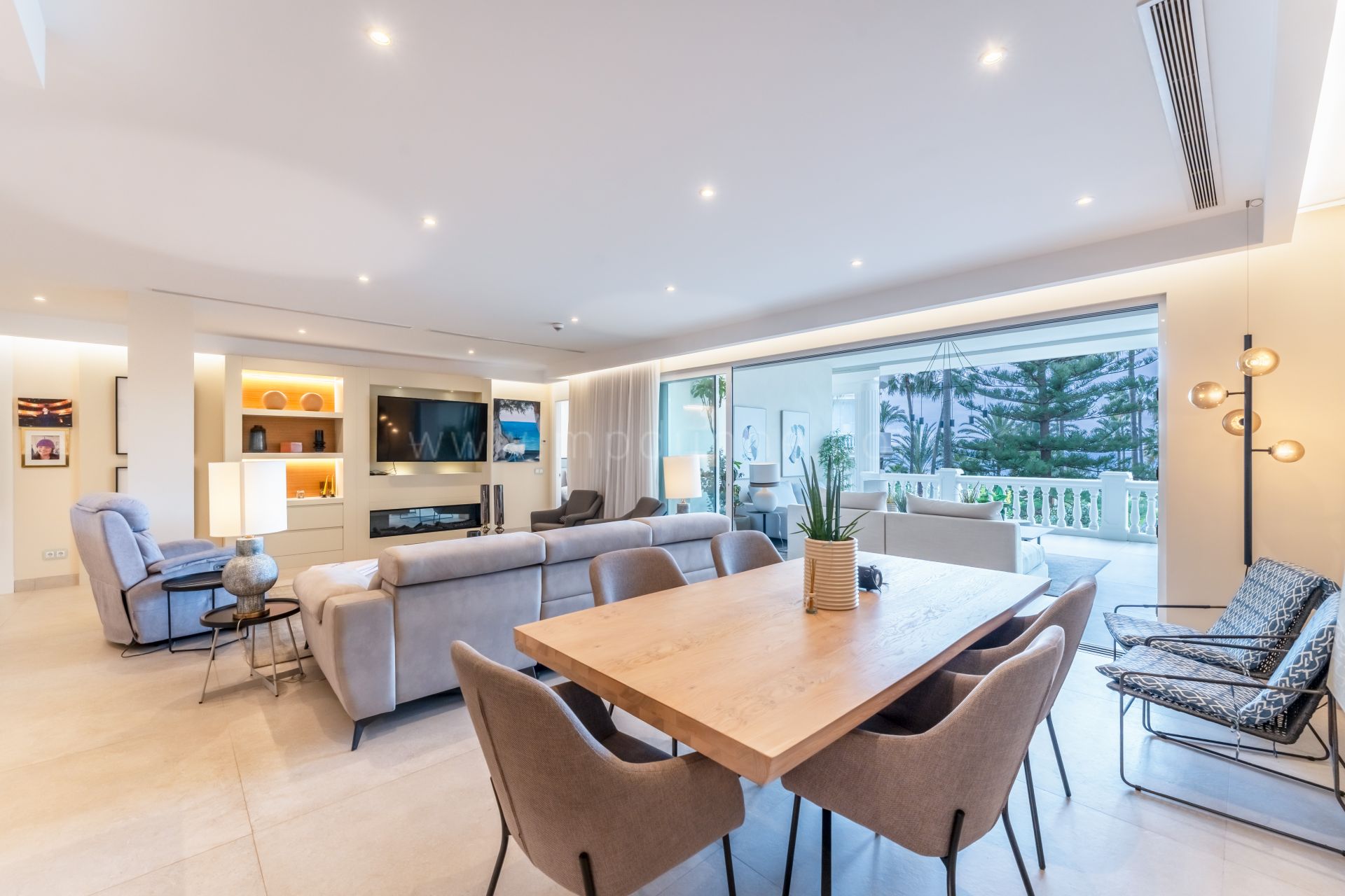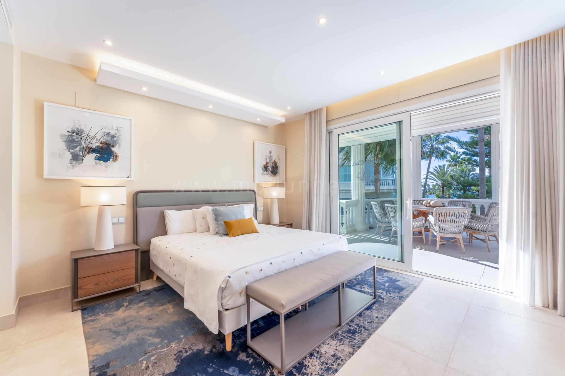 Positioned directly on the beachfront within Las Dunas Park, this elegant apartment offers a rare opportunity to own in one of the New Golden Mile’s most established five-star residential communities. With uninterrupted views across the Mediterranean, the property combines privacy, comfort and immediate access to the coastline.