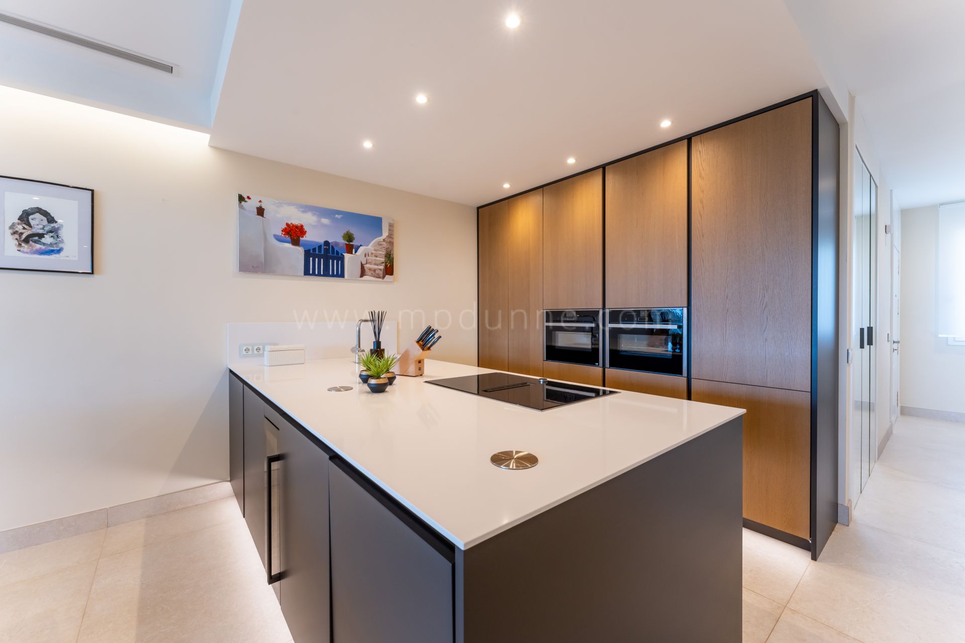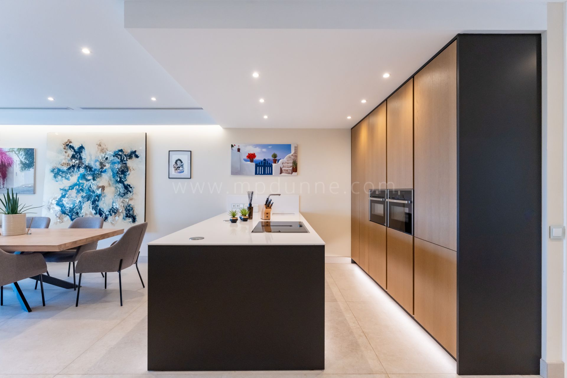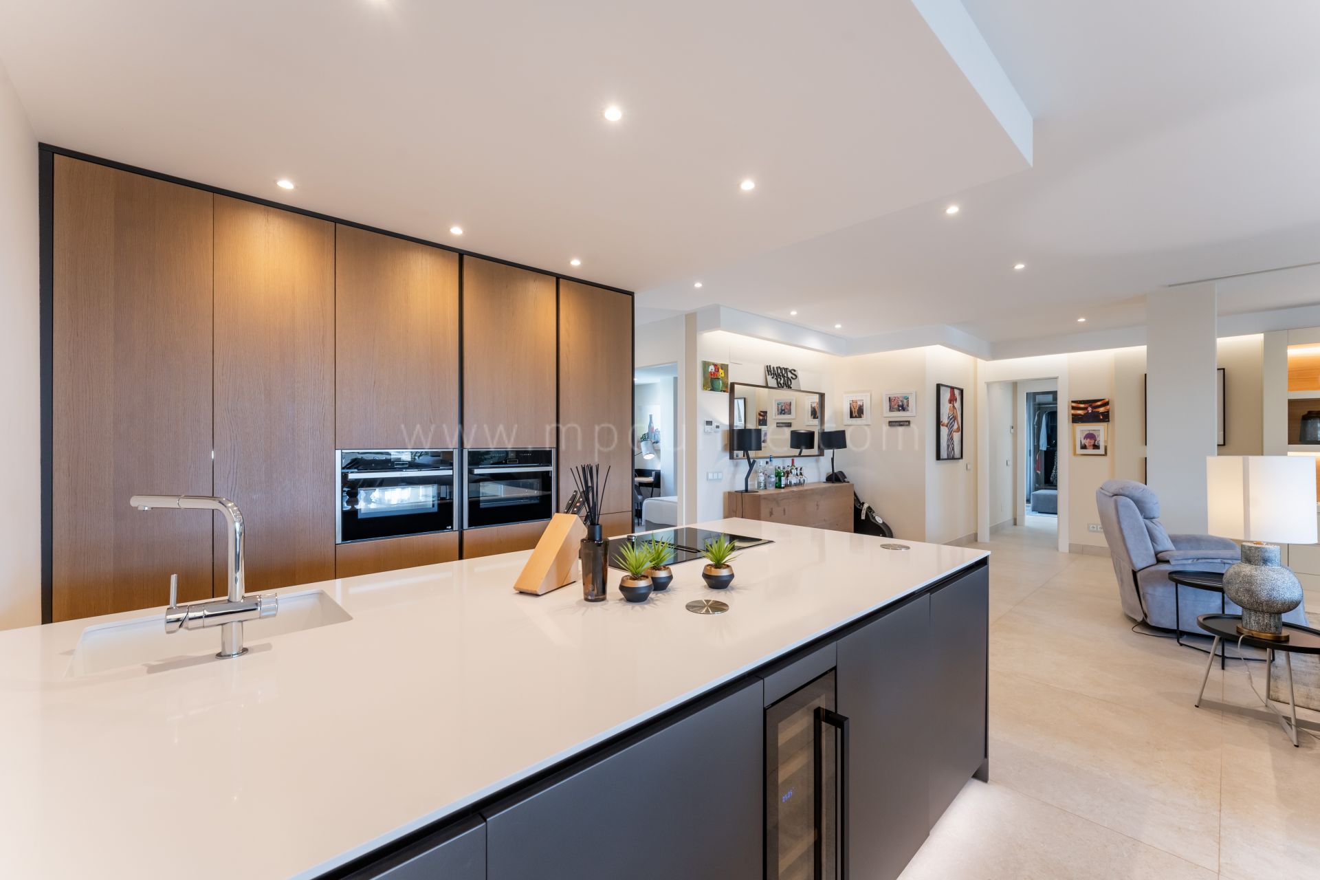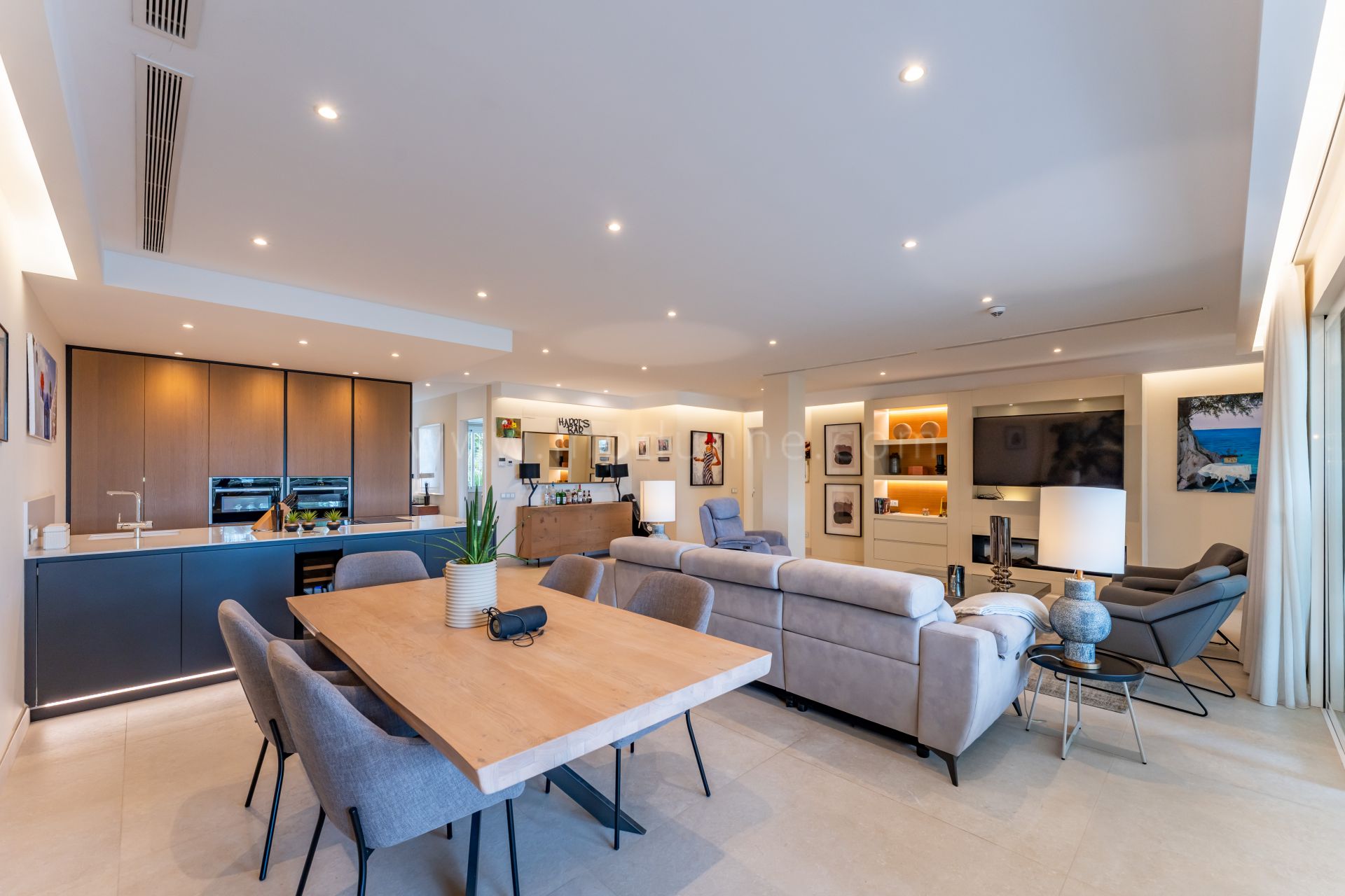 The interior is bright and well-proportioned, centred around a spacious living and dining area that opens onto a generous terrace overlooking the sea. The open-plan kitchen is fully equipped with modern appliances and designed for both everyday use and informal entertaining. High-quality materials and finishes are consistent throughout, creating a calm and cohesive living environment.