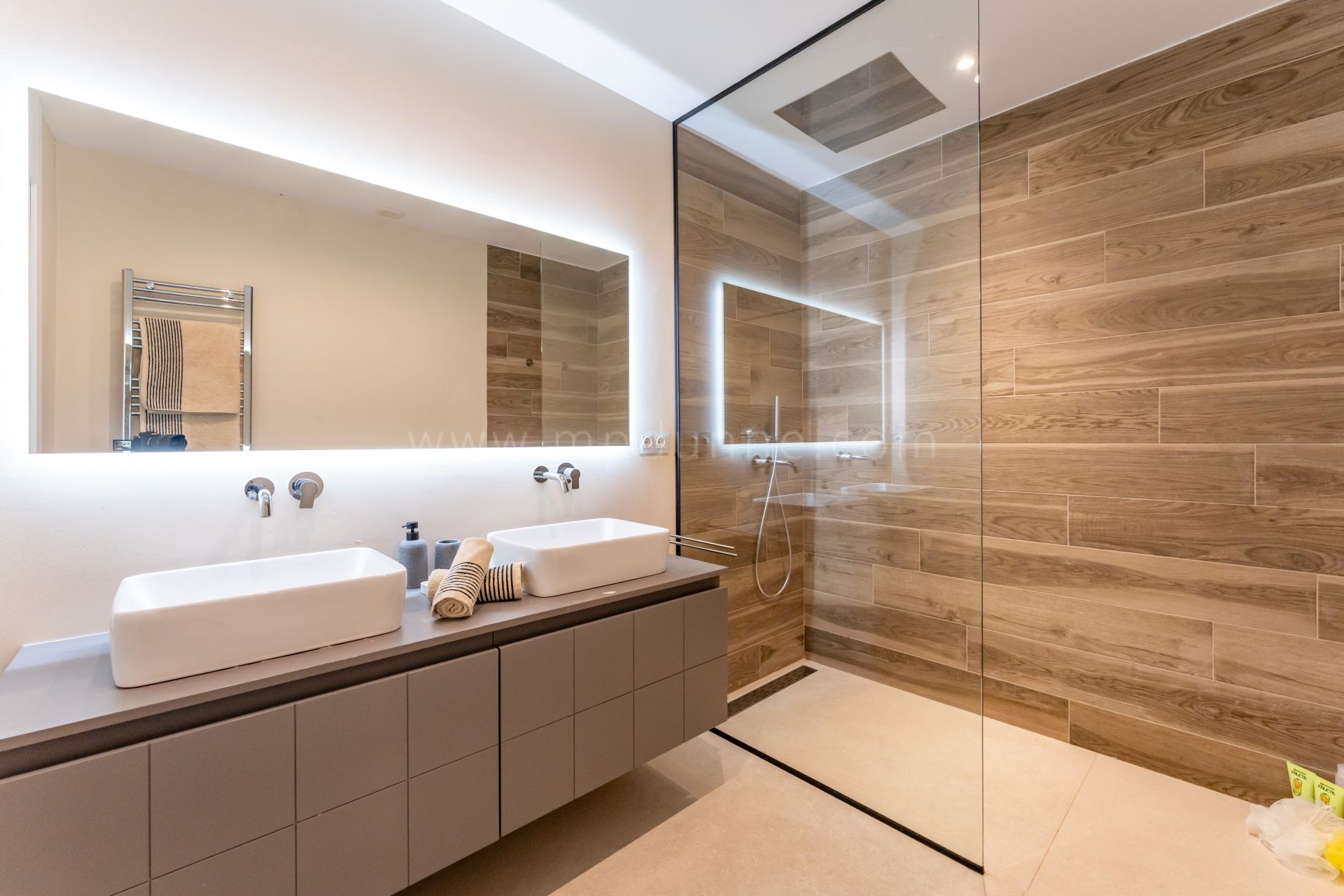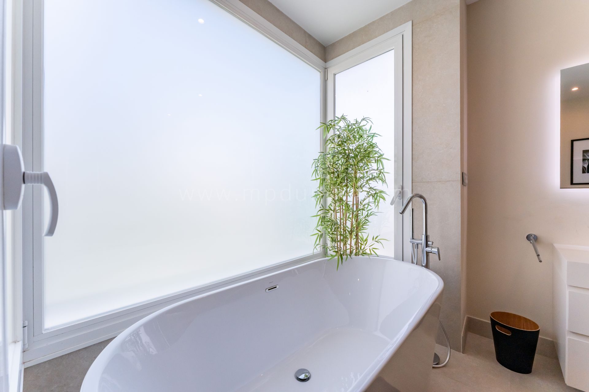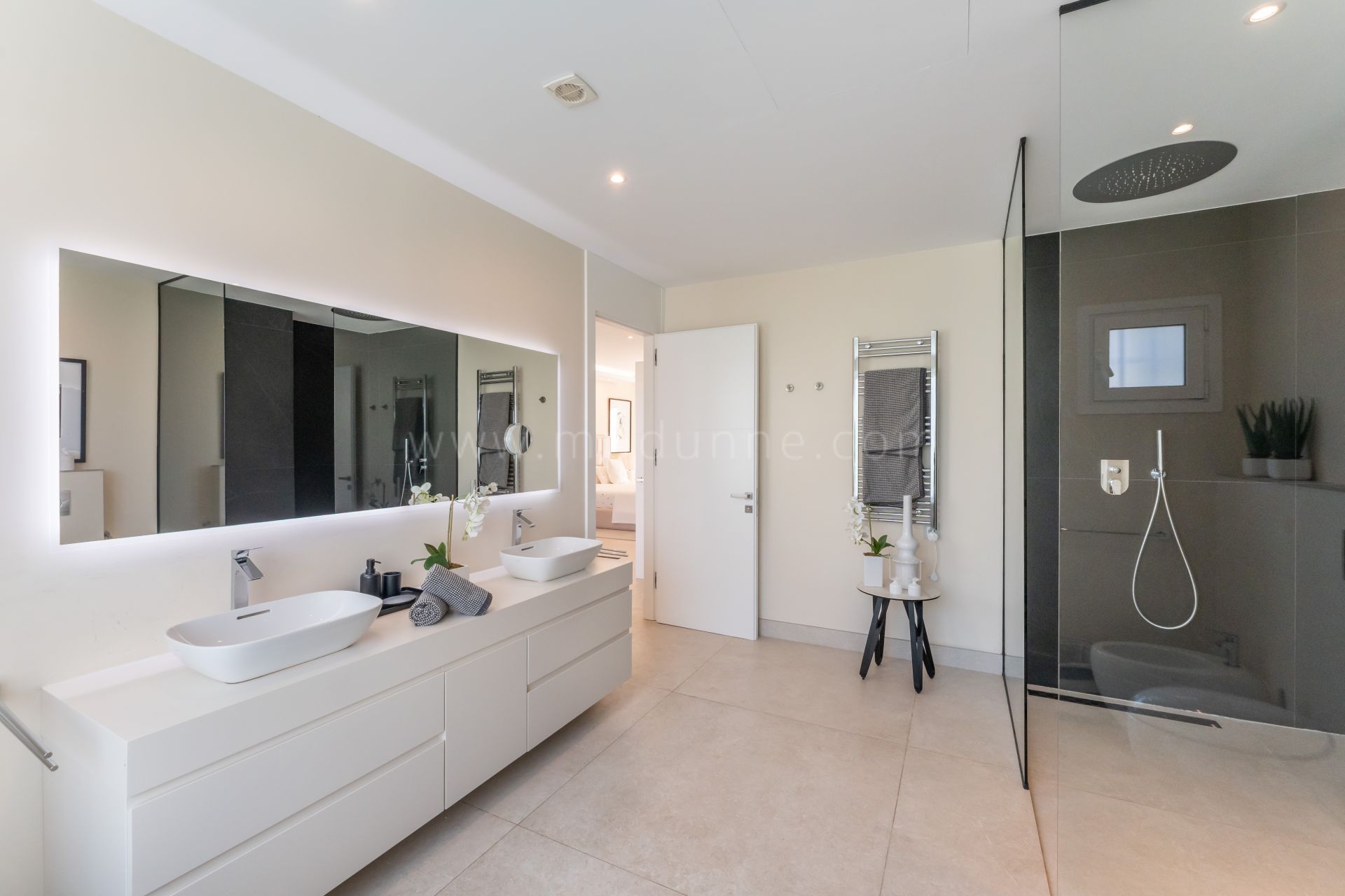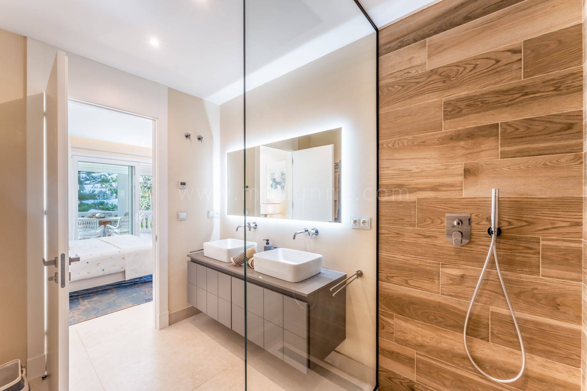 The main bedroom enjoys direct access to the terrace and sea views, while additional bedrooms are thoughtfully arranged to provide comfort for guests or family. Bathrooms are finished to a high standard, complemented by a separate aseo. A dedicated laundry room adds further convenience.