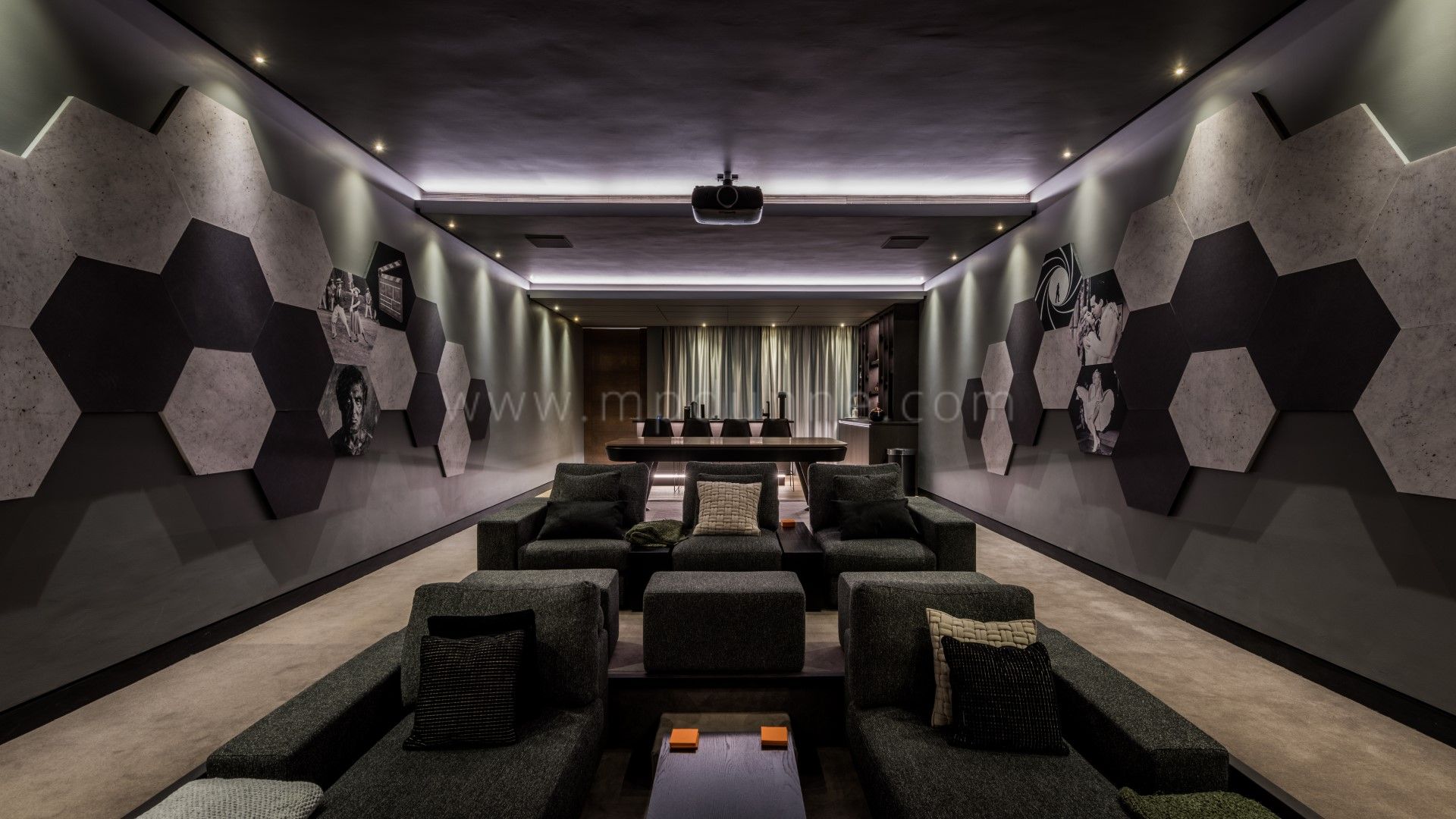 The principal bedroom suite occupies this level, complete with a private terrace, en suite bathroom, and dressing room. A lower floor houses four well-proportioned bedrooms with en suite bathrooms, all with direct access to the landscaped gardens and swimming pool. This level also features a gymnasium, sauna, private cinema, games area, and a hospitality kitchen by Siematic. The closed garage accommodates four vehicles, alongside a separate laundry room.
