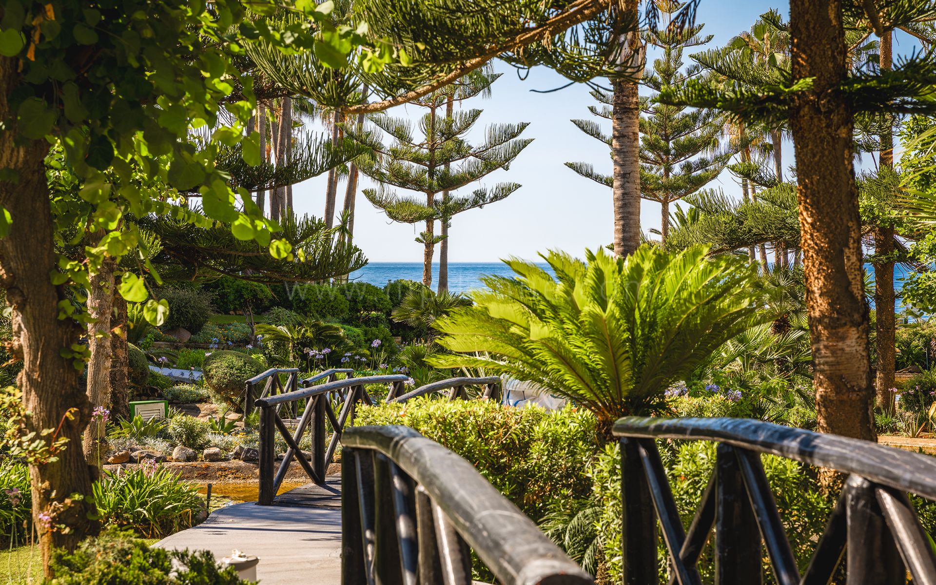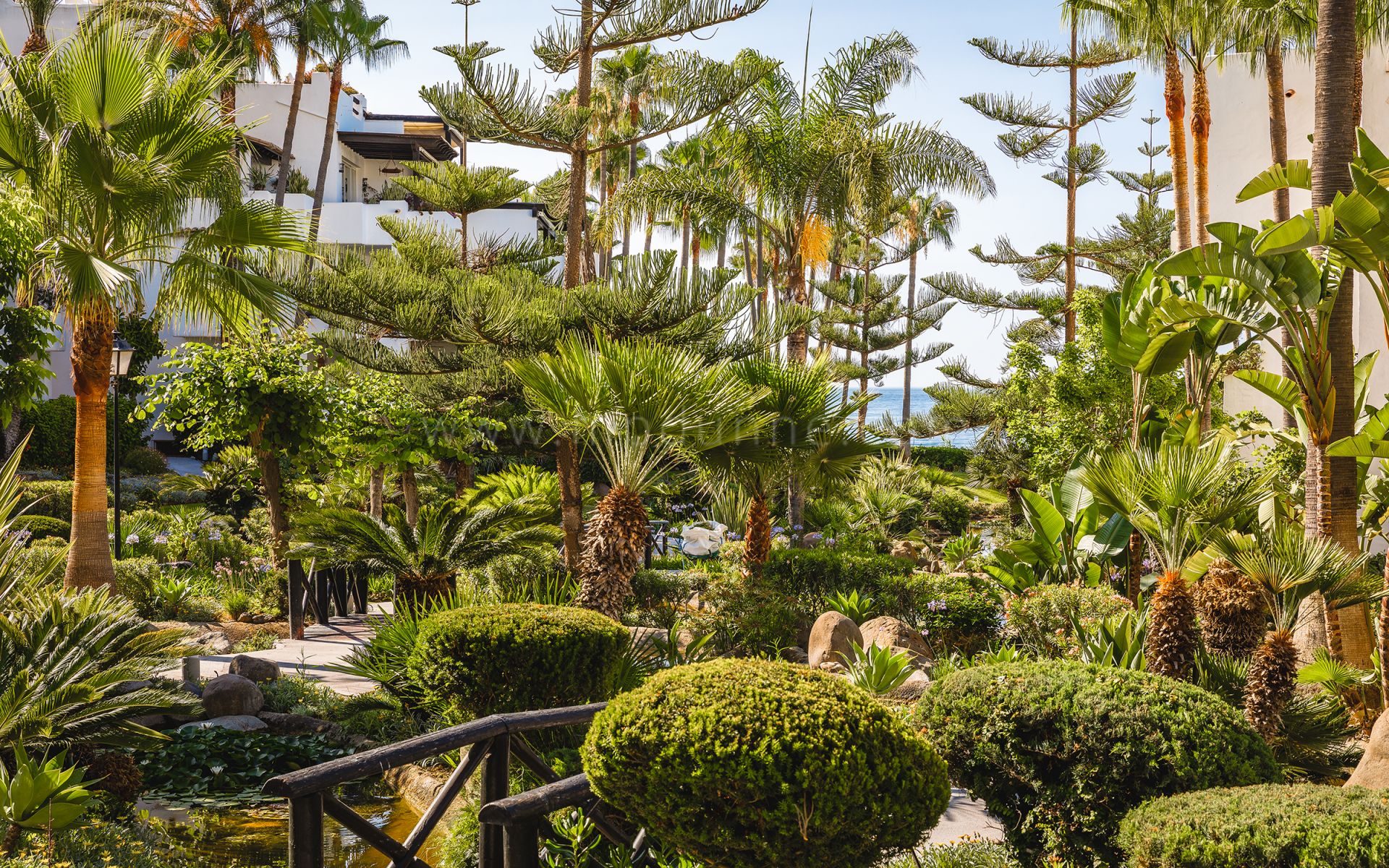 This fully renovated apartment is located in the Japanese Gardens within Marina Puente Romano, one of Marbella’s most desirable beachfront developments on the Golden Mile. Set on an elevated ground floor, it overlooks the beautifully maintained gardens and swimming pool.