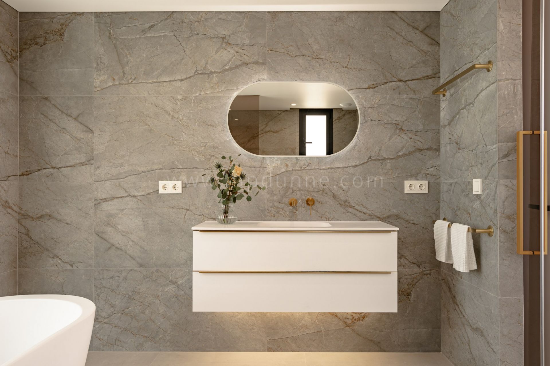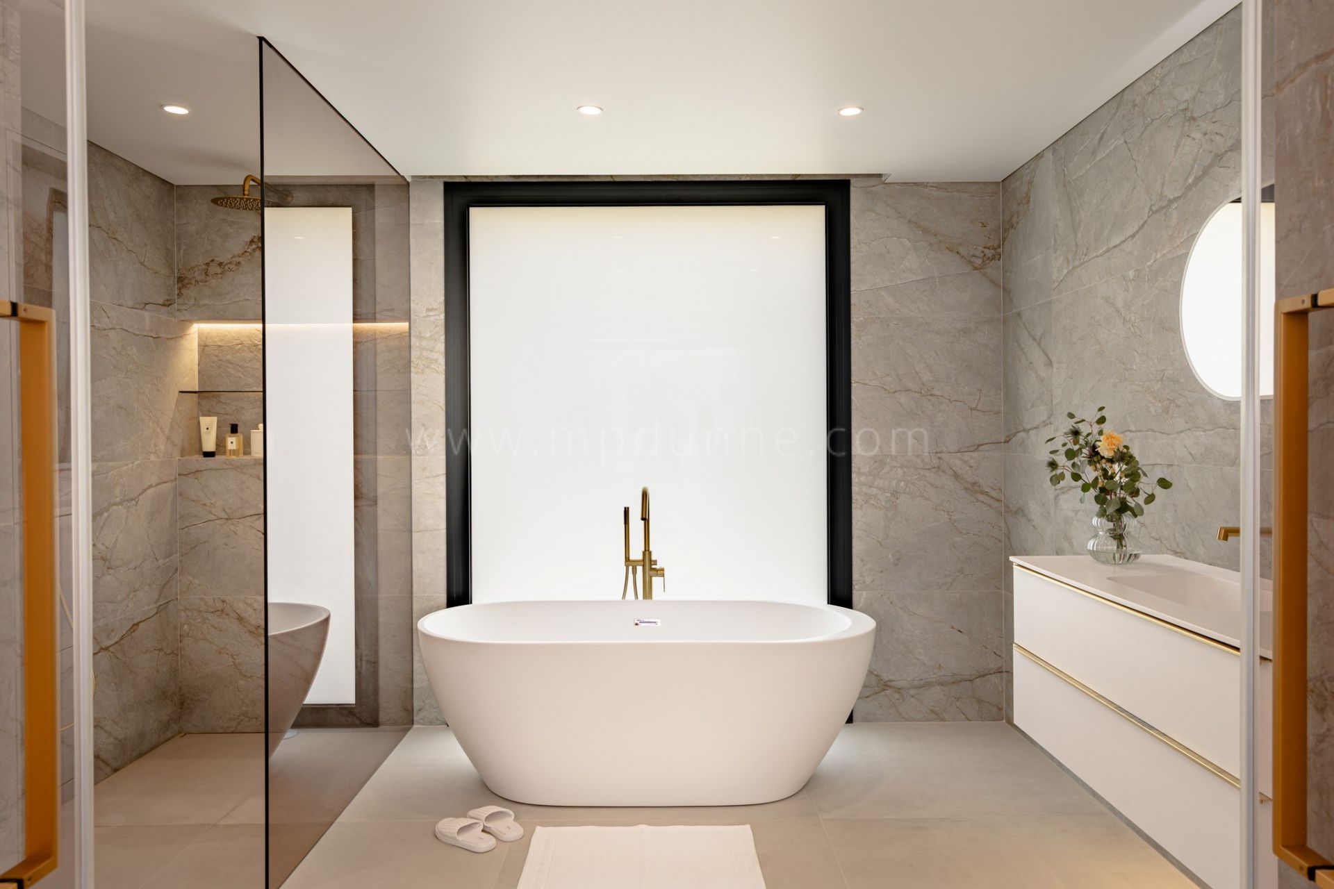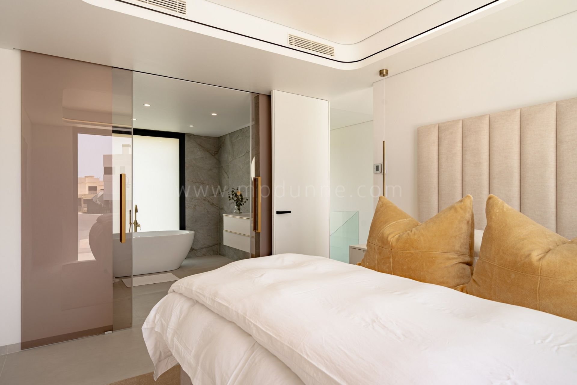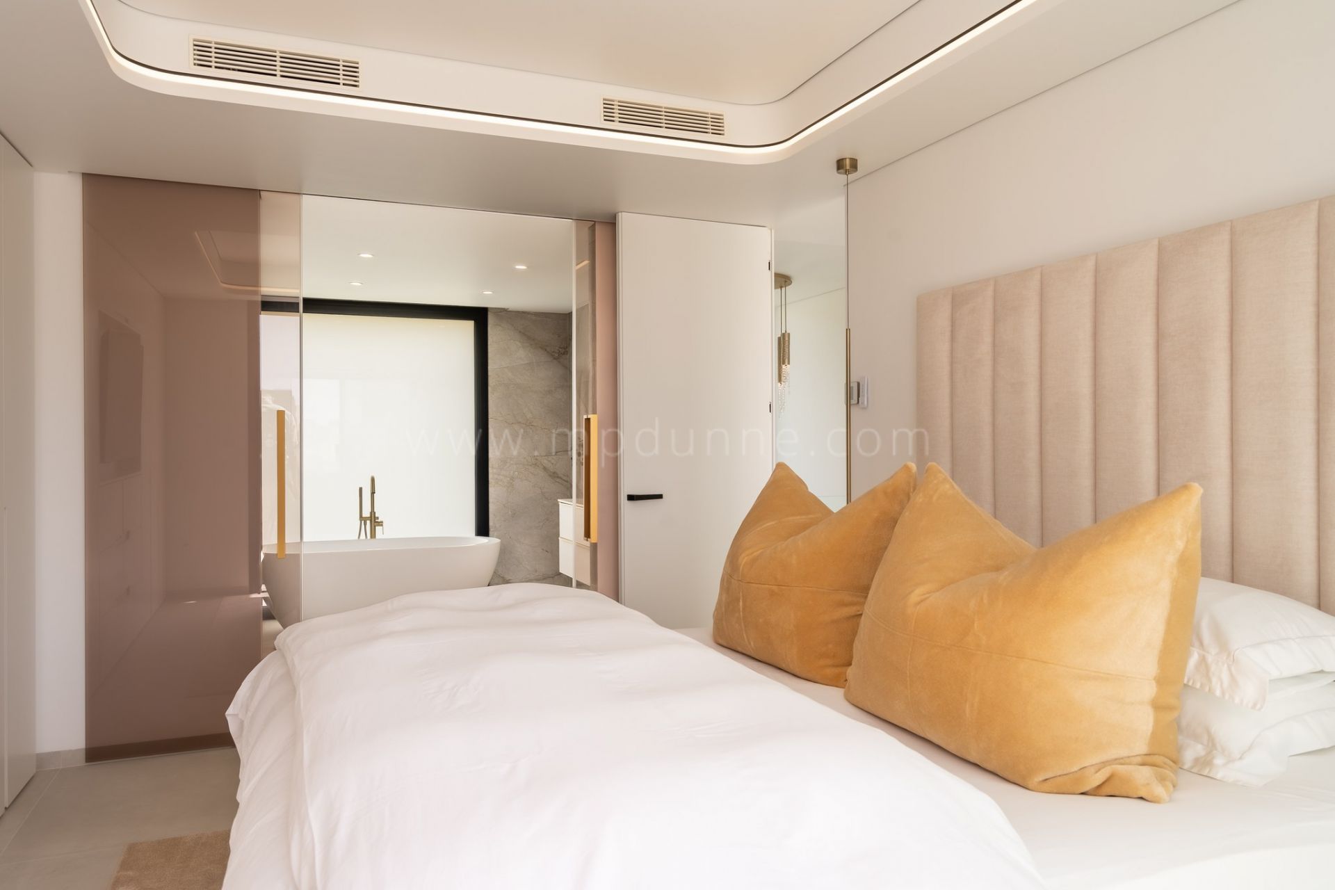 The villa’s four bedrooms are bright and well-proportioned, including a main suite with a walk-in wardrobe, private terrace access, and an en-suite bathroom. Interiors are completed with elegant finishes and considered details, offering a sense of understated luxury.