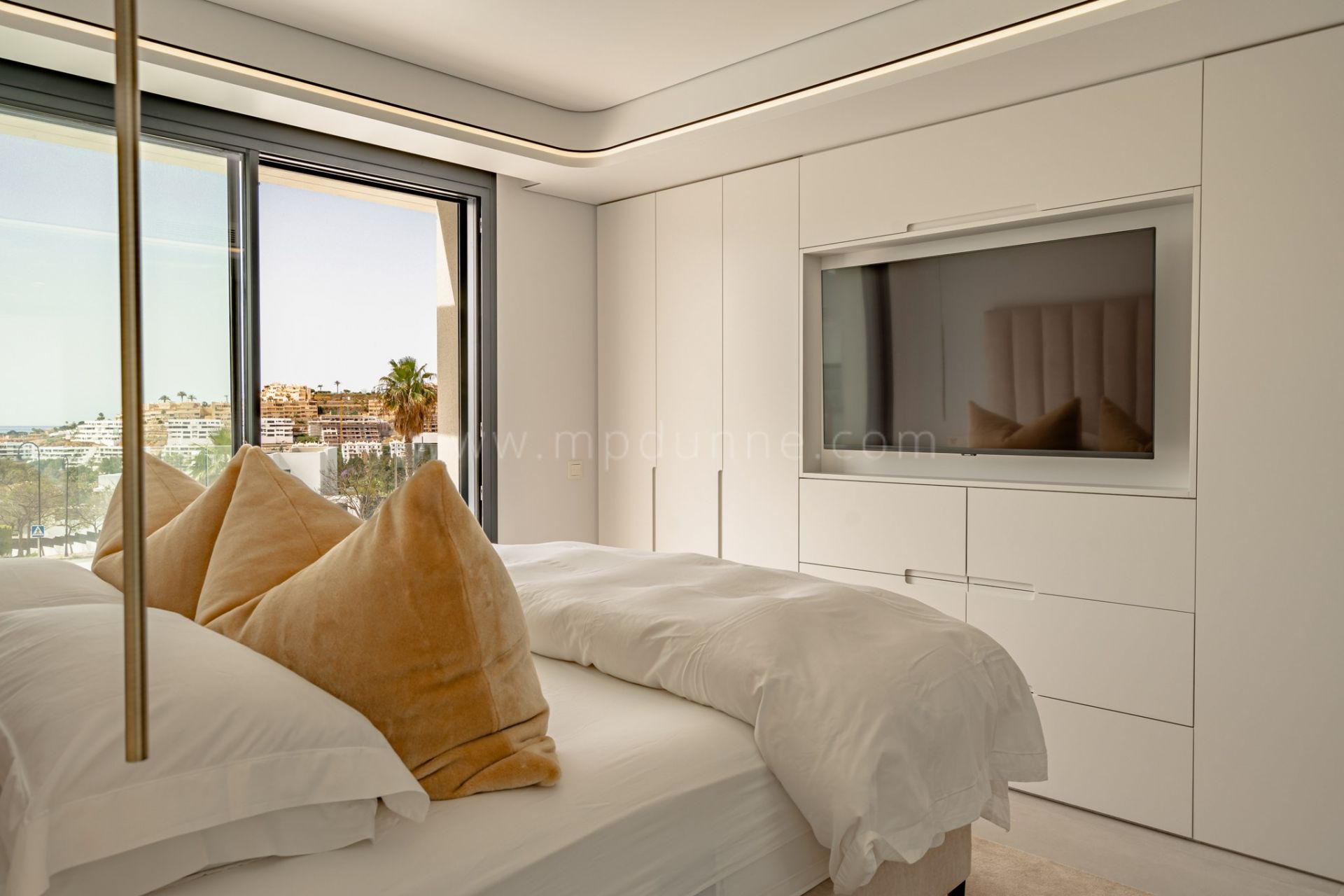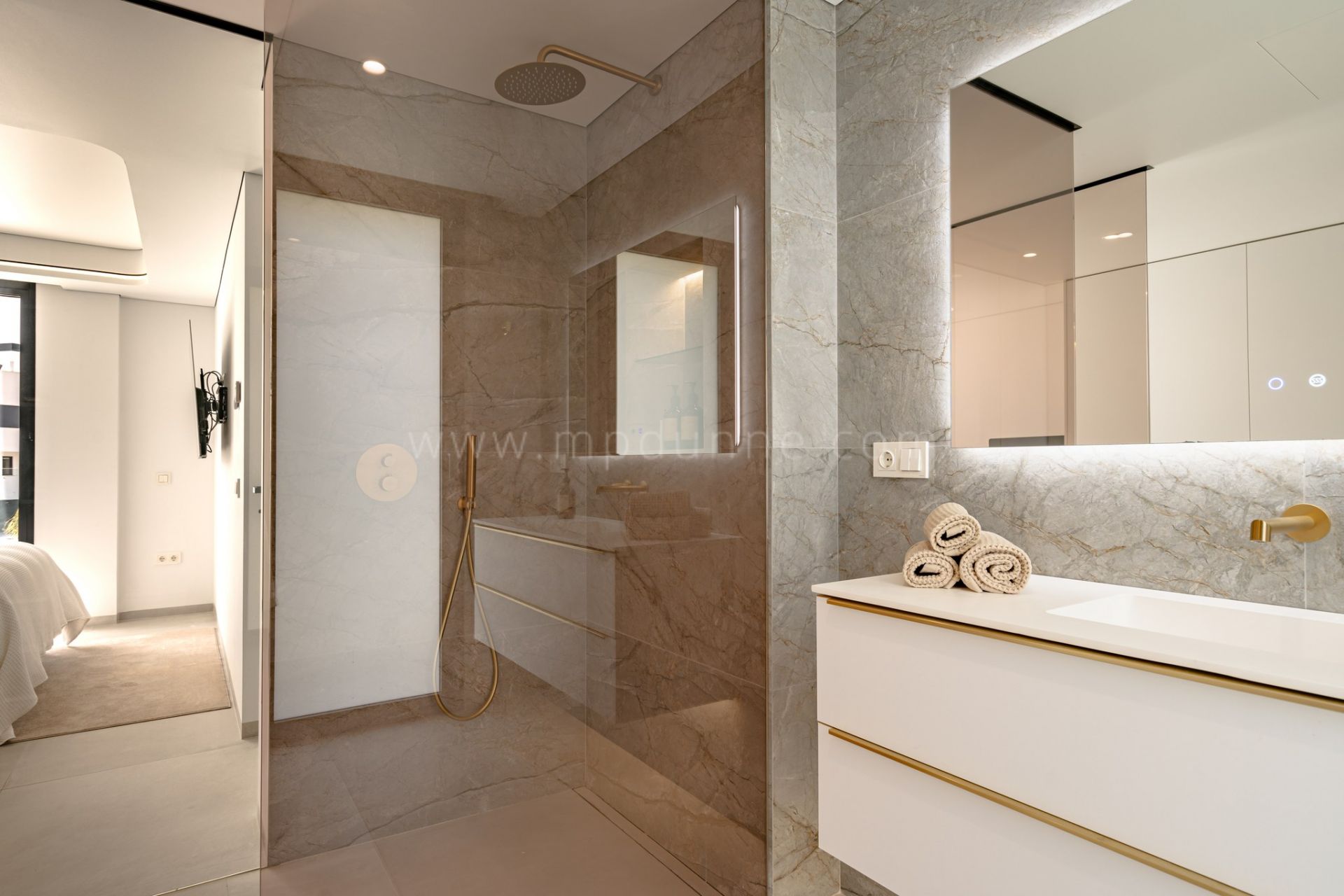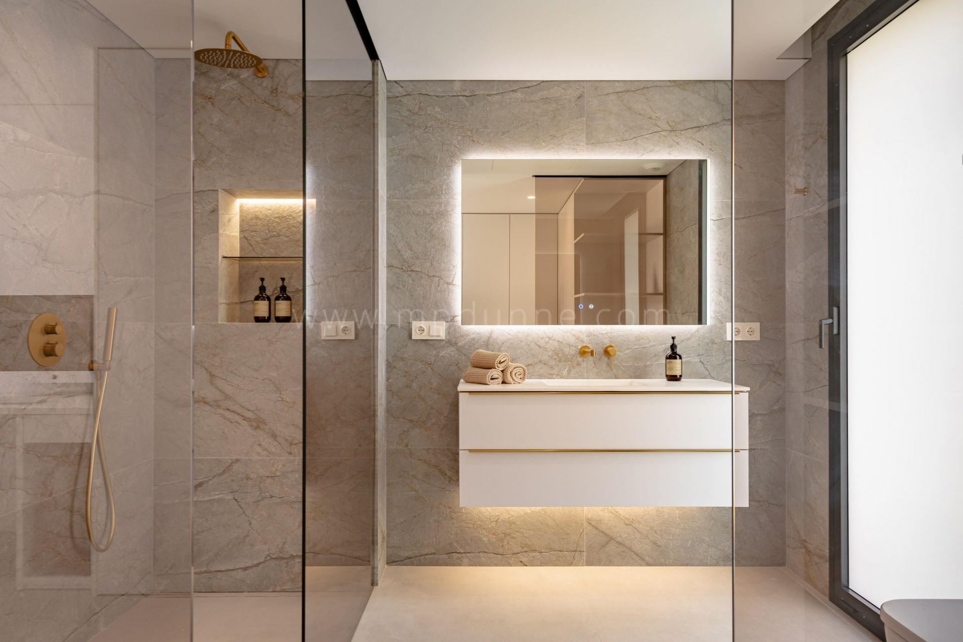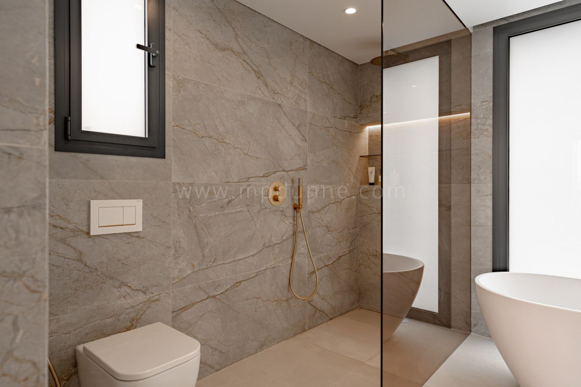 The villa’s four bedrooms are bright and well-proportioned, including a main suite with a walk-in wardrobe, private terrace access, and an en-suite bathroom. Interiors are completed with elegant finishes and considered details, offering a sense of understated luxury.