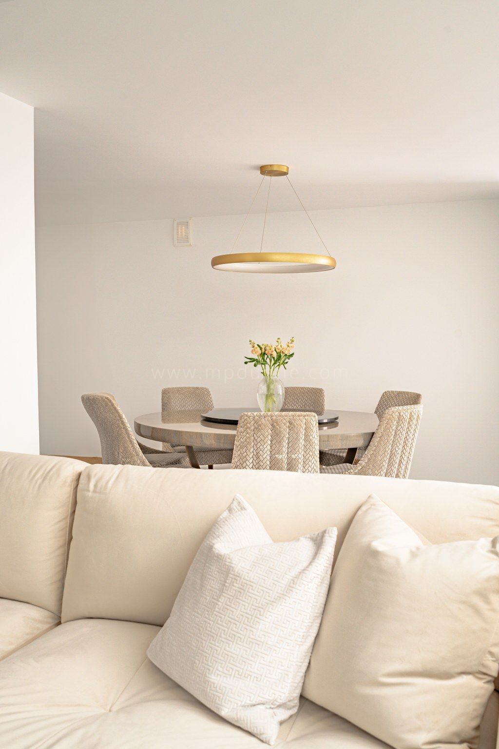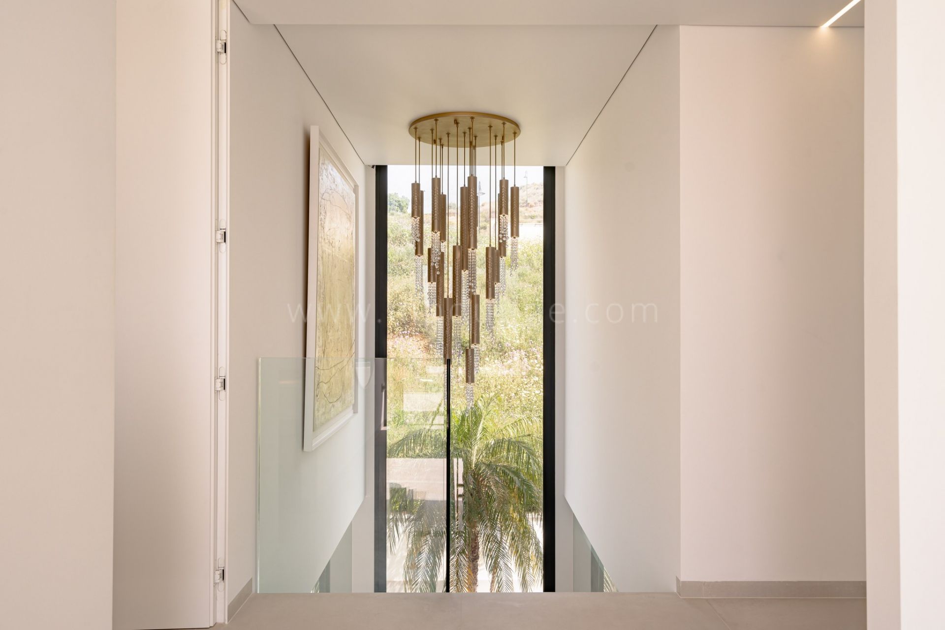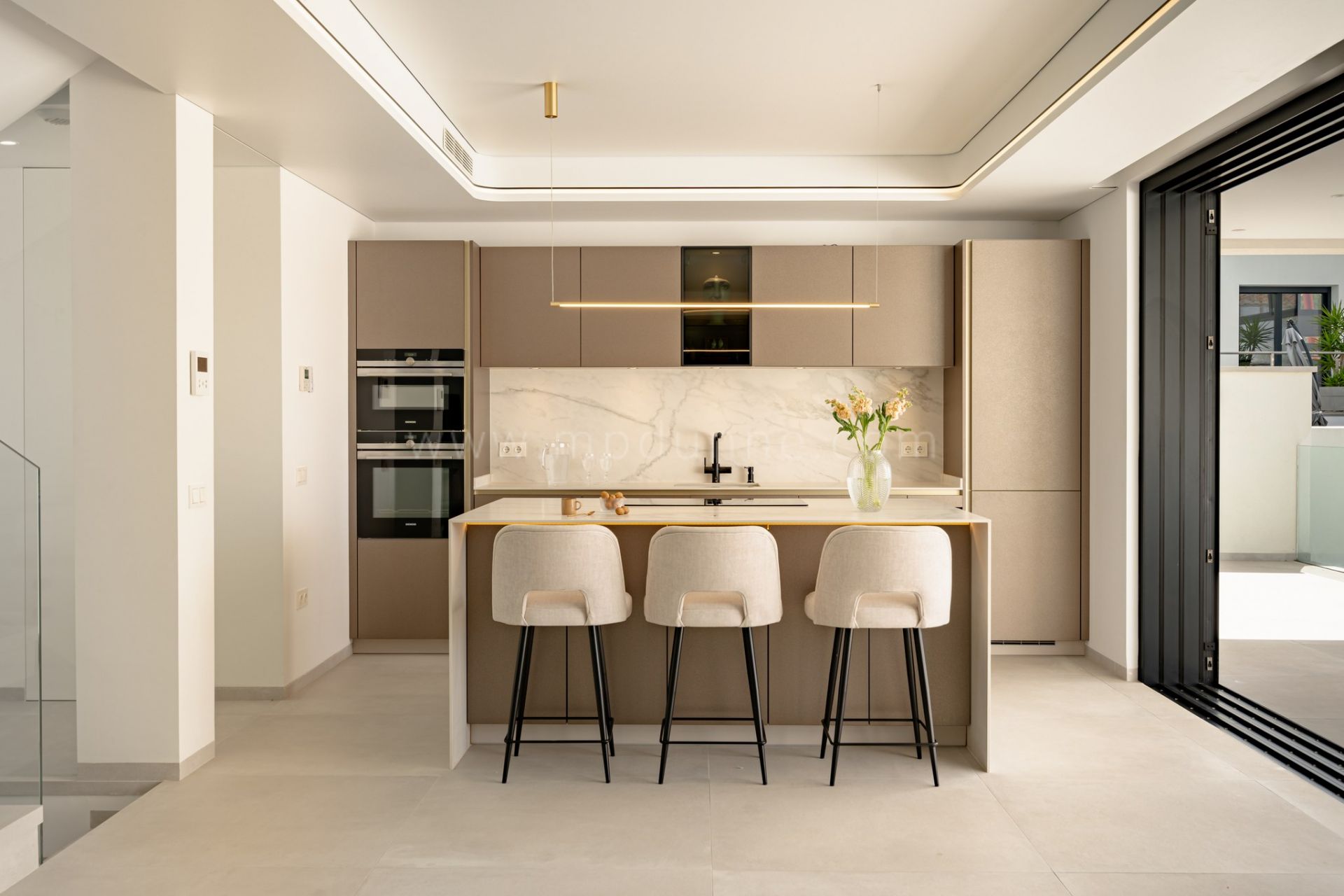 A short stroll leads to the beach, nearby golf courses, and the vibrant village centre, placing convenience and leisure within easy reach. Designed with comfort and style in mind, the villa features a spacious open-plan living and dining area with floor-to-ceiling windows, creating seamless connections to the outdoor terraces. The kitchen, fitted with high-quality appliances and a central island, provides a practical yet sophisticated space for everyday life and entertaining.