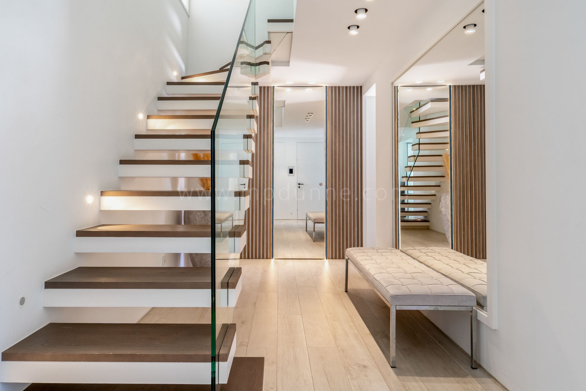 The entrance level hosts two elegant en-suite bedrooms, each designed with comfort and privacy in mind. One benefits from its own west-facing terrace, ideal for afternoon light. A guest aseo and carefully selected finishes reinforce the considered design throughout.
