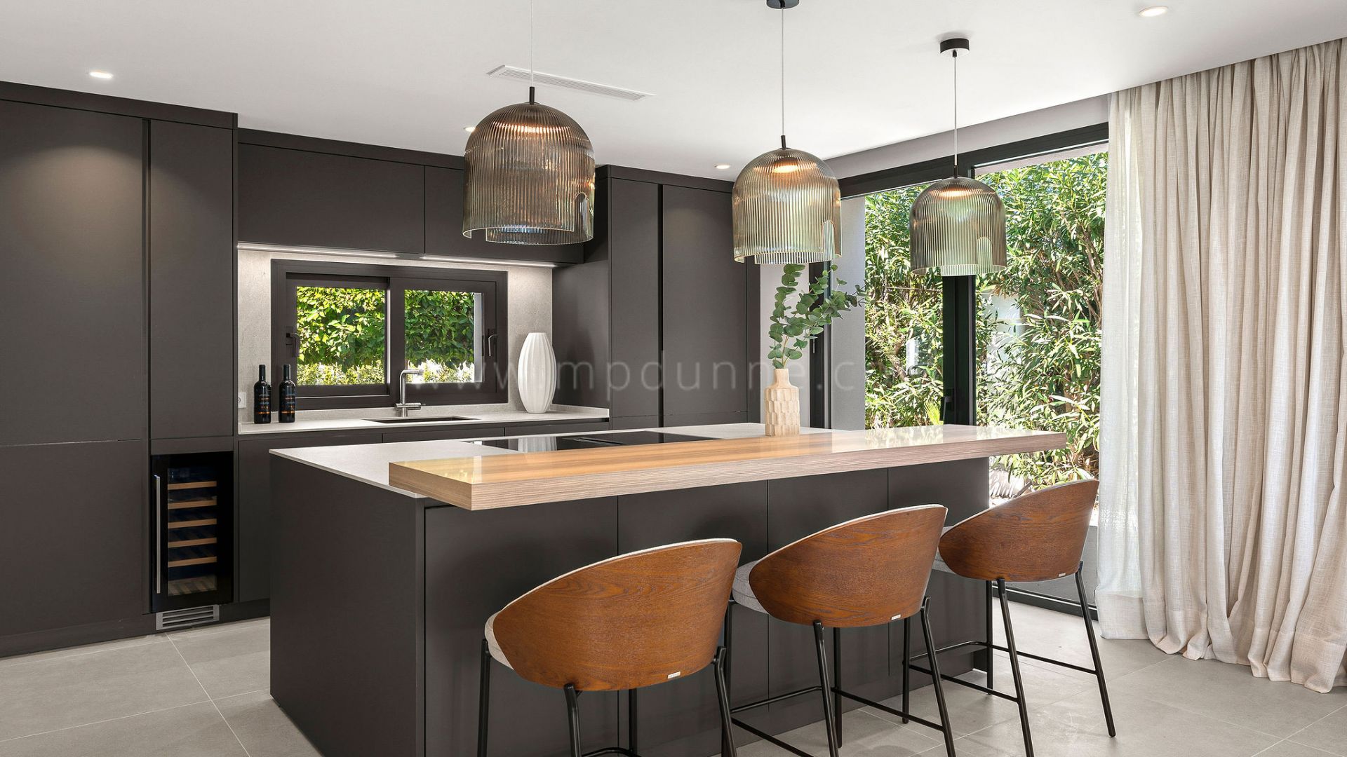 Arranged over three well-planned levels, the interior offers bright, well-proportioned living spaces designed for both everyday comfort and entertaining. The main living room connects naturally with generous terraces, creating a fluid transition between indoor and outdoor areas and allowing the sea views to be enjoyed from multiple vantage points. A modern open-plan kitchen and dining area form the social centre of the home, with clean lines, quality materials and a layout that works equally well for family life or hosting.