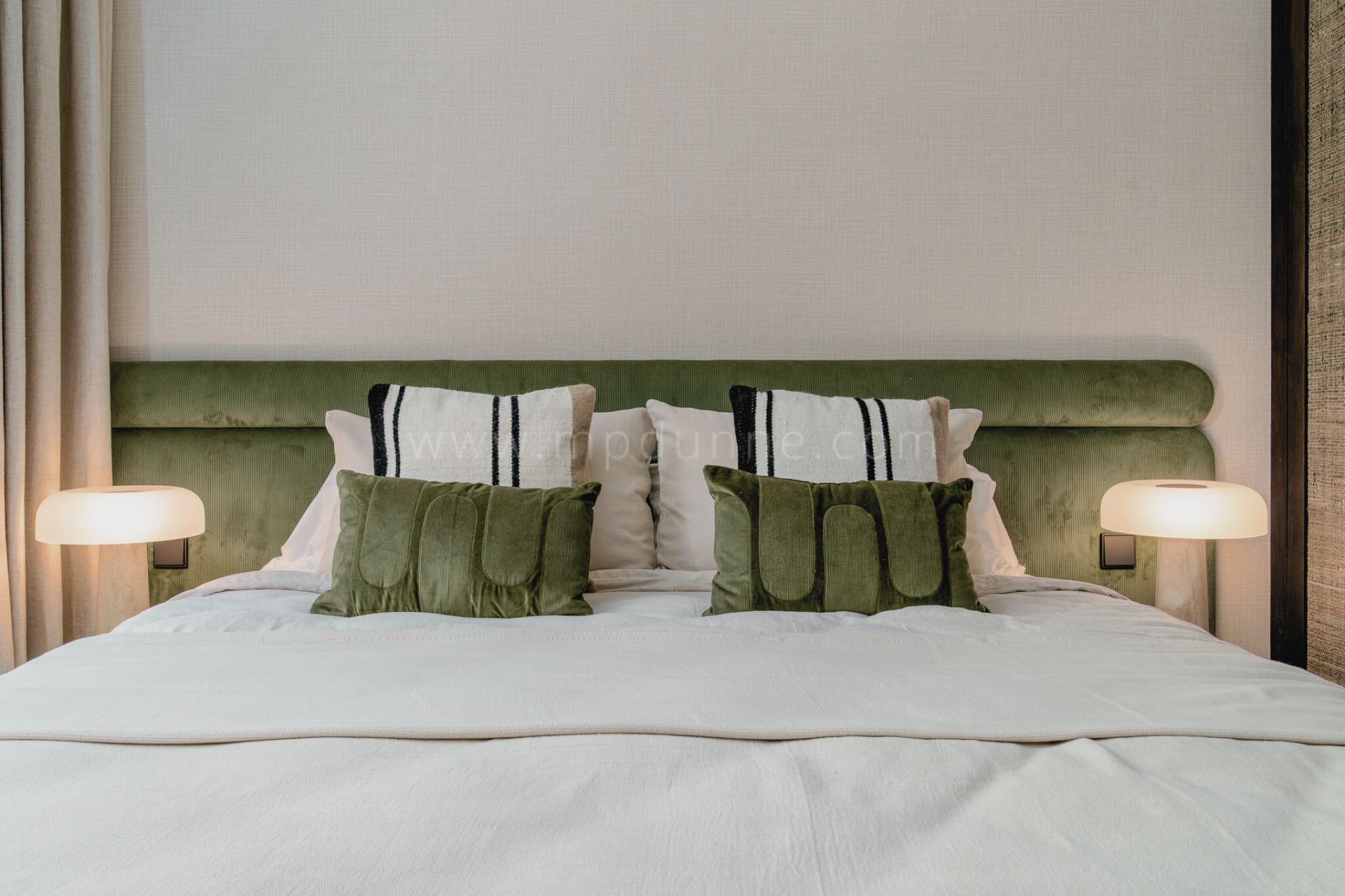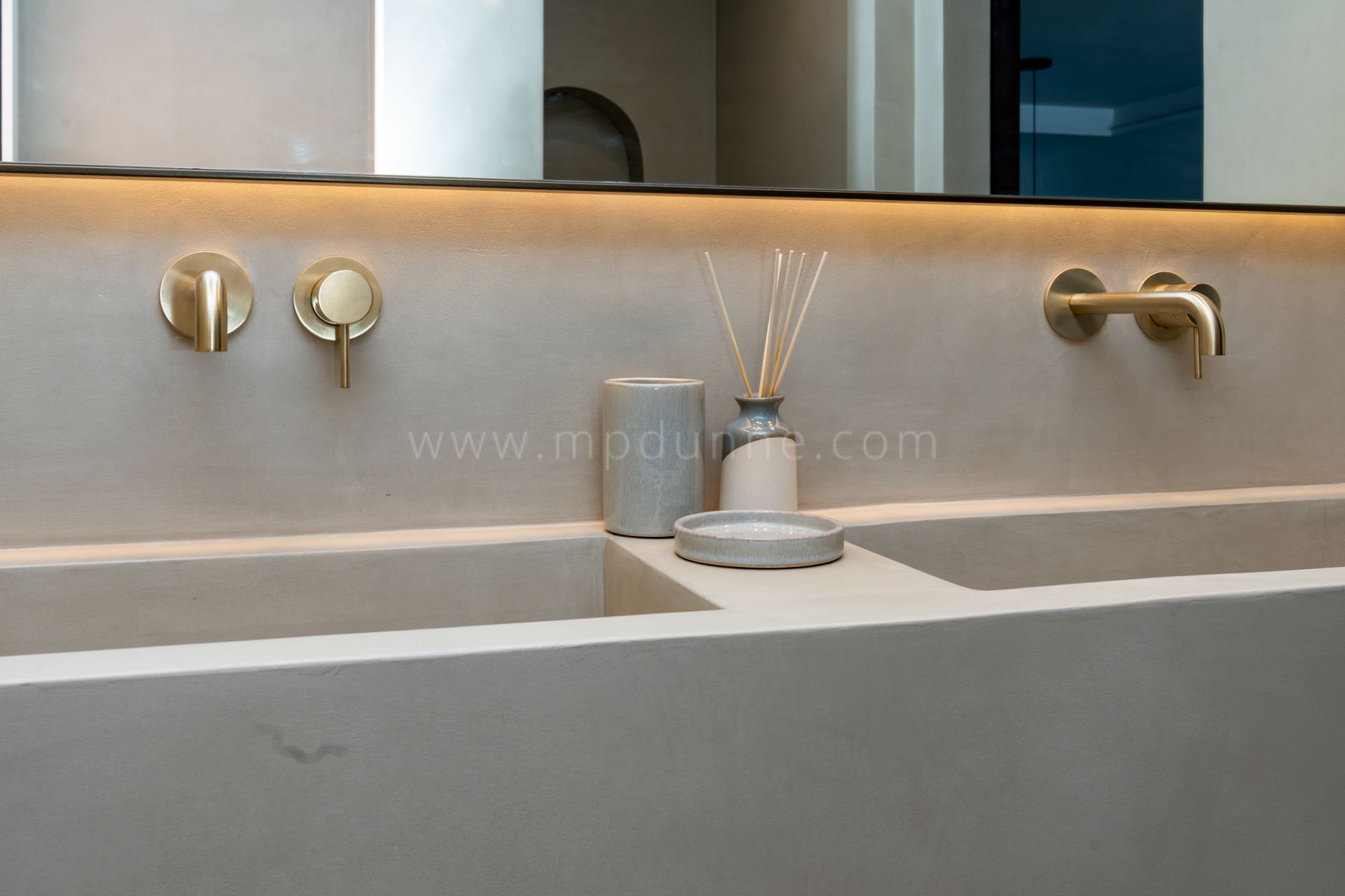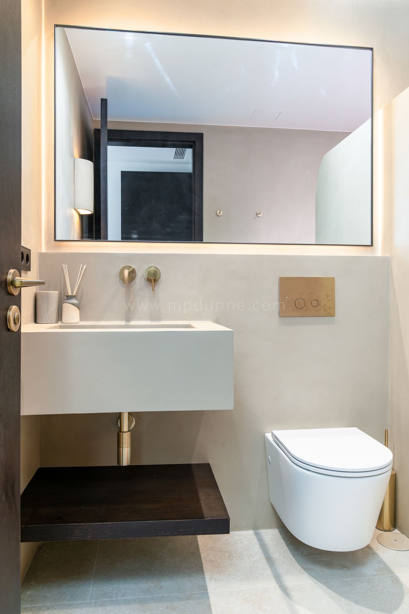 The high-end kitchen is finished in an elegant cashmere tone and equipped with premium Siemens appliances, a Bora induction hob with integrated extractor, and a stunning Inalco Jasper porcelain worktop that wraps seamlessly around the island. Indirect lighting enhances the space, adding a sleek, contemporary touch. Bathrooms continue the theme of understated luxury, featuring warm microcement finishes, custom mirrors with soft ambient lighting, and matte champagne fixtures.