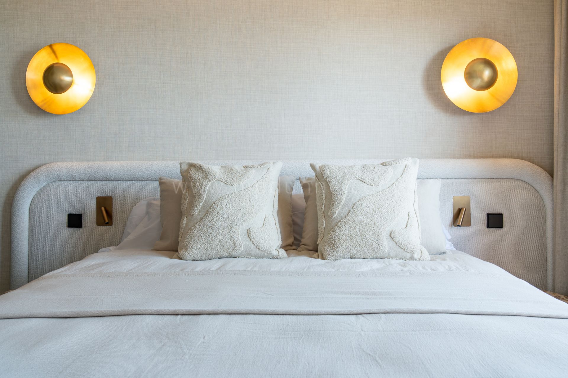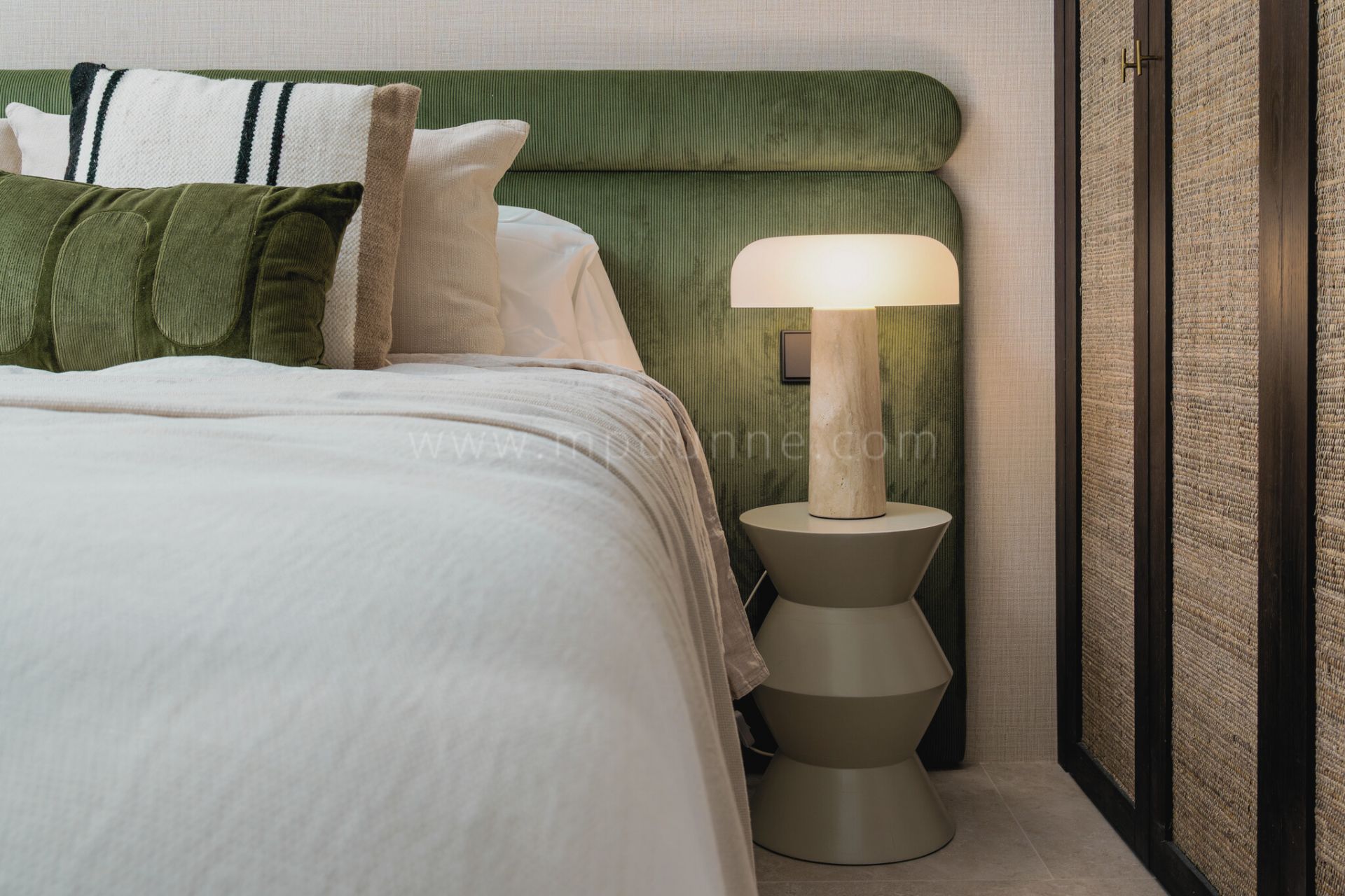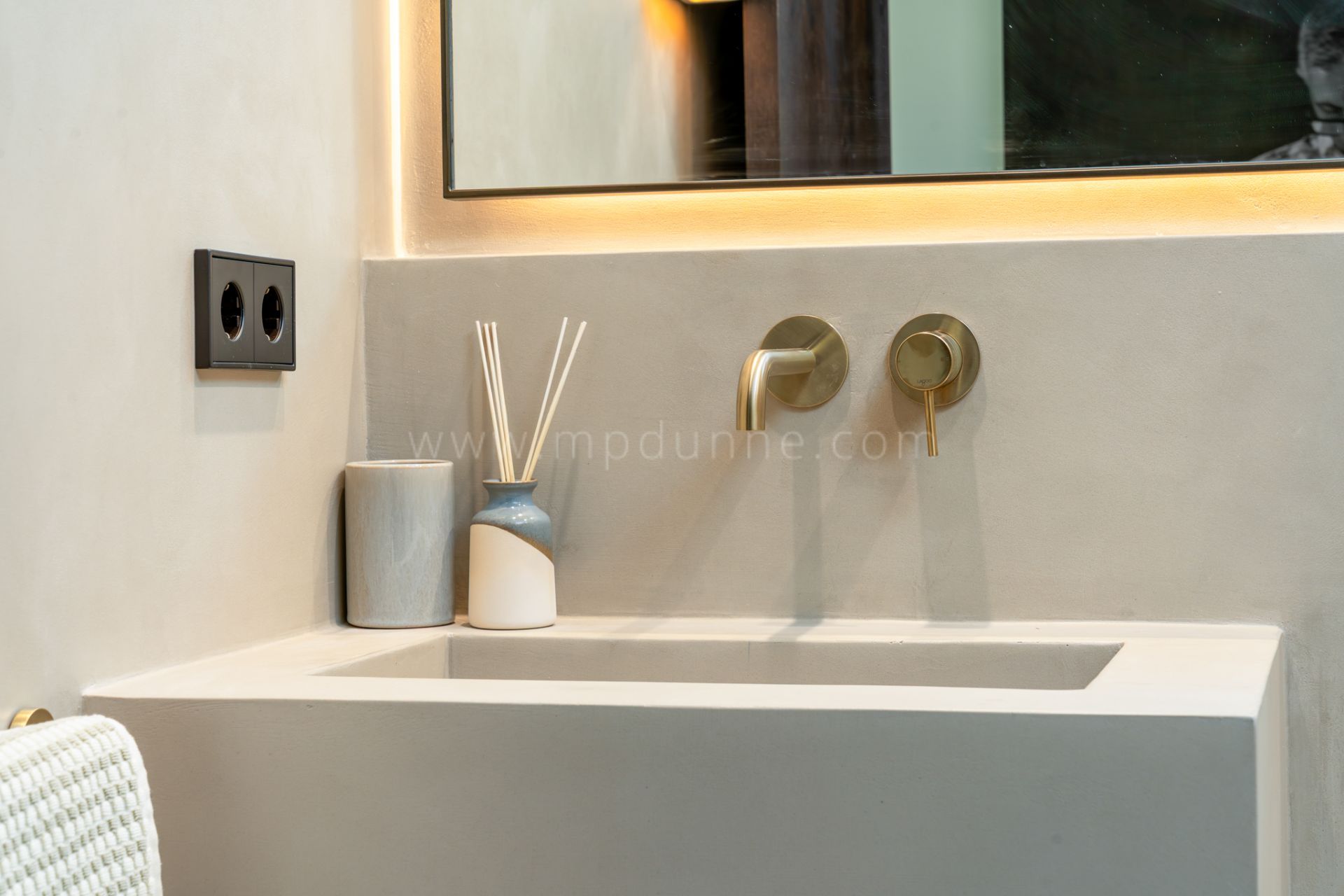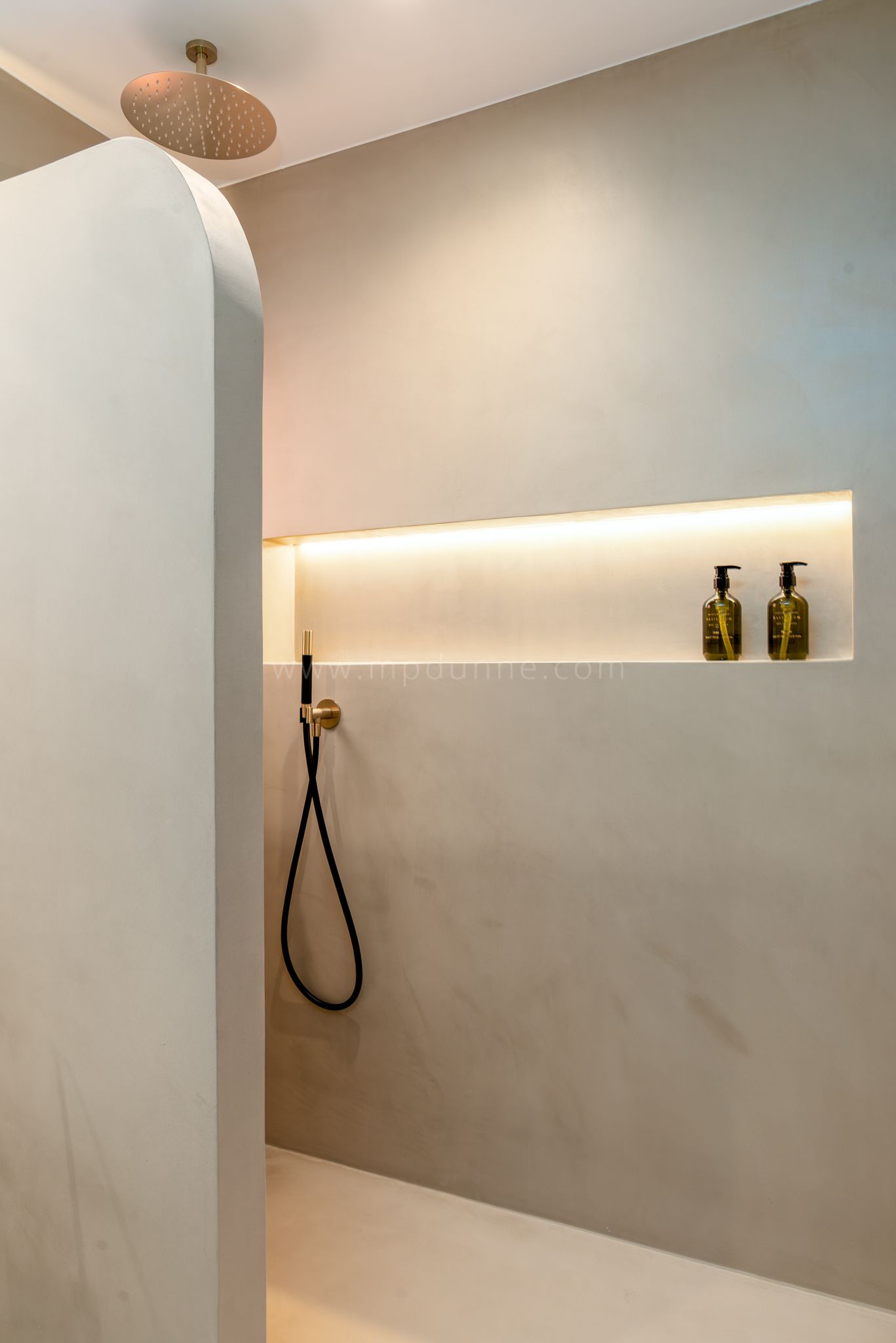 The high-end kitchen is finished in an elegant cashmere tone and equipped with premium Siemens appliances, a Bora induction hob with integrated extractor, and a stunning Inalco Jasper porcelain worktop that wraps seamlessly around the island. Indirect lighting enhances the space, adding a sleek, contemporary touch. Bathrooms continue the theme of understated luxury, featuring warm microcement finishes, custom mirrors with soft ambient lighting, and matte champagne fixtures.