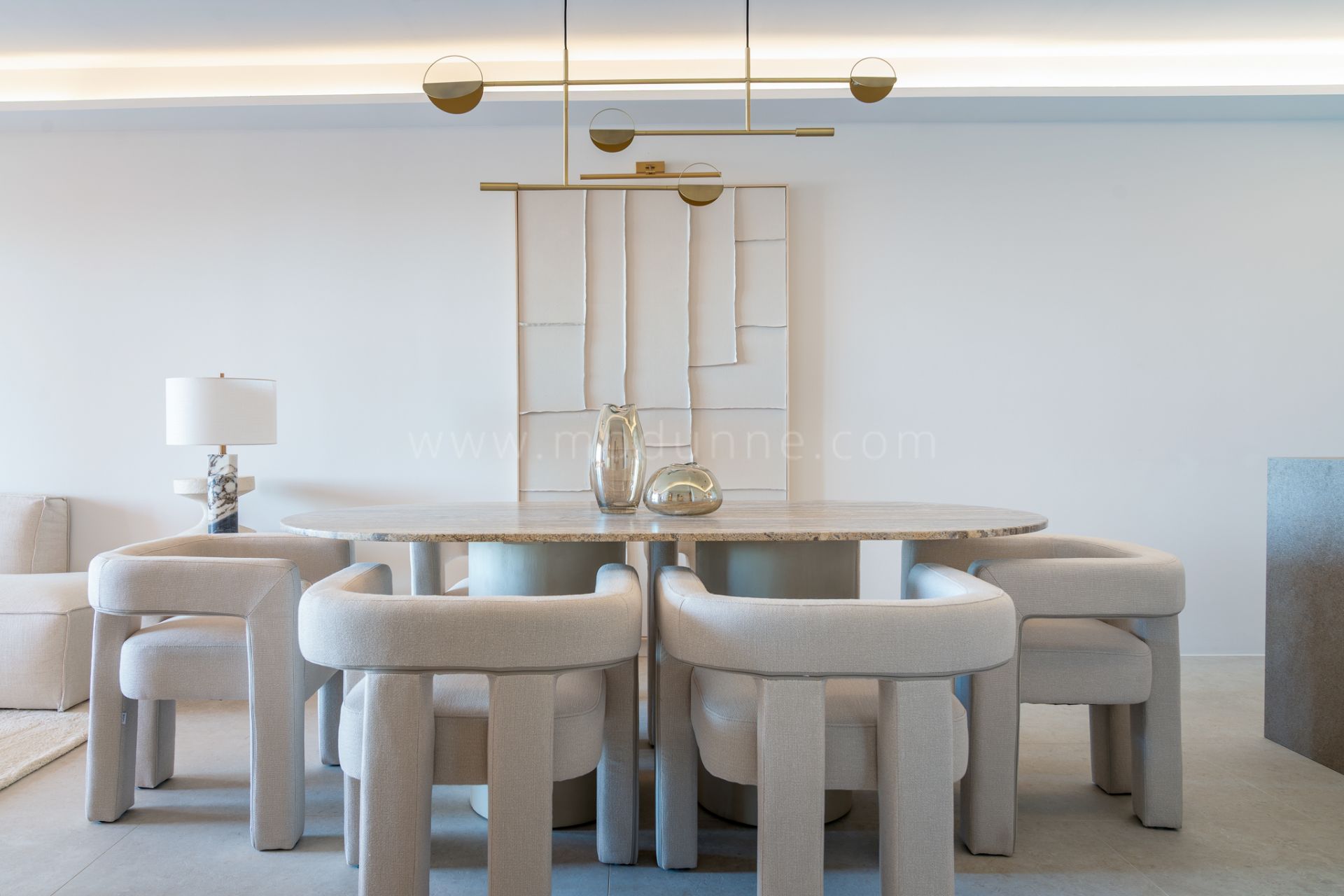 Inside, a refined open-plan layout blends soft neutral tones, warm wood accents, and carefully selected design furniture to create a calm and luxurious atmosphere. The dining area embodies sculptural harmony, where organic shapes and geometric precision come together to form a visually striking focal point. A private garage space is included in the price for added convenience.