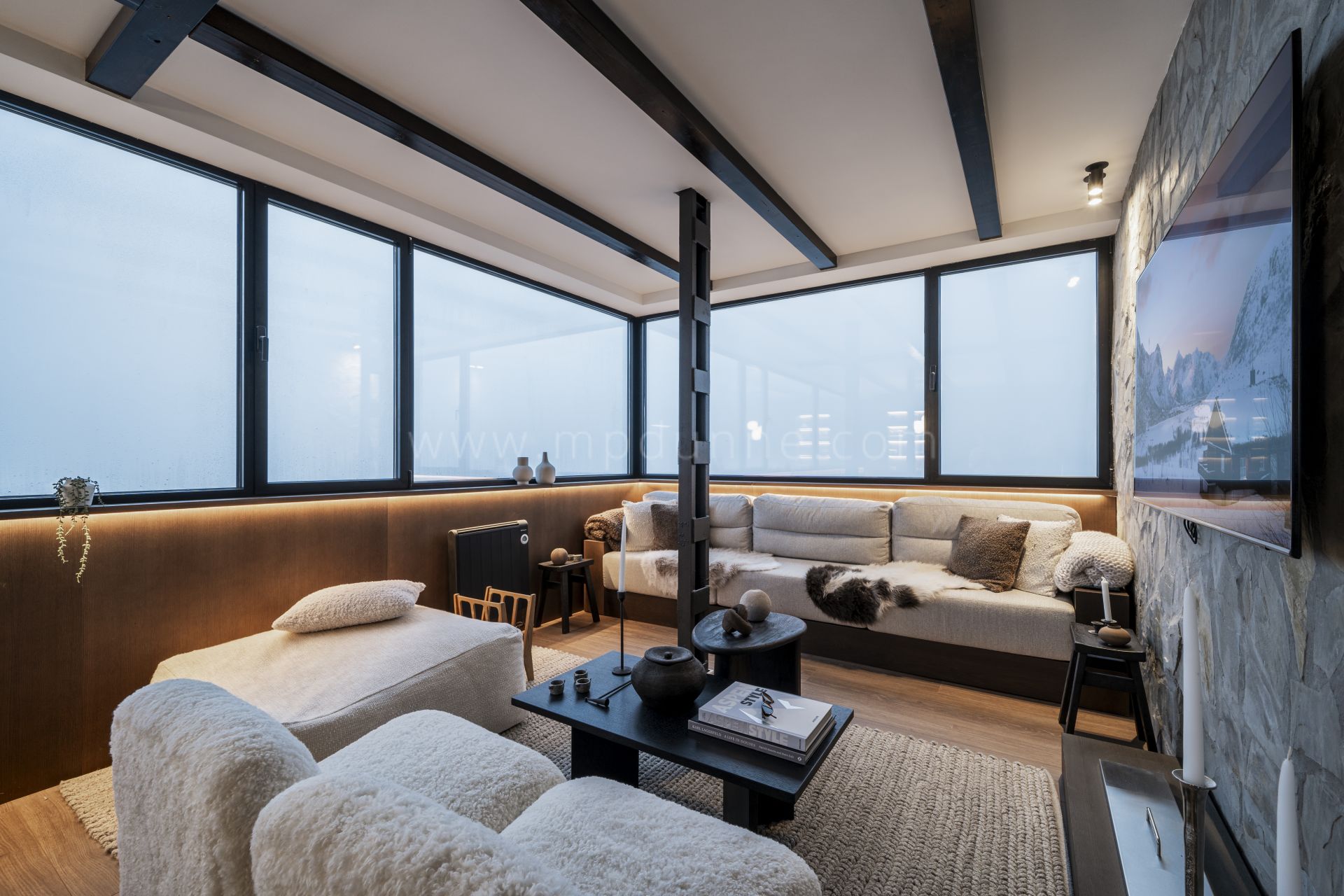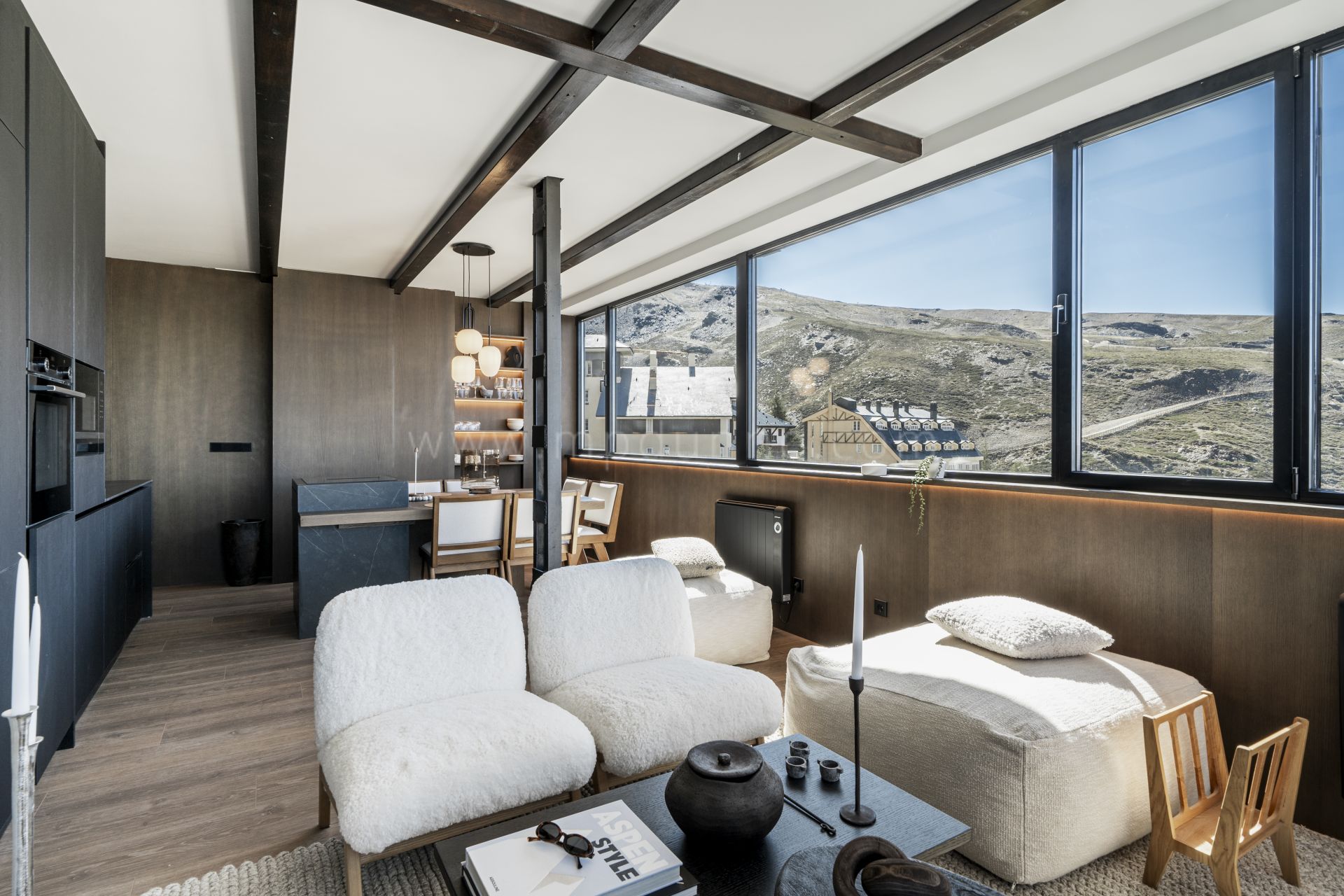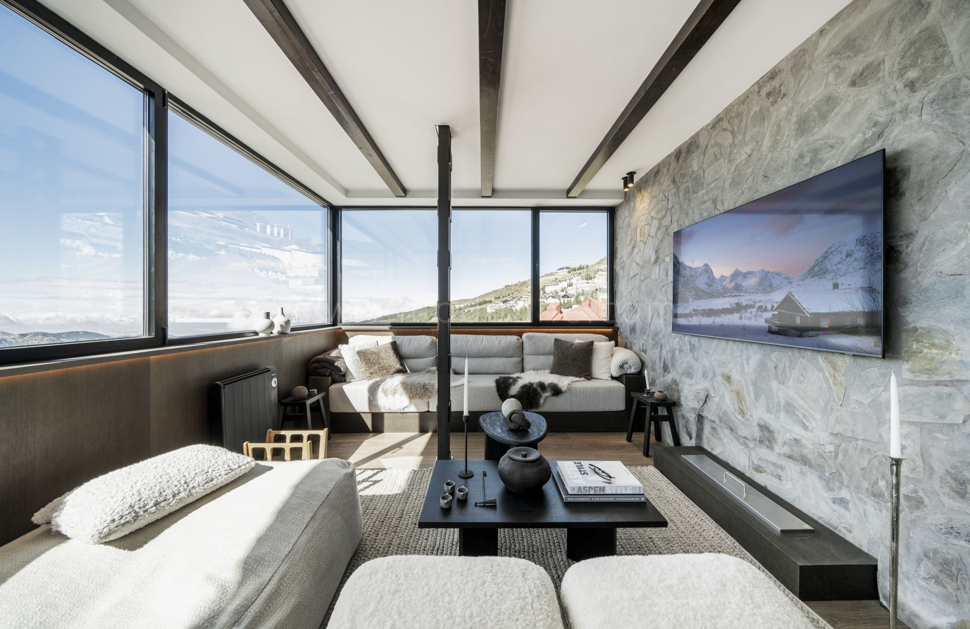This top-floor apartment offers a true Scandinavian retreat in the heart of the Sierra Nevada. Thoughtfully designed for comfort during the colder months, it blends functionality with warmth. Features include a drying cabinet at the entrance, ethanol fireplace, faux-fur throws, a custom-built sauna, towel warmers in every bathroom, and a freestanding bathtub with views across the mountains. Underfloor and radiator heating ensure consistent indoor comfort, while candles and woven textiles enhance the inviting atmosphere.