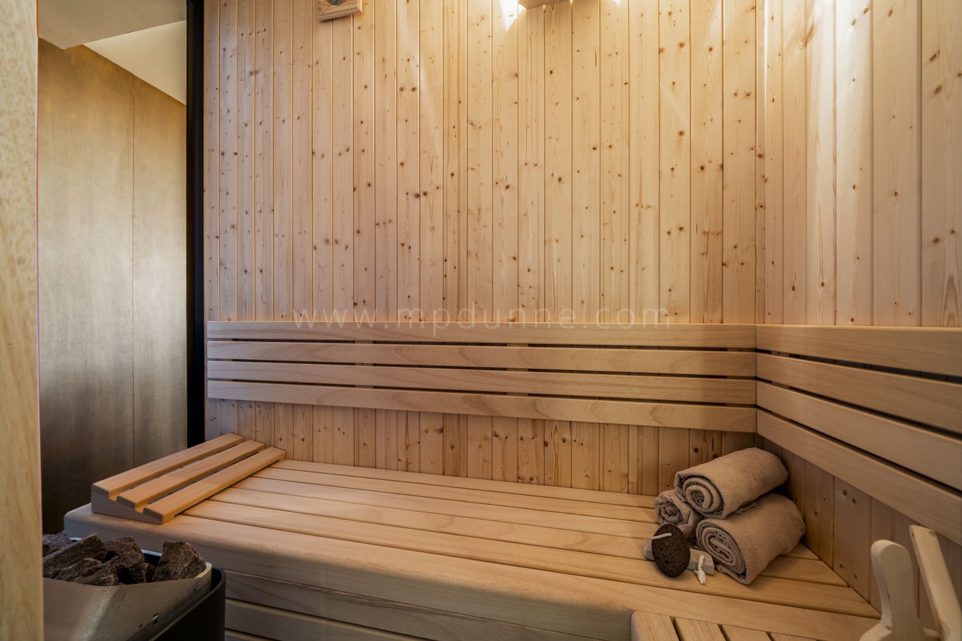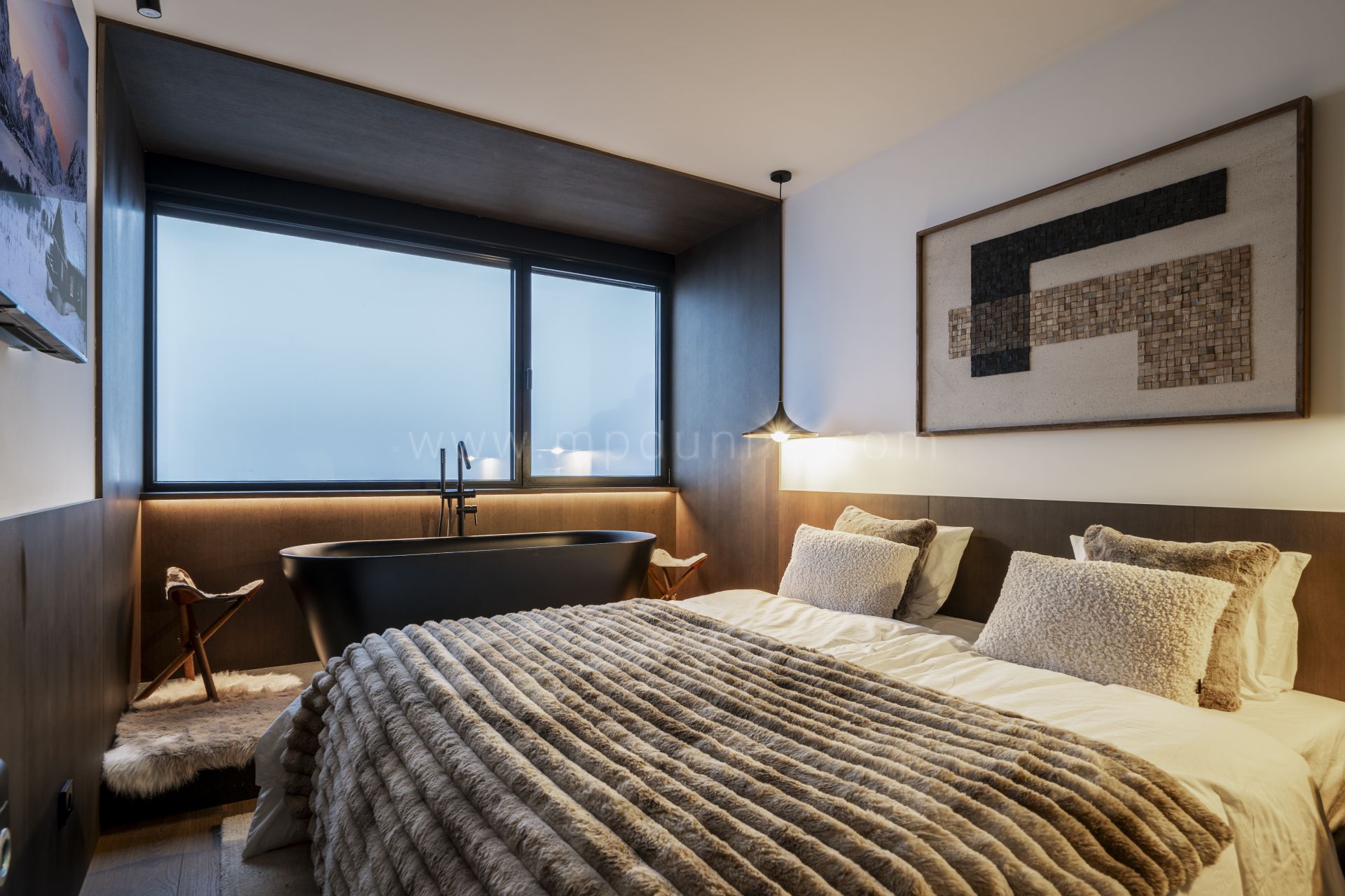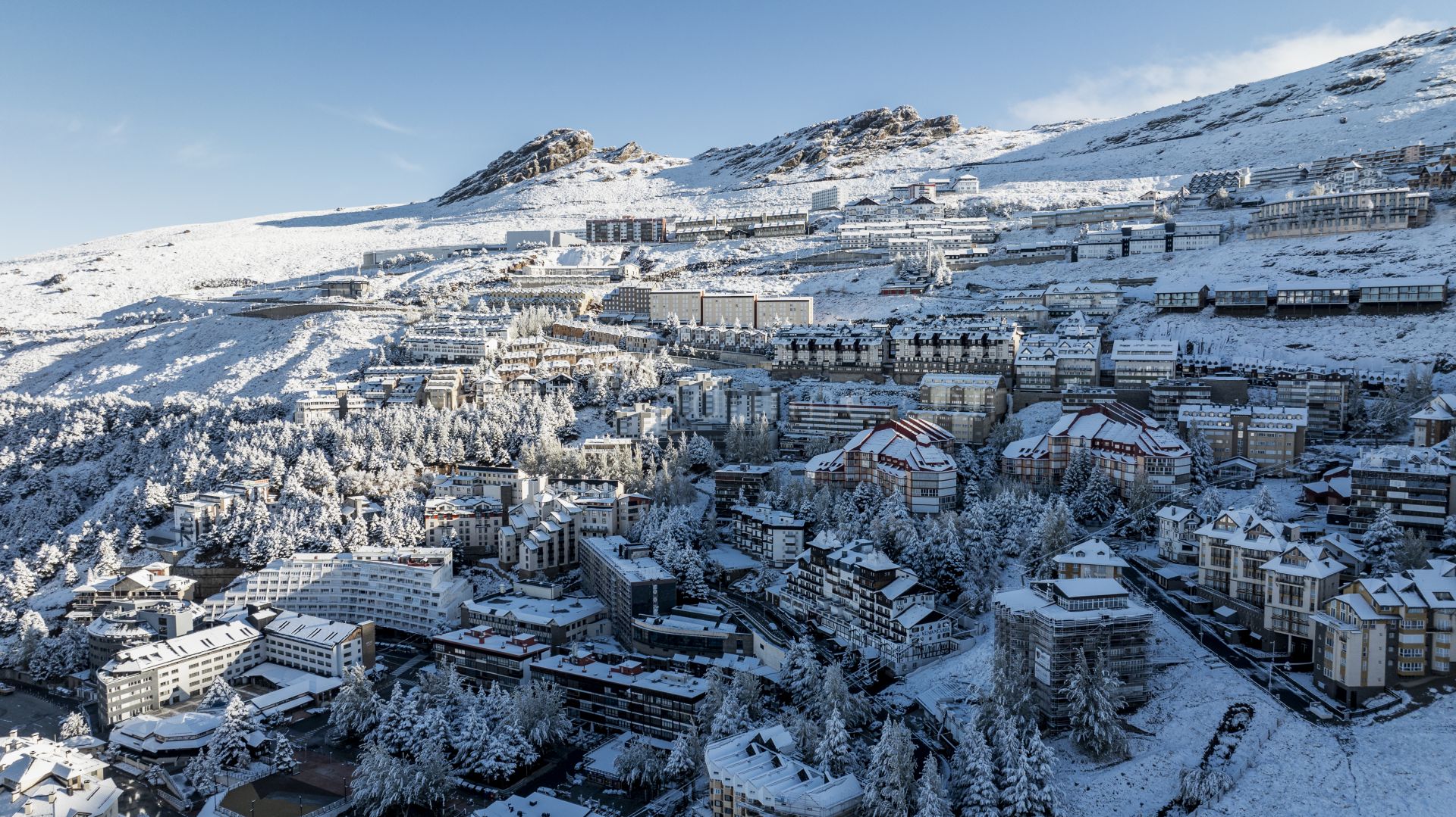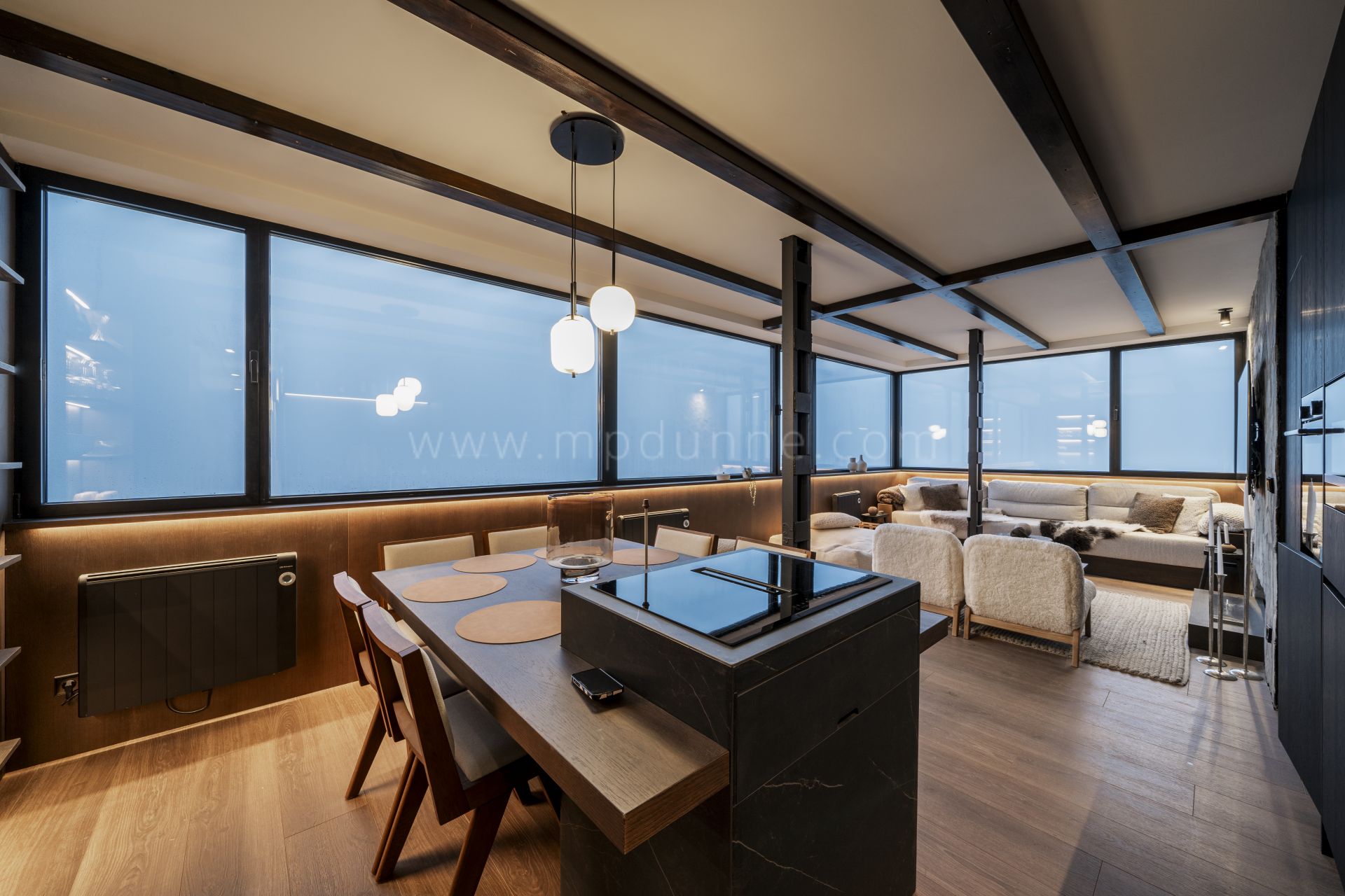 This top-floor apartment offers a true Scandinavian retreat in the heart of the Sierra Nevada. Thoughtfully designed for comfort during the colder months, it blends functionality with warmth. Features include a drying cabinet at the entrance, ethanol fireplace, faux-fur throws, a custom-built sauna, towel warmers in every bathroom, and a freestanding bathtub with views across the mountains. Underfloor and radiator heating ensure consistent indoor comfort, while candles and woven textiles enhance the inviting atmosphere.