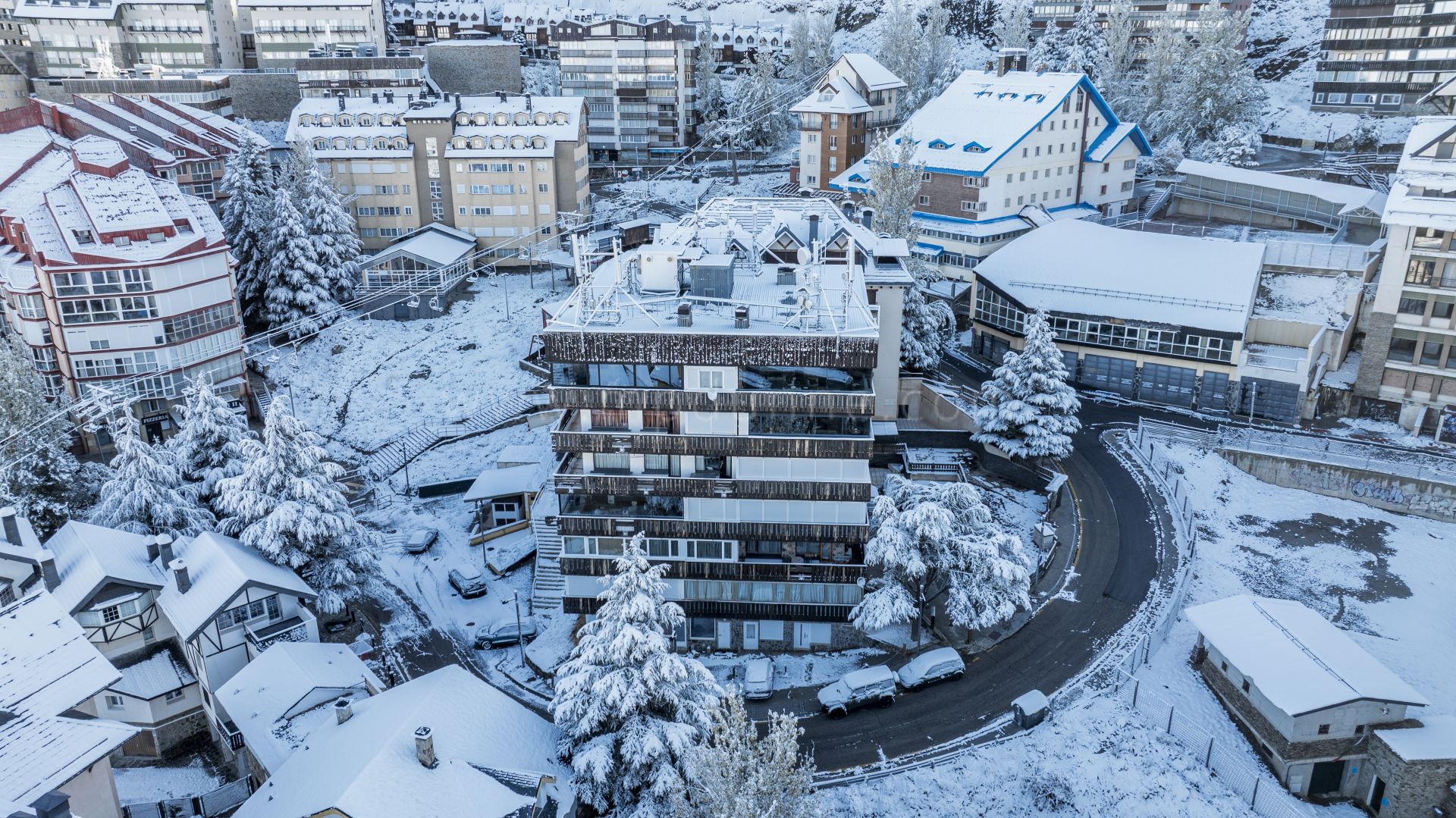 The apartment includes two bedrooms with views, two full bathrooms (one with a sauna), a guest toilet, and a main suite with an en-suite bathroom and soaking tub overlooking the landscape. Ideally positioned just steps from the newly refurbished El Lodge Hotel and the ski lifts, the property also includes a private garage for added convenience.