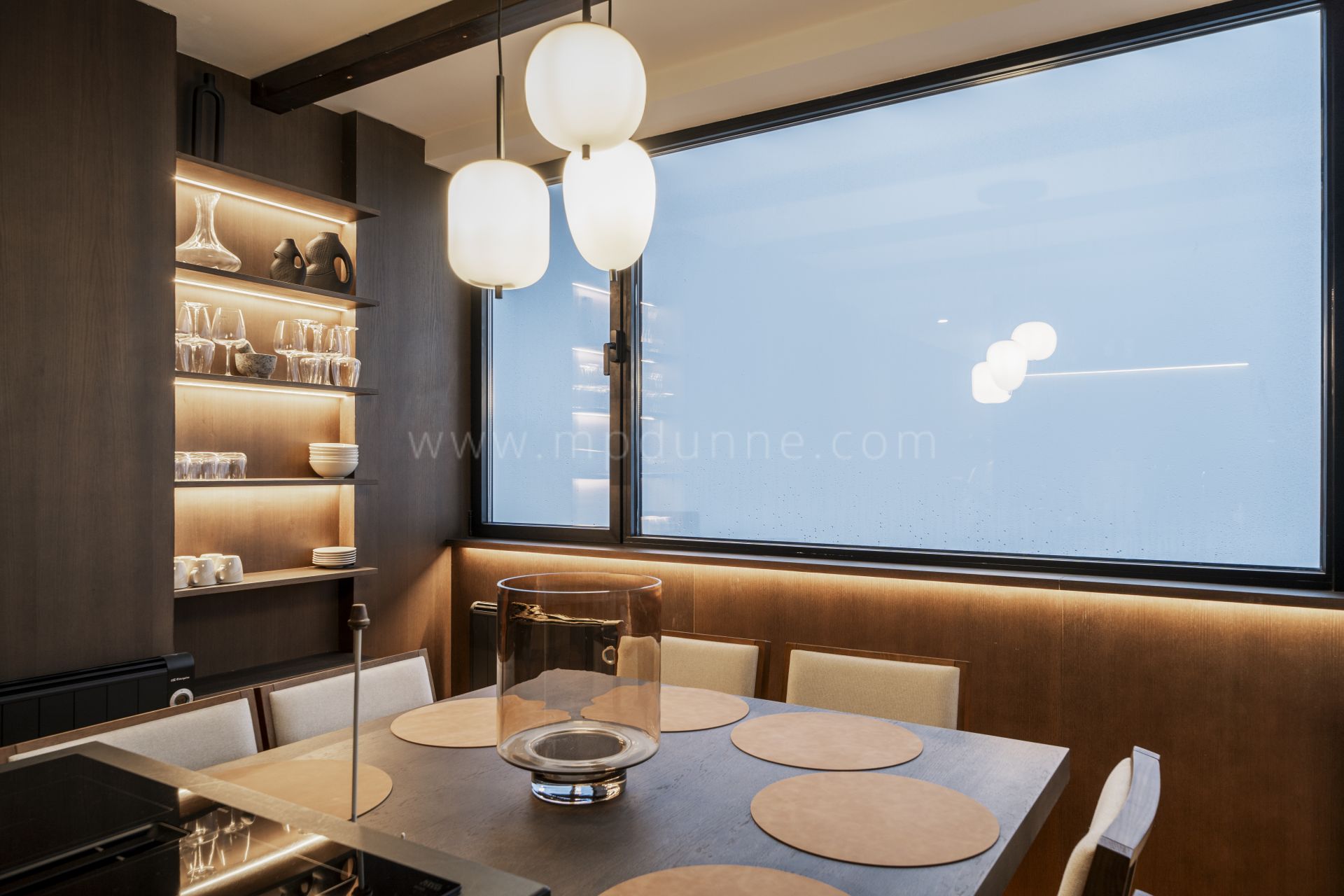 Accessed by lift, the apartment opens into a hallway with natural stone detailing and underfloor heating. The main living area combines a custom-designed kitchen with Siemens appliances and an open-plan lounge. A central island with a ceramic hob and bar seating serves as a welcoming gathering point. Large windows frame wide-reaching views and fill the living space with daylight.