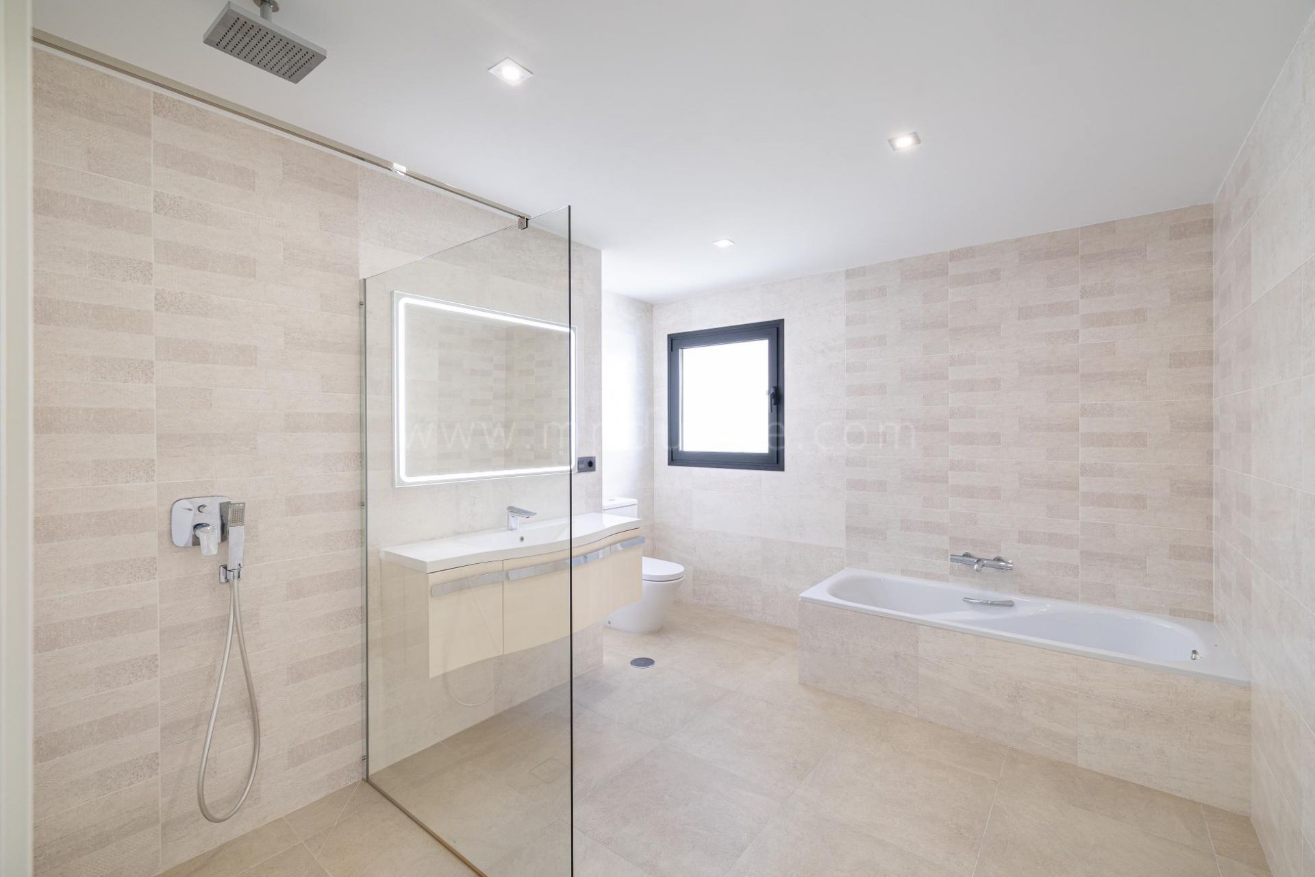 El dormitorio principal incluye una terraza privada en la planta superior, un vestidor dedicado y un lujoso baño en suite con bañera y ducha. Los tres dormitorios adicionales cuentan con armarios empotrados y baños en suite, mientras que una suite en la planta baja destaca por su amplitud. Un aseo de invitados y una zona de lavandería añaden comodidad adicional.