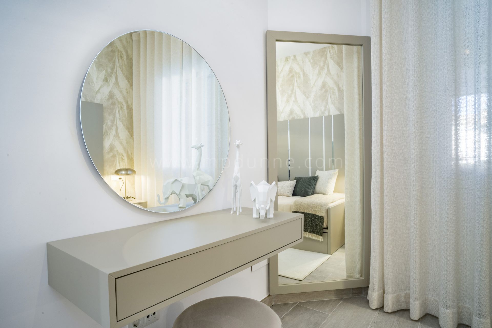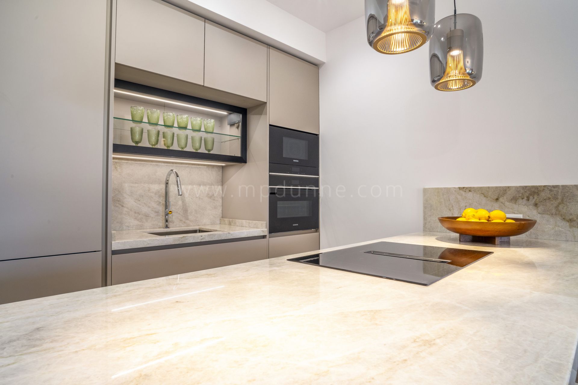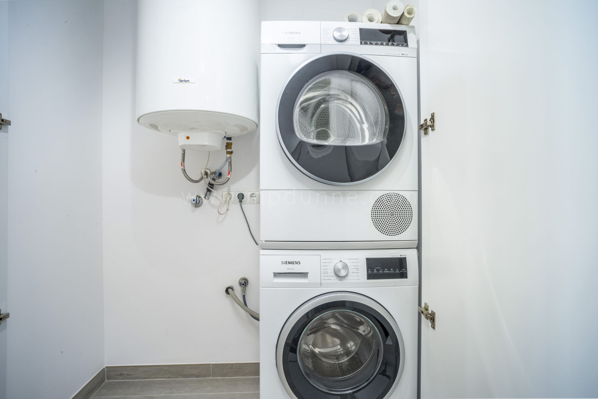 El apartamento cuenta con suelos de cerámica en toda la vivienda y amplios armarios empotrados que ofrecen un almacenamiento generoso. La cocina está equipada con encimeras de mármol y electrodomésticos Siemens, incluyendo lavadora y secadora. Todas las habitaciones disponen de persianas eléctricas para mayor seguridad y confort.