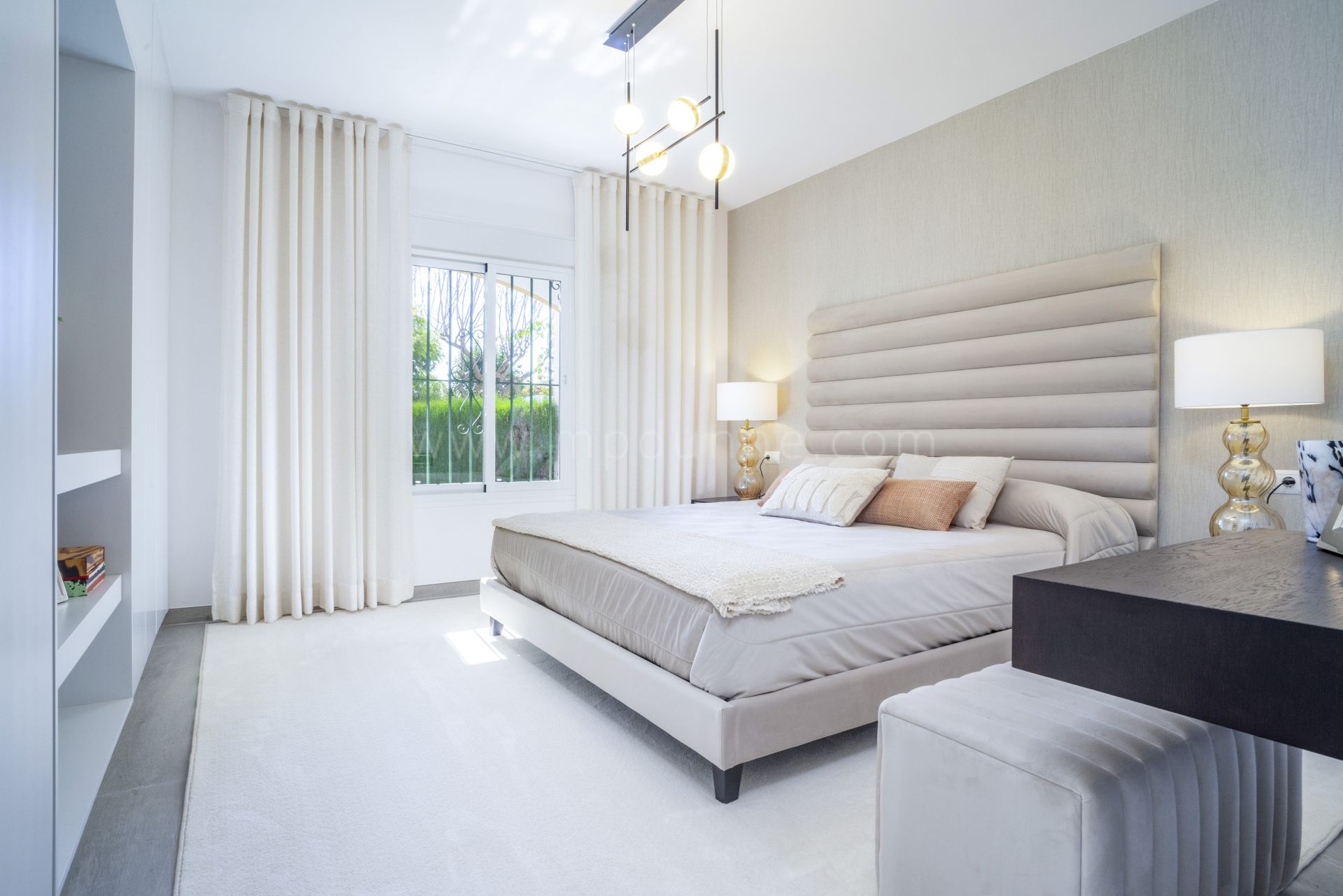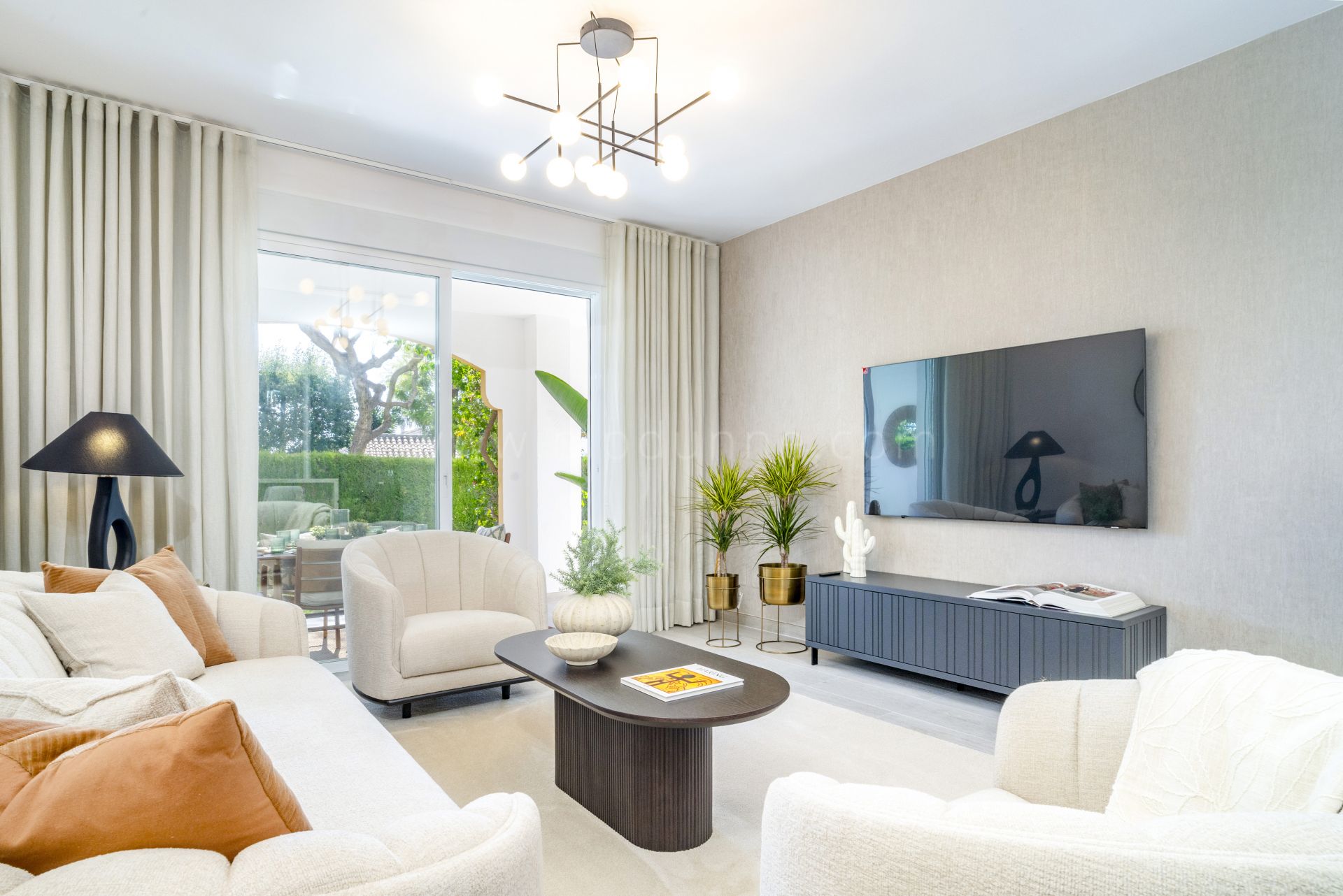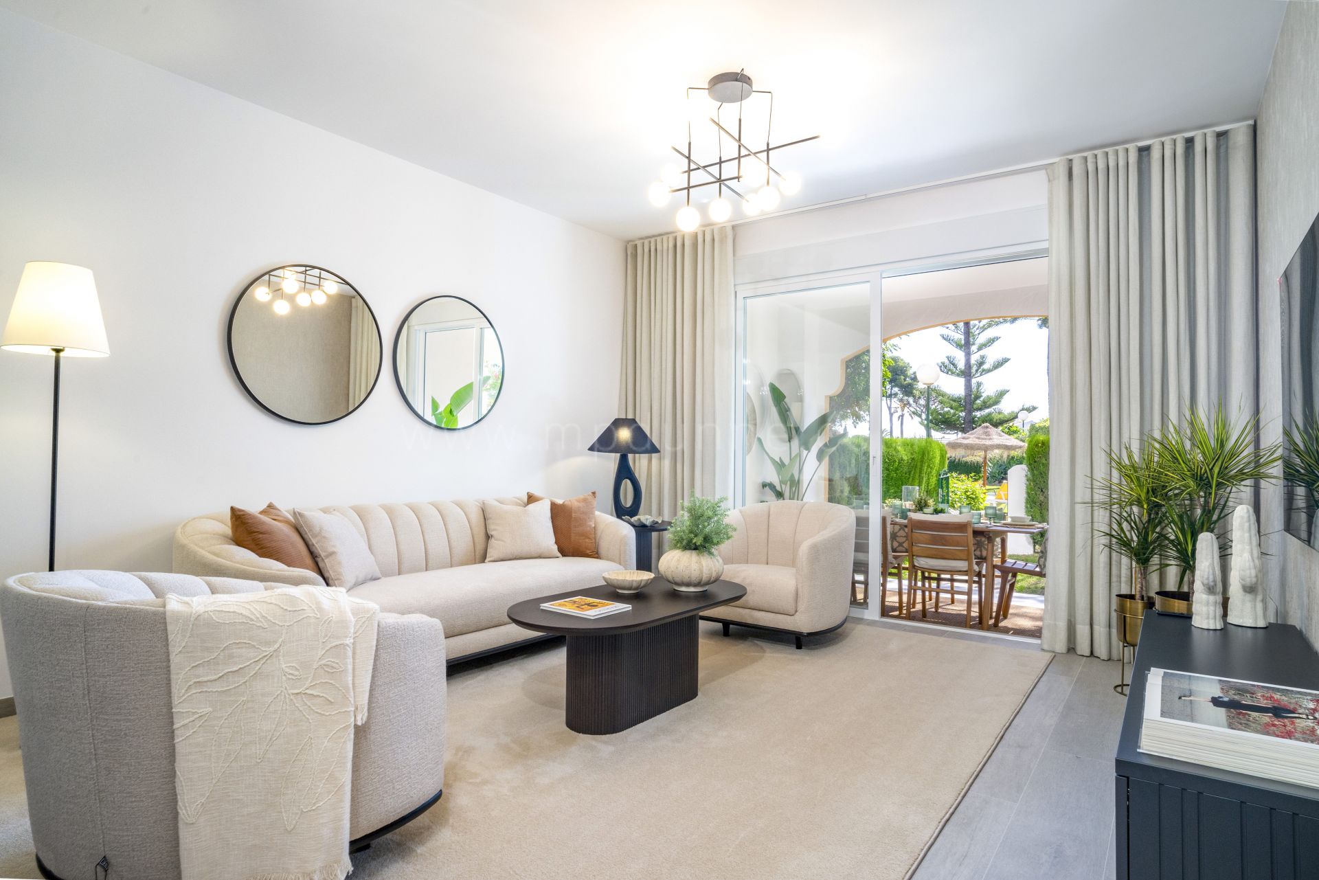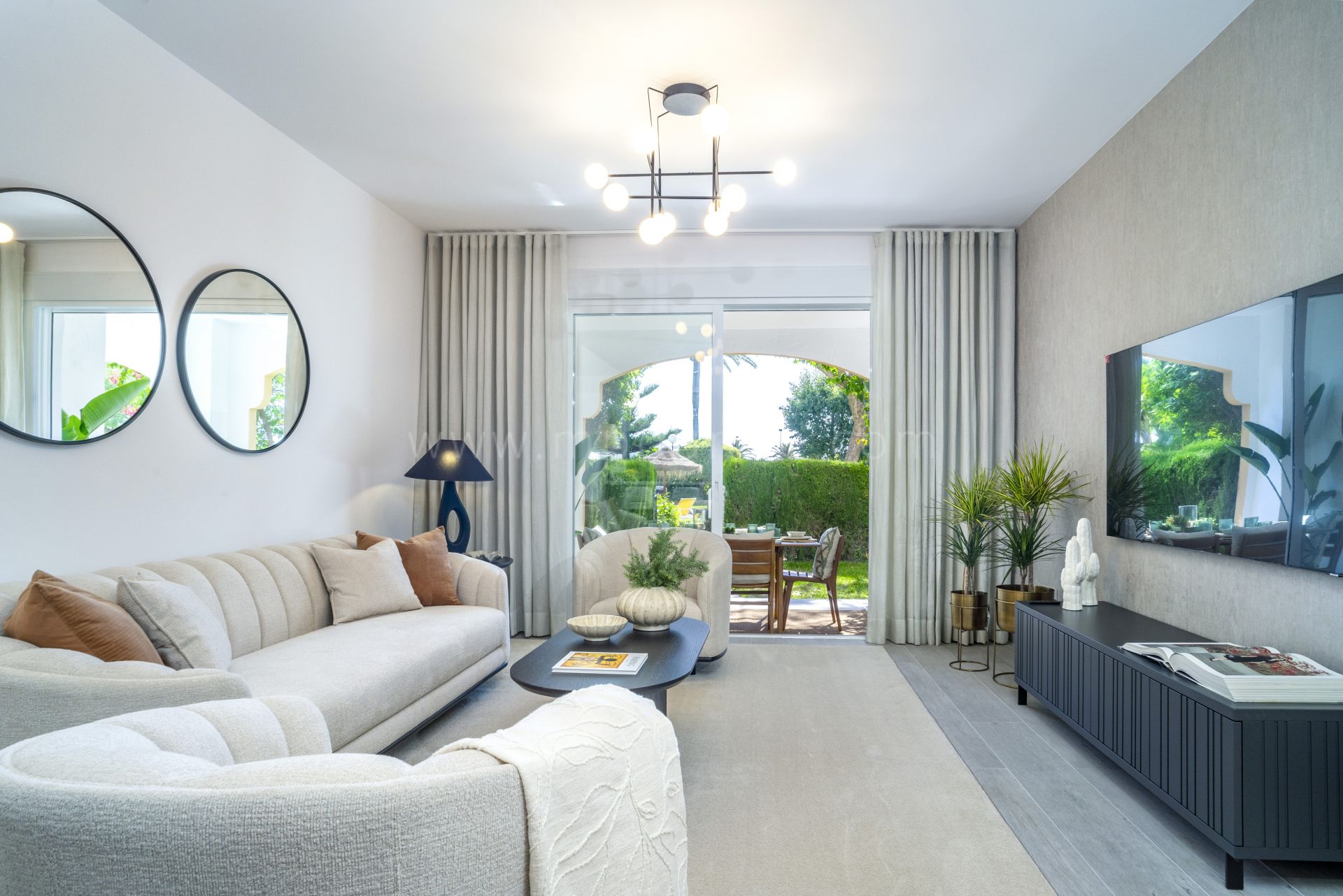 Este apartamento en planta baja con jardín, totalmente reformado, está situado en una urbanización muy demandada en Nueva Andalucía. Ofrece tres dormitorios y dos baños, incluyendo una suite principal con baño privado, combinando diseño práctico con comodidades modernas.
