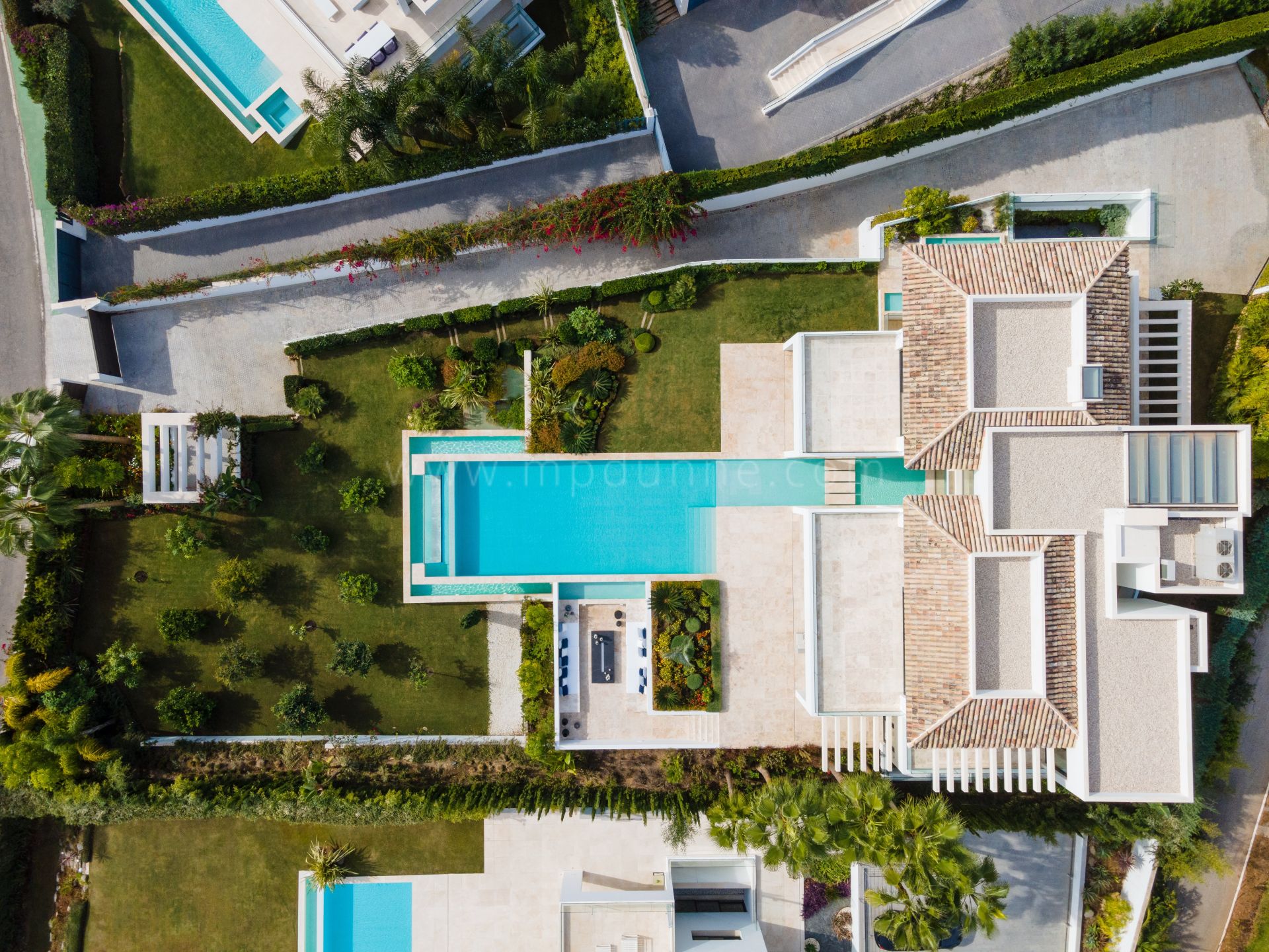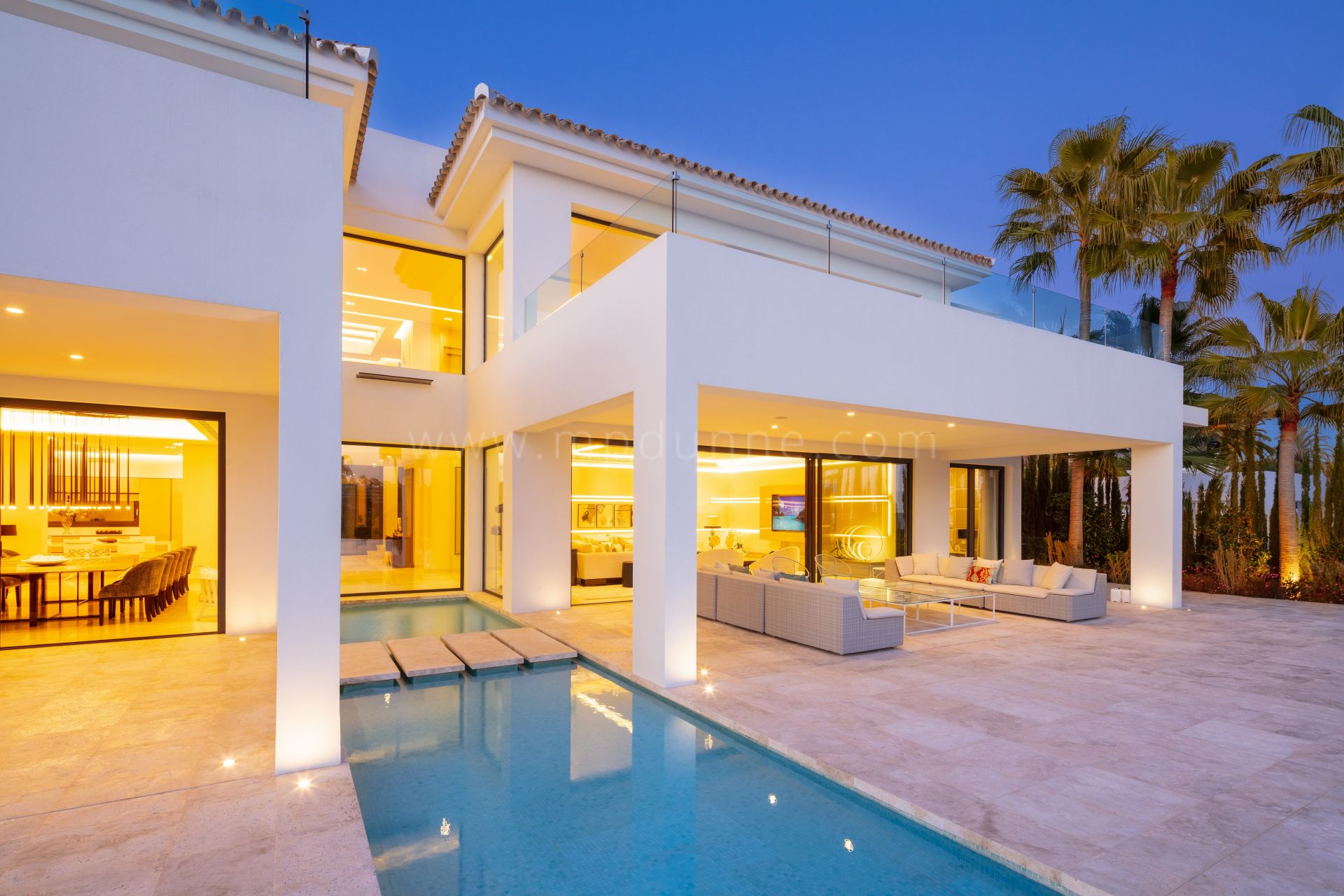 El hall de entrada conduce a una gran sala de estar en planta abierta, que cuenta con un elegante salón con muebles de alta calidad, un imponente comedor y una cocina de última generación. El salón y el comedor tienen acceso directo a las terrazas cubiertas y descubiertas, que cuentan con varias zonas chill-out y de comedor al aire libre, y una piscina infinita.